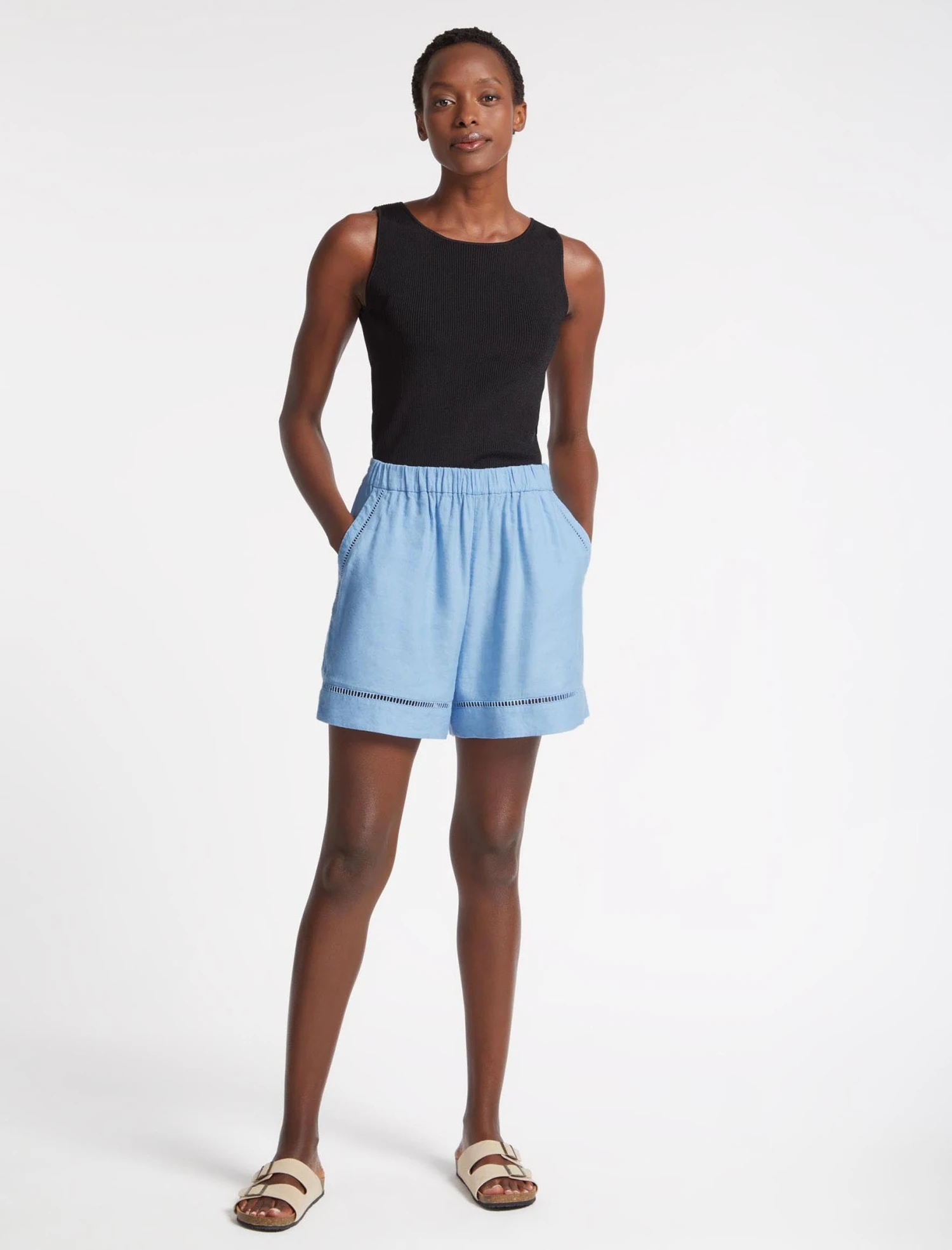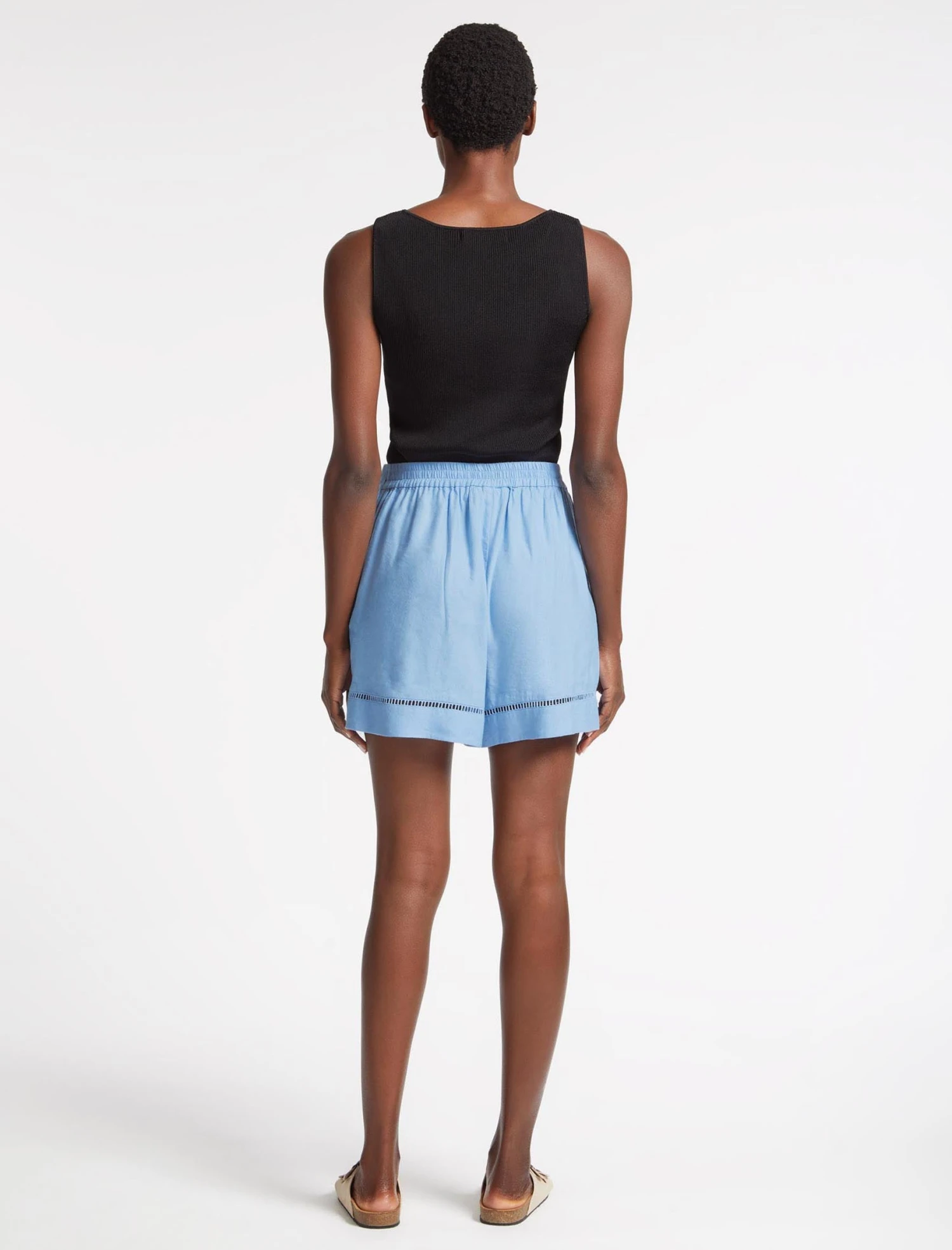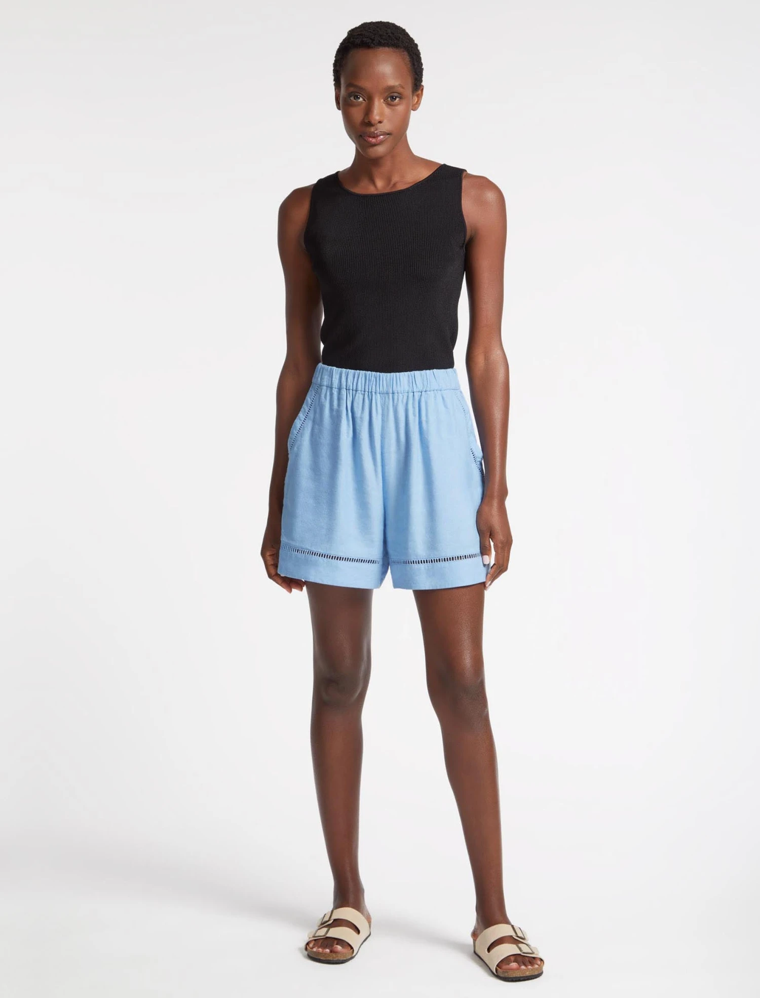 Cut from a machine-washable linen blend (new to the Summer 23 collection) in a blue colourway, our Callie shorts are shaped to a relaxed fit with an easy elasticated waist, side pockets and pretty ladder-trim detailing. With pyjama-style shorts continuing to enjoy their moment in the spotlight, pair it with our matching Callie shirt for bed-to-beach cool.