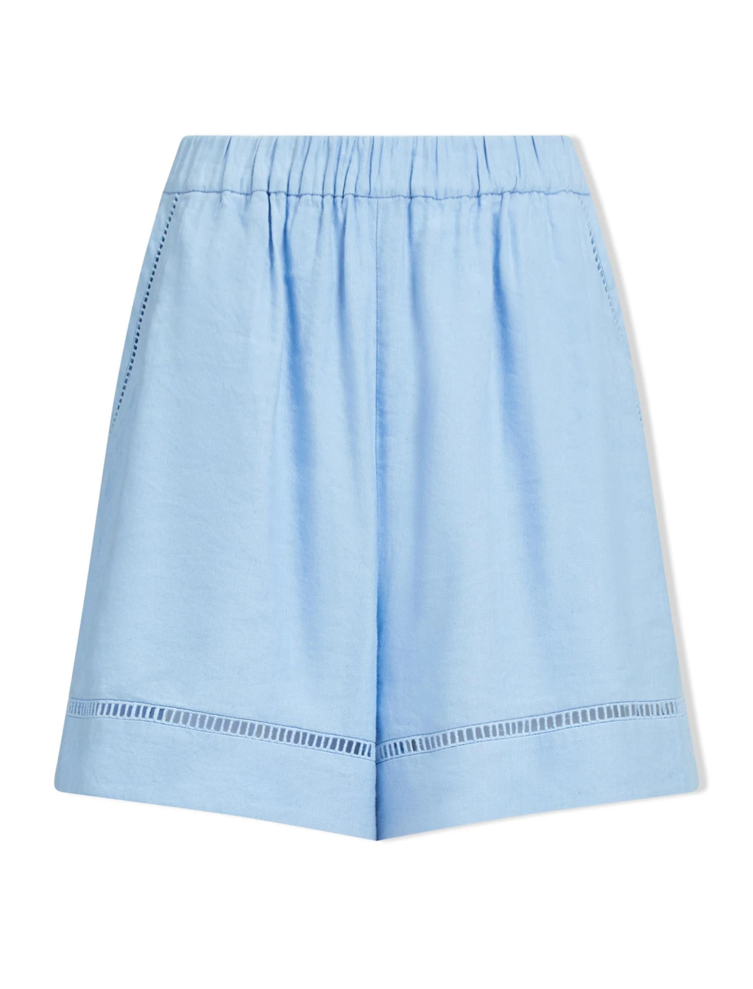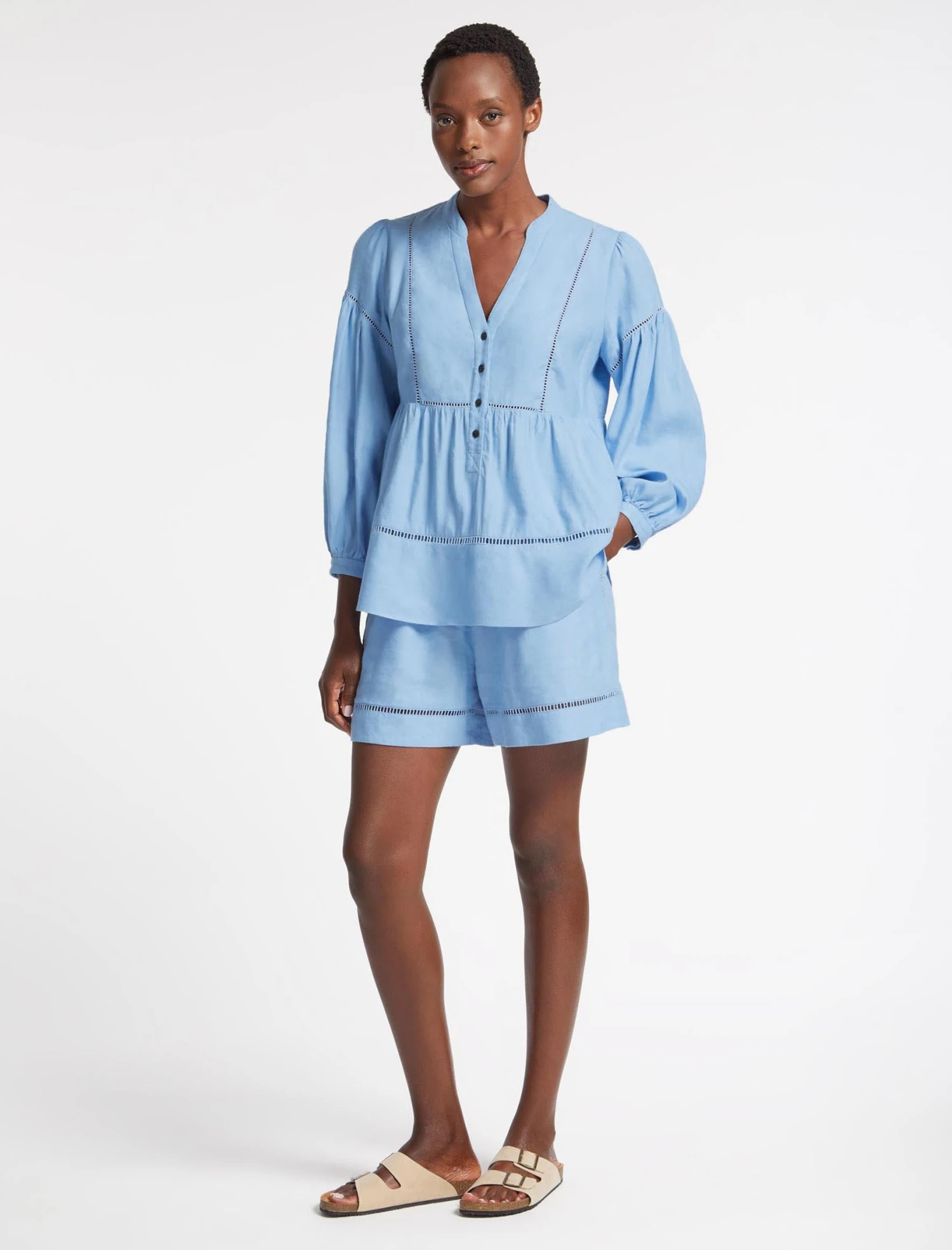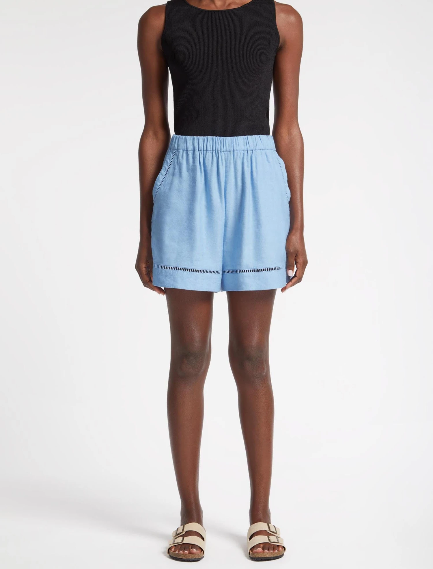 Cut from a machine-washable linen blend (new to the Summer 23 collection) in a blue colourway, our Callie shorts are shaped to a relaxed fit with an easy elasticated waist, side pockets and pretty ladder-trim detailing. With pyjama-style shorts continuing to enjoy their moment in the spotlight, pair it with our matching Callie shirt for bed-to-beach cool.