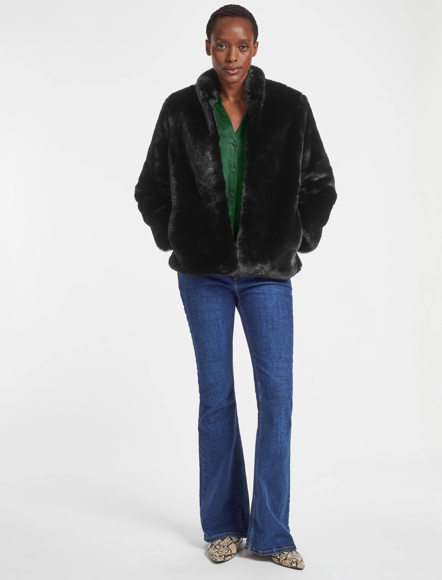 Our cropped faux fur Carly is the ultimate luxe jacket that you can wear every day. The boxy, cropped fit in über-wearable navy looks as good over jeans or tailored trousers in the day as it does teamed with a dress for the evening. Designed with a stand collar, shoulder pads and a hem that falls just below the hips, it creates a flattering silhouette that will keep you warm and chic throughout winter.