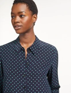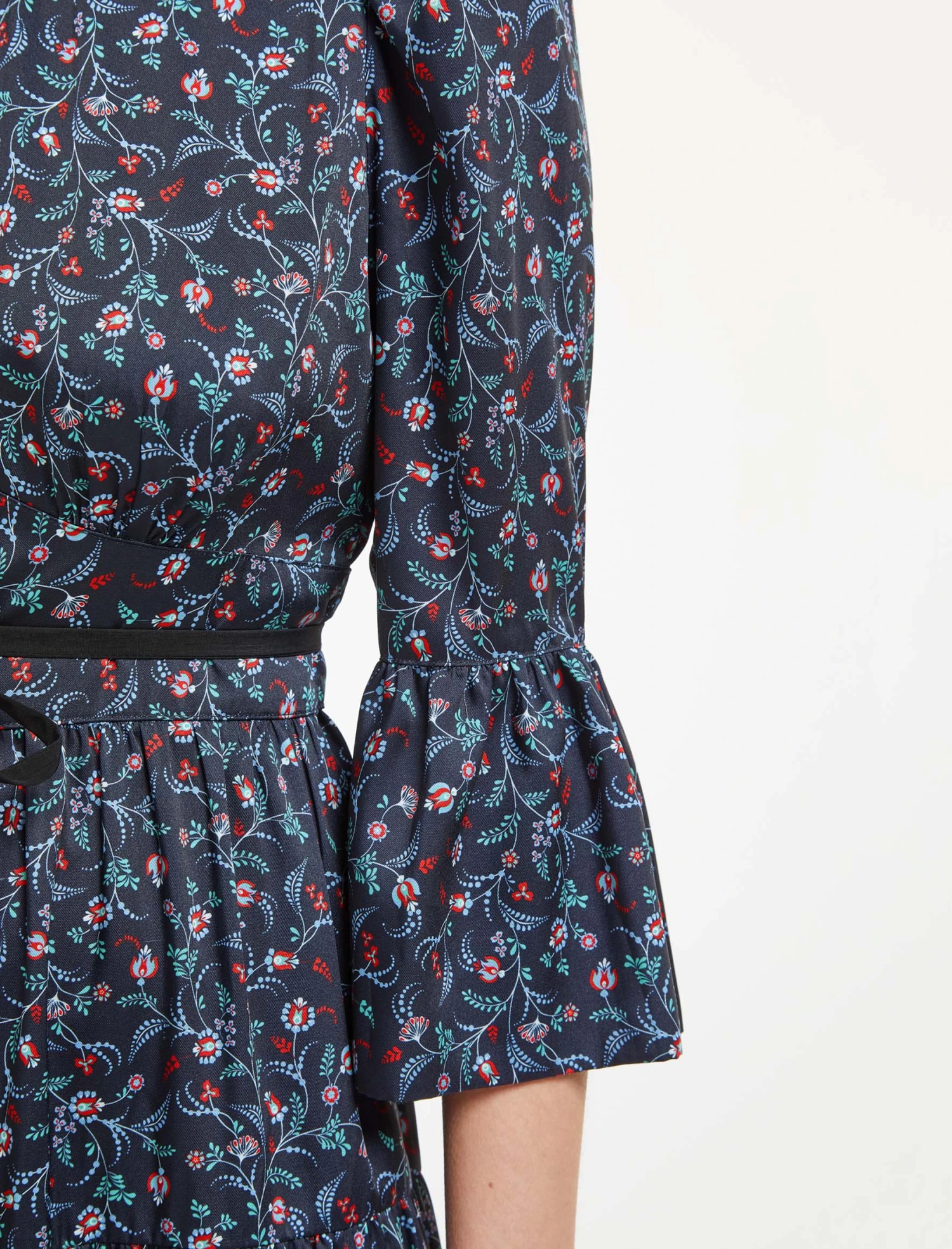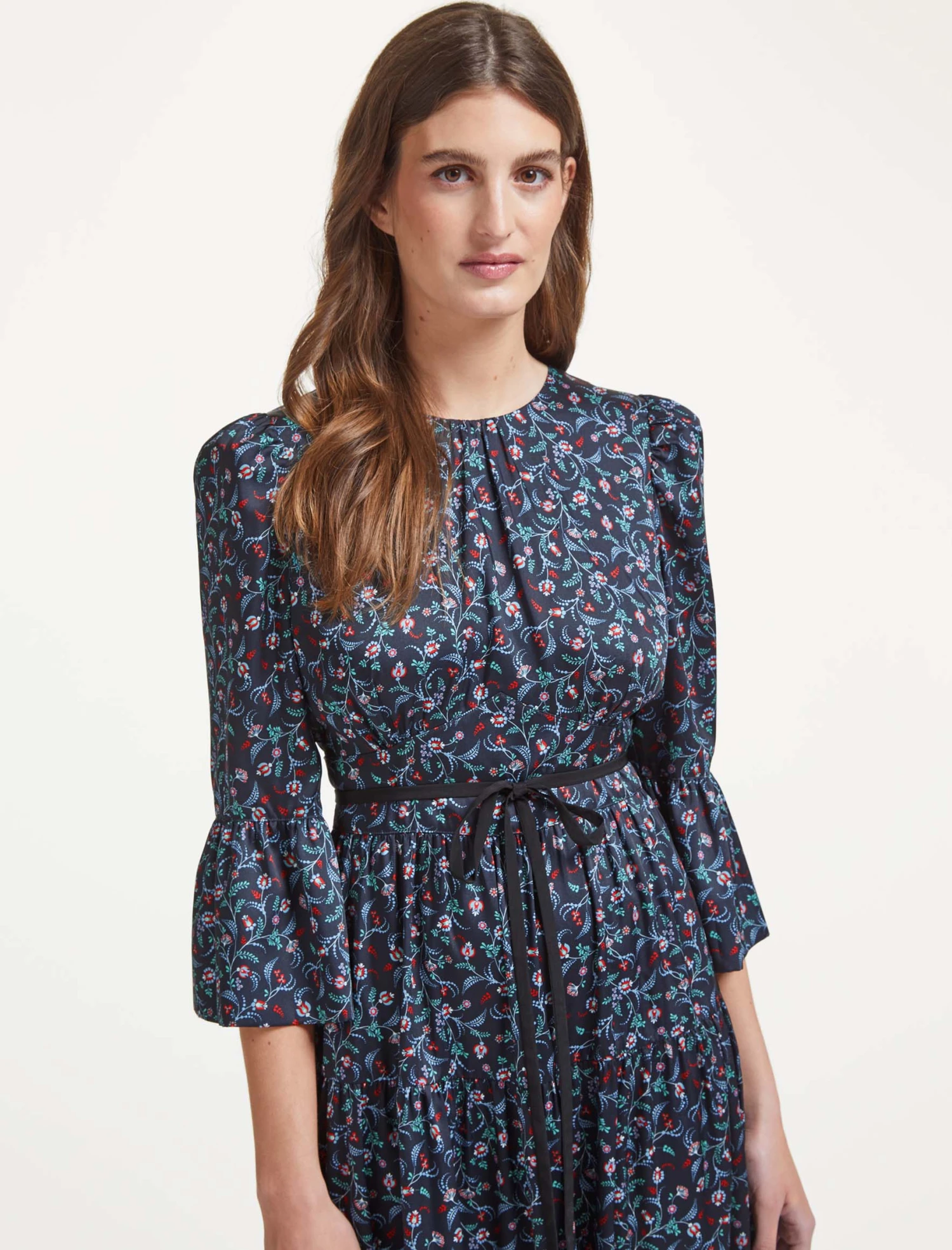Enlivening wardrobes with its pretty navy blue trailing floral print, our romantic Cordelia dress is made from a lightweight, shimmery recycled twill. The gathered shoulders, wide waistband and slim sash accentuate the waist (tied at the front or back), before falling into a loose, softly tiered skirt. A perfect all-occasion dress, toughen it up with an ankle boot and a bold red lip or keep it classic with a slimming heel.
