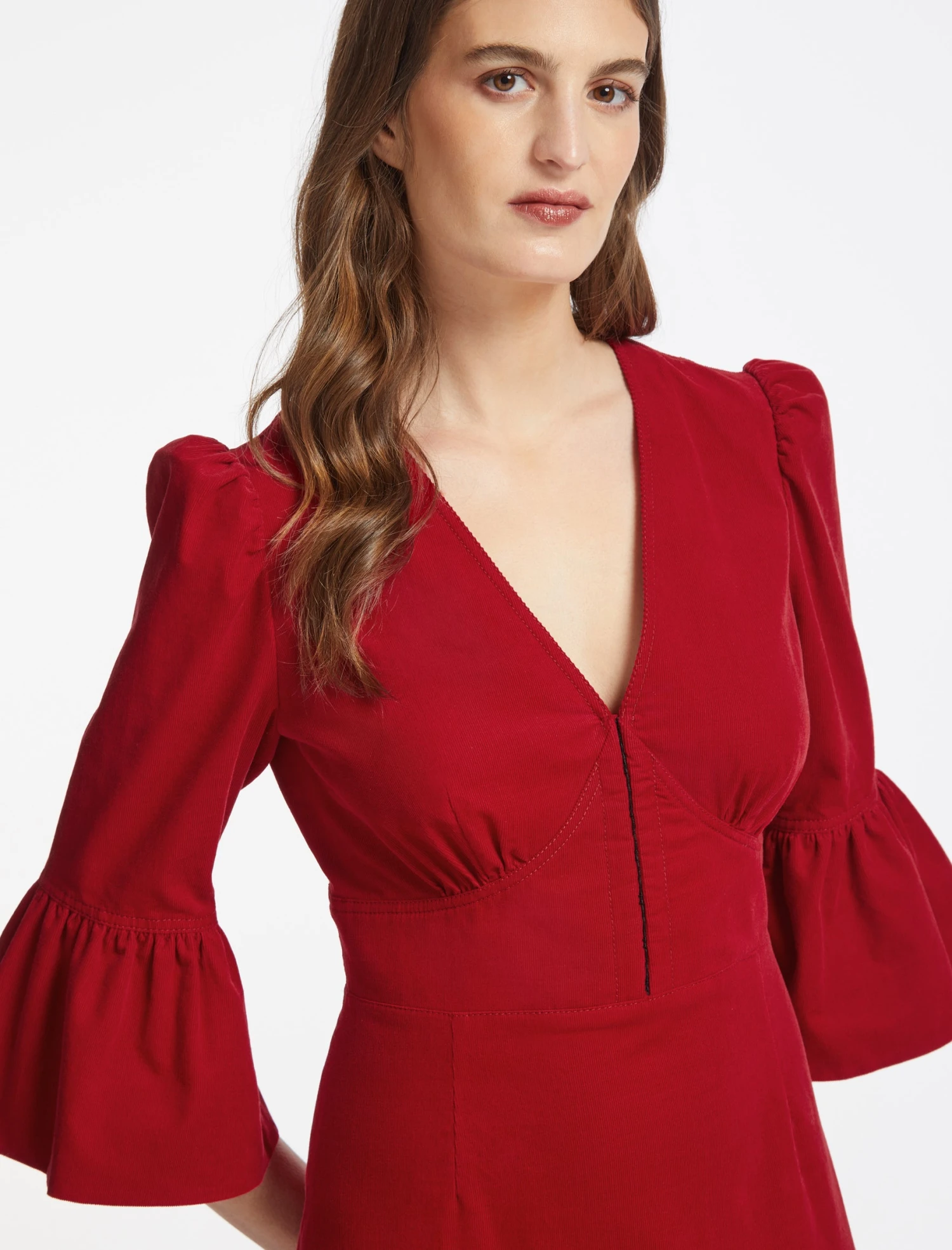 - Fitted to bust and waist, loose over hips with 3/4 length fluted sleeves.