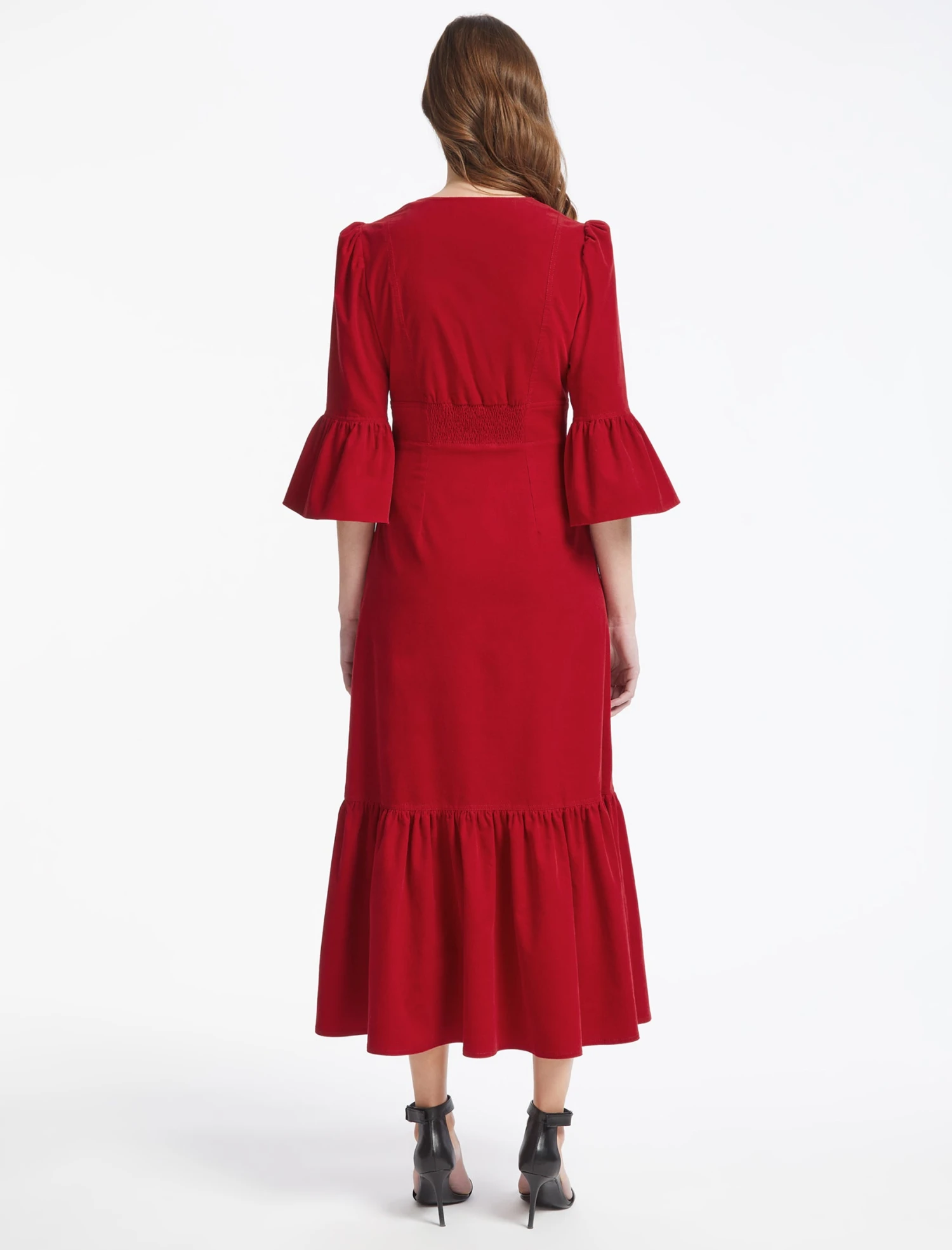 Our sell-out Daphne dress is a multitasking closet hero. Designed in our soft cotton pin corduroy – which has the look and feel of velvet. A modern spin on Victoriana style, our Daphne dress has figure-flattering hook-and-eye corsetry, pretty gathered detailing and a full peplum skirt. Shaped to an easy fit through the hips with elasticated shirring at the back, it will see you through events and parties in effortless style.