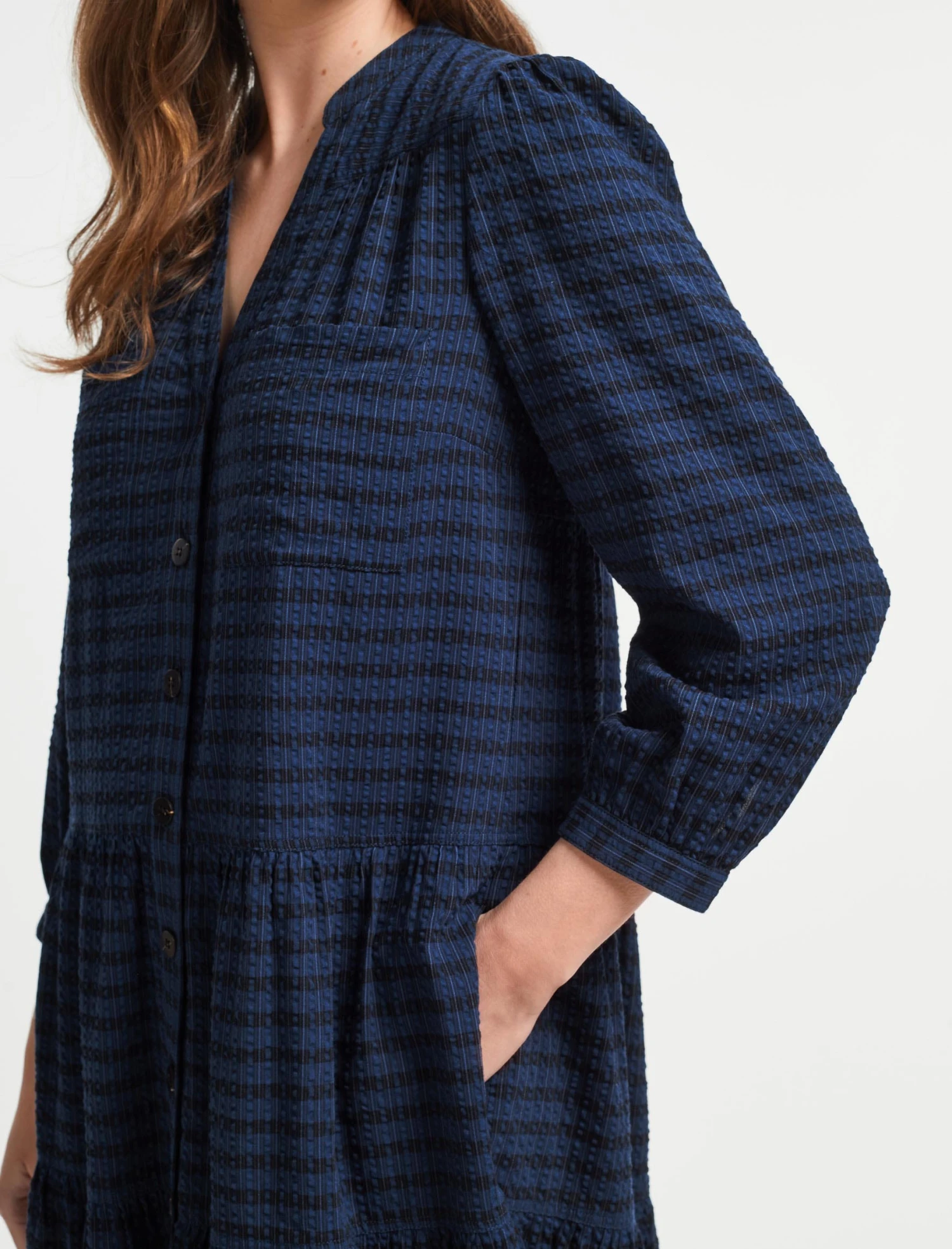 The ultimate in easy, everyday style, our loose-fitting Delaney dress will keep you looking (and feeling) cool right through to autumn. Made from our organic cotton-blend navy and black seersucker, the flattering V-neck, dipped hem and gathered detailing give it a feminine spin. Pair with your favourite trainer or sandal, just add some sunshine.