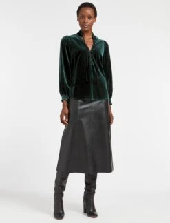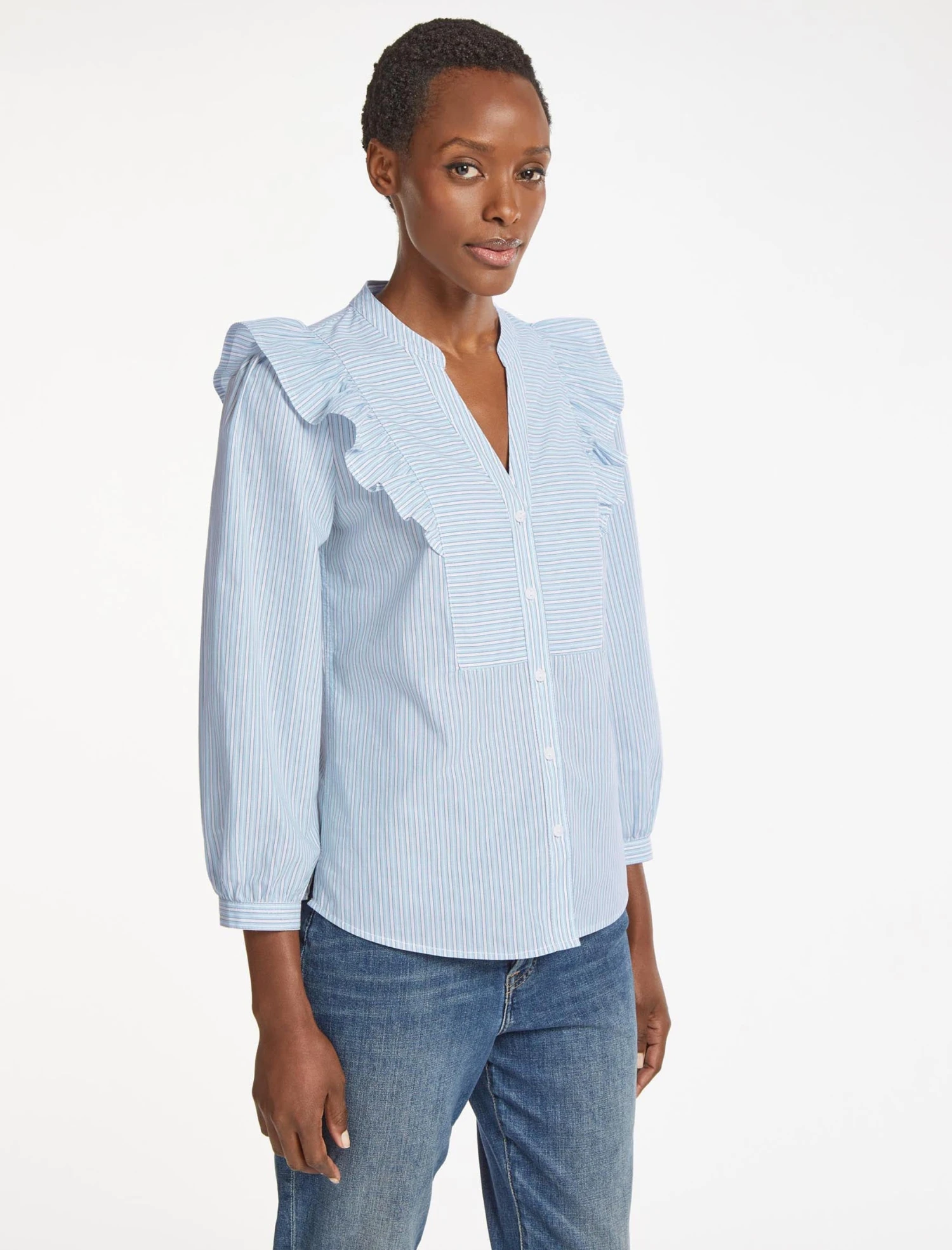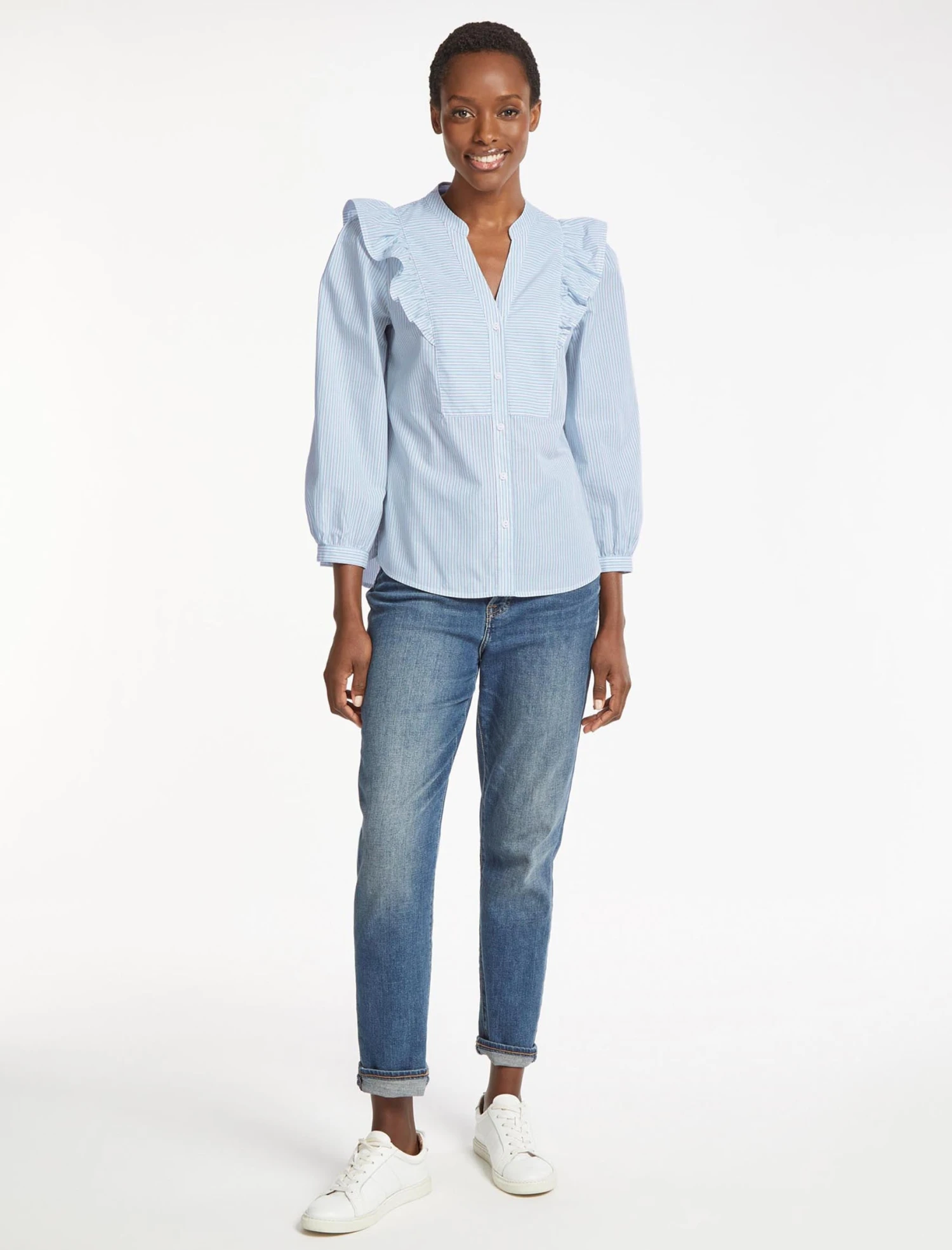 Designed in our new organic cotton, we’ve reworked our ever-popular Dixie shirt in white and blue stripes. The V-neck, frills and bib lend simple summer separates like the denim cut-off or a navy chino a feminine charm.