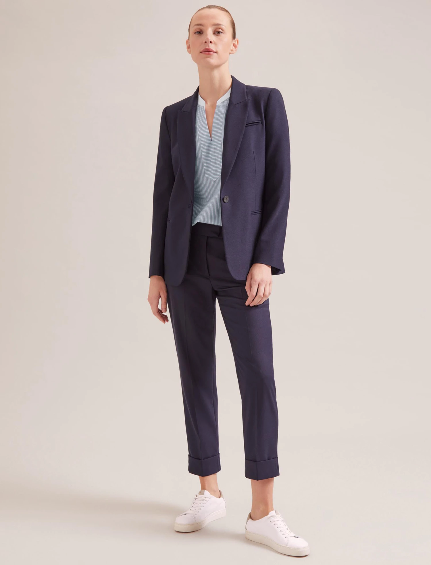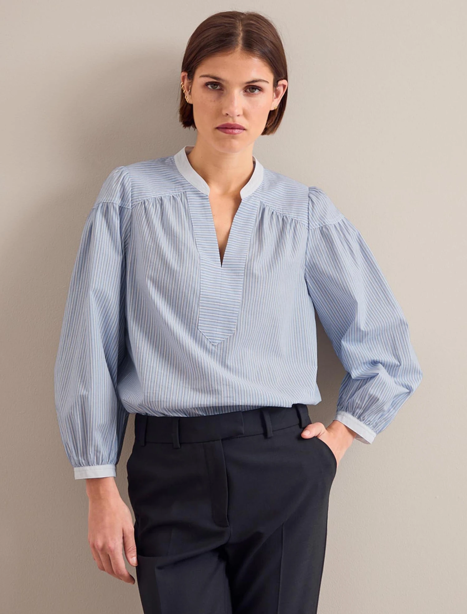 Cotton shirting comes into its own in spring. Lightweight, breathable and fresh, our new pin-striped Erica shirt features a flattering cutaway neckline, gathered detailing on the shoulder yoke and white trims on the collar and cuffs. Contrast the organic cotton with our glossy leather Tiana skirt or blue denim.