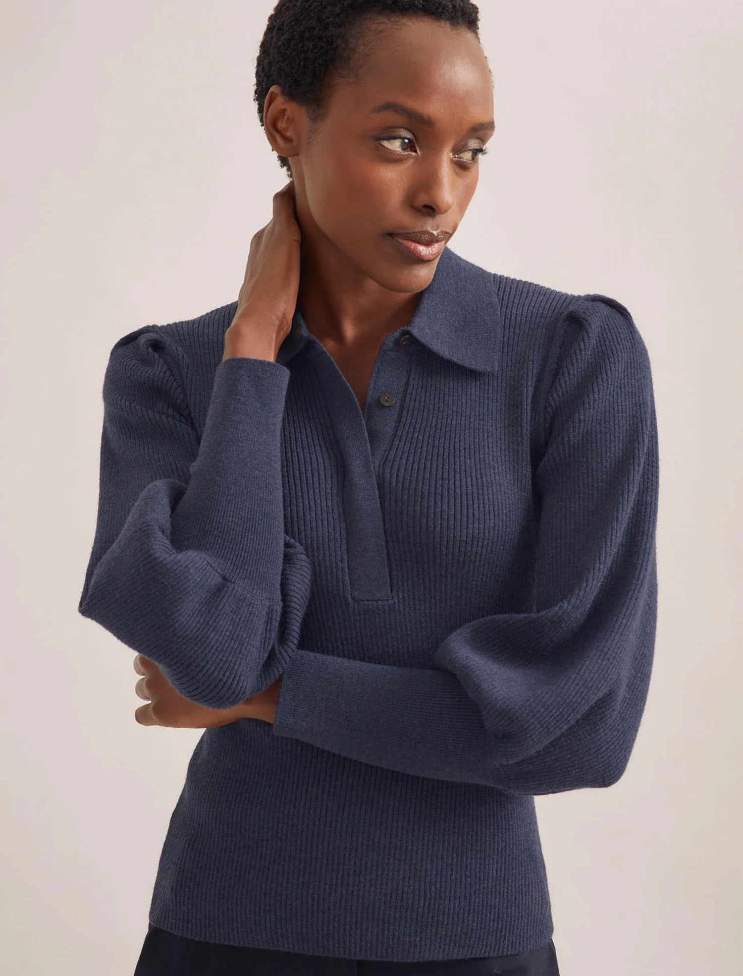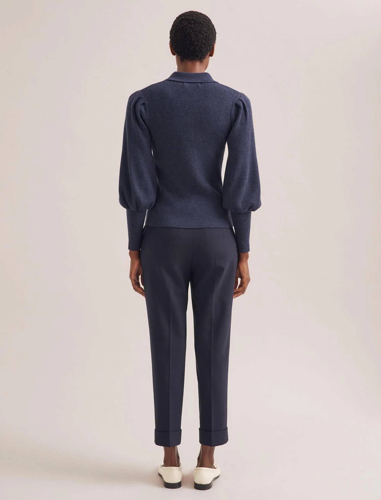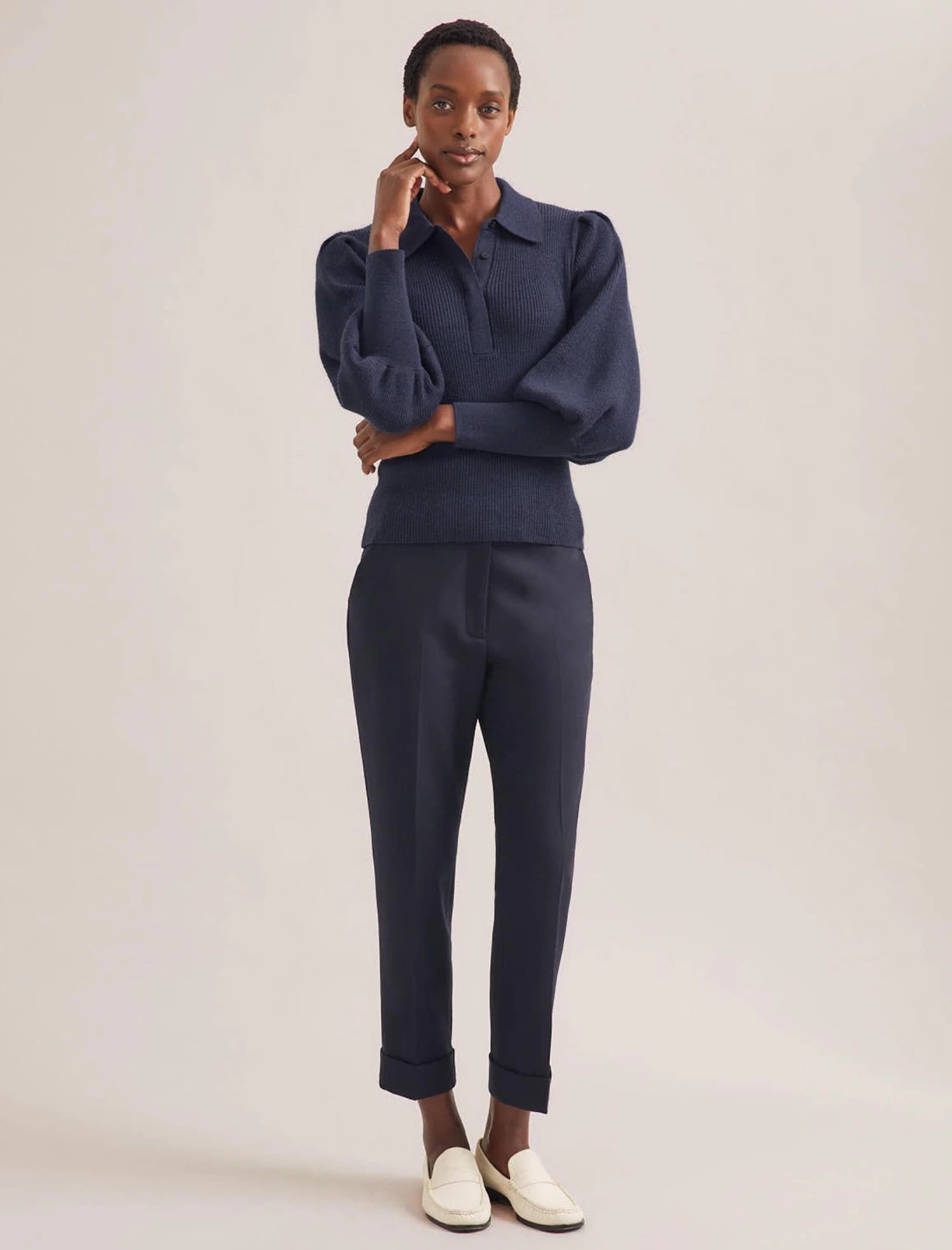 We’ve reworked our hero Eva top for FW23 with a polo-style neckline for effortless versatility. It’s designed in a soft merino-wool rib with added stretch to create a slimming silhouette, while the fitted cuff blouson sleeves add shape and volume. The perfect knit for when you want to feel pulled together, wear it with our leather Tiana skirt or any of our tailored trousers.