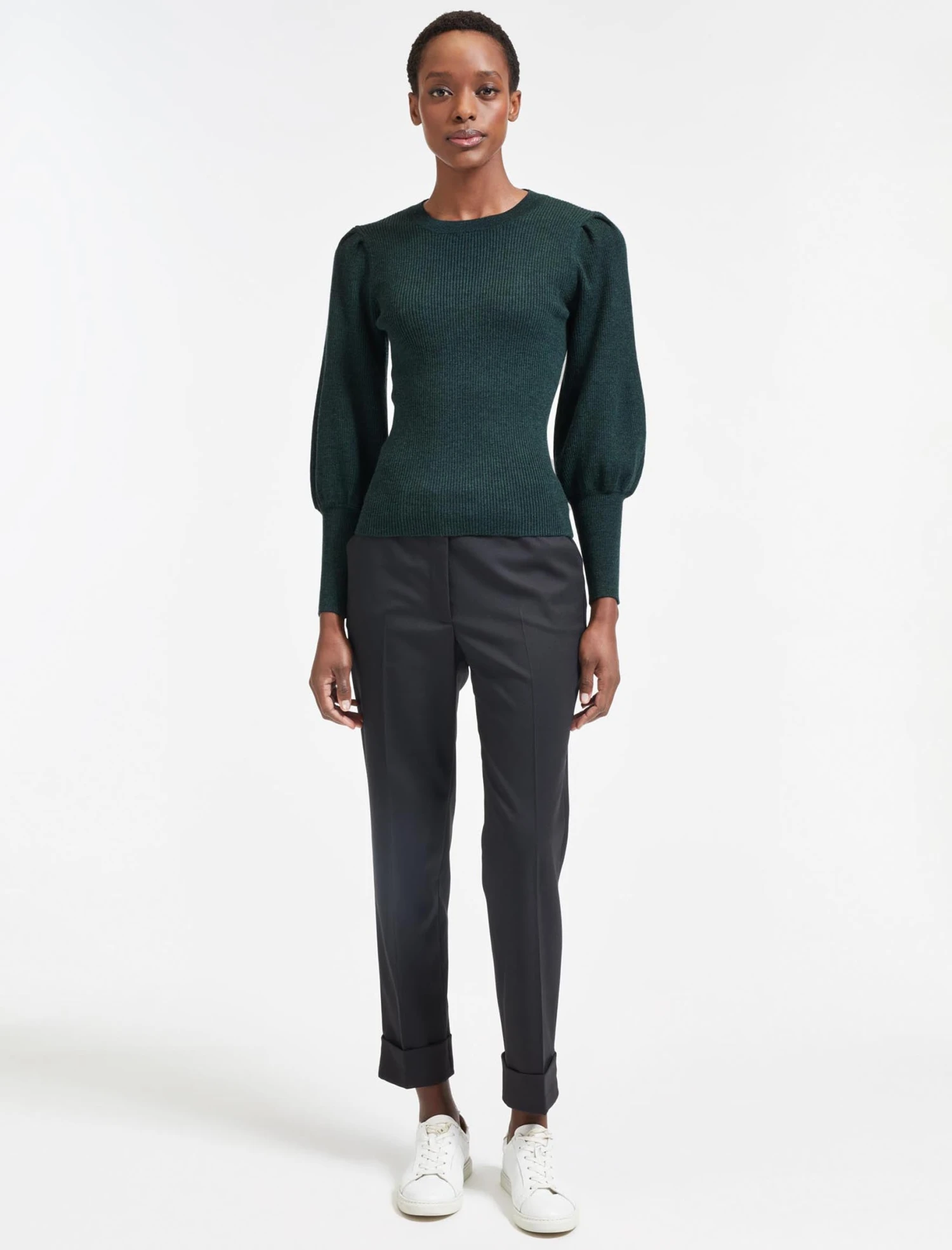 We’ve reworked our hero Eva style with a classic crew neckline for effortless versatility. The merino rib creates a slimming silhouette, while the fitted cuff blouson sleeves add feminine shape and volume. The ultimate pulled together knit, the Eva is the perfect alternative to a jacket and shirt. Wear with our leather Tiana skirt or any of our tailored trousers.