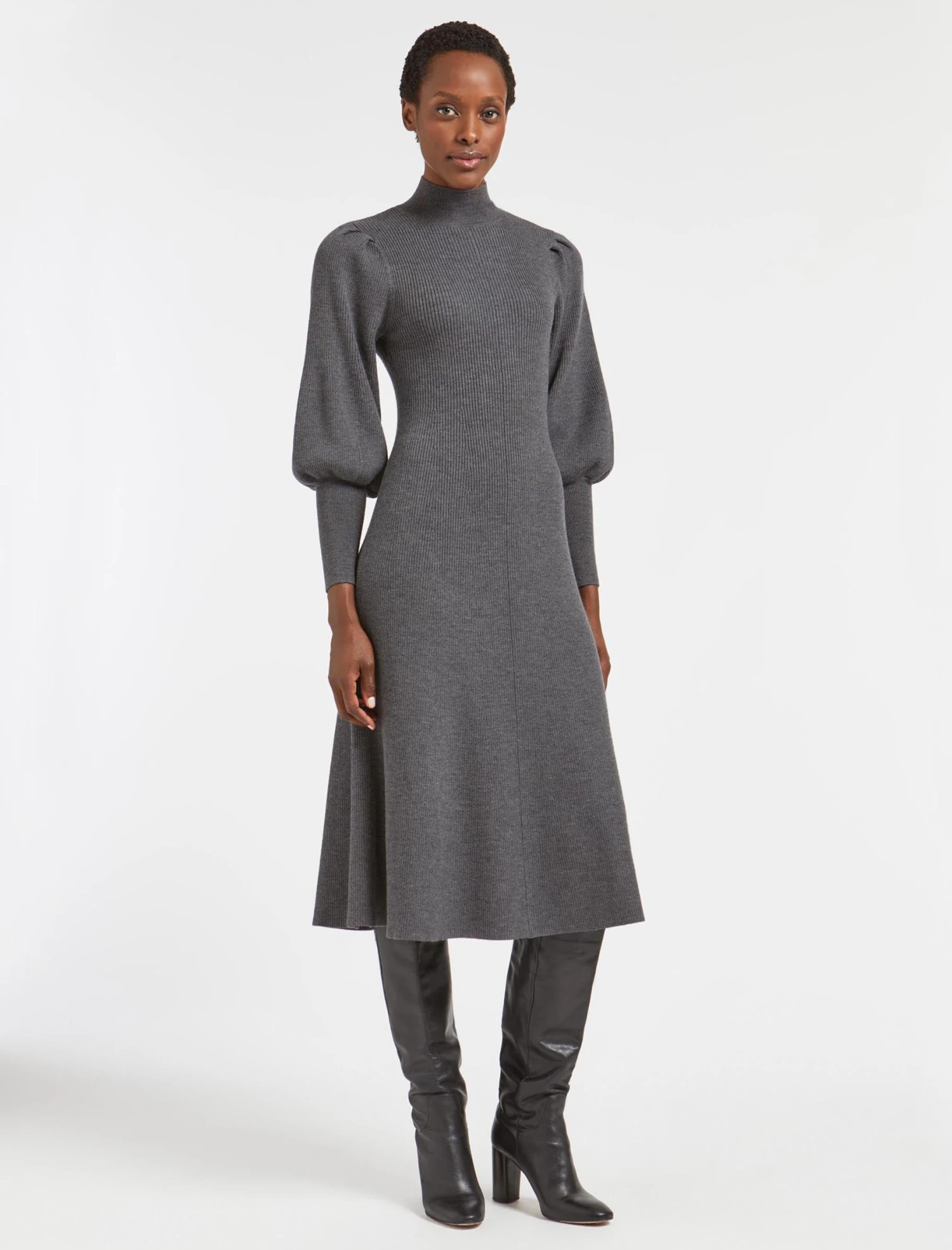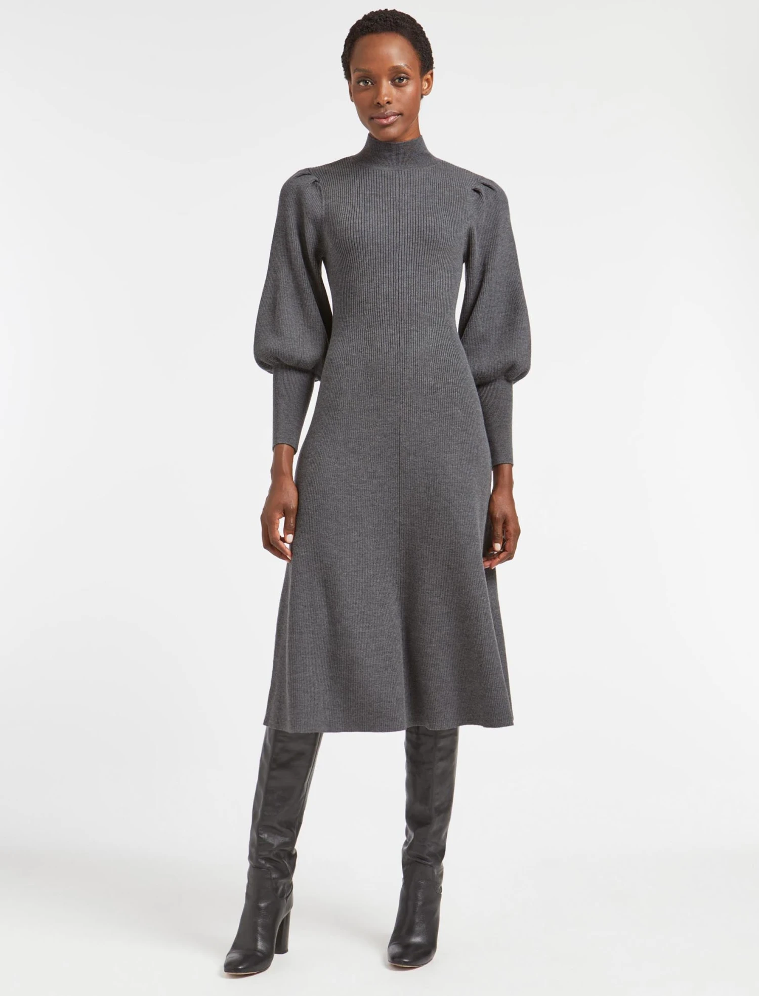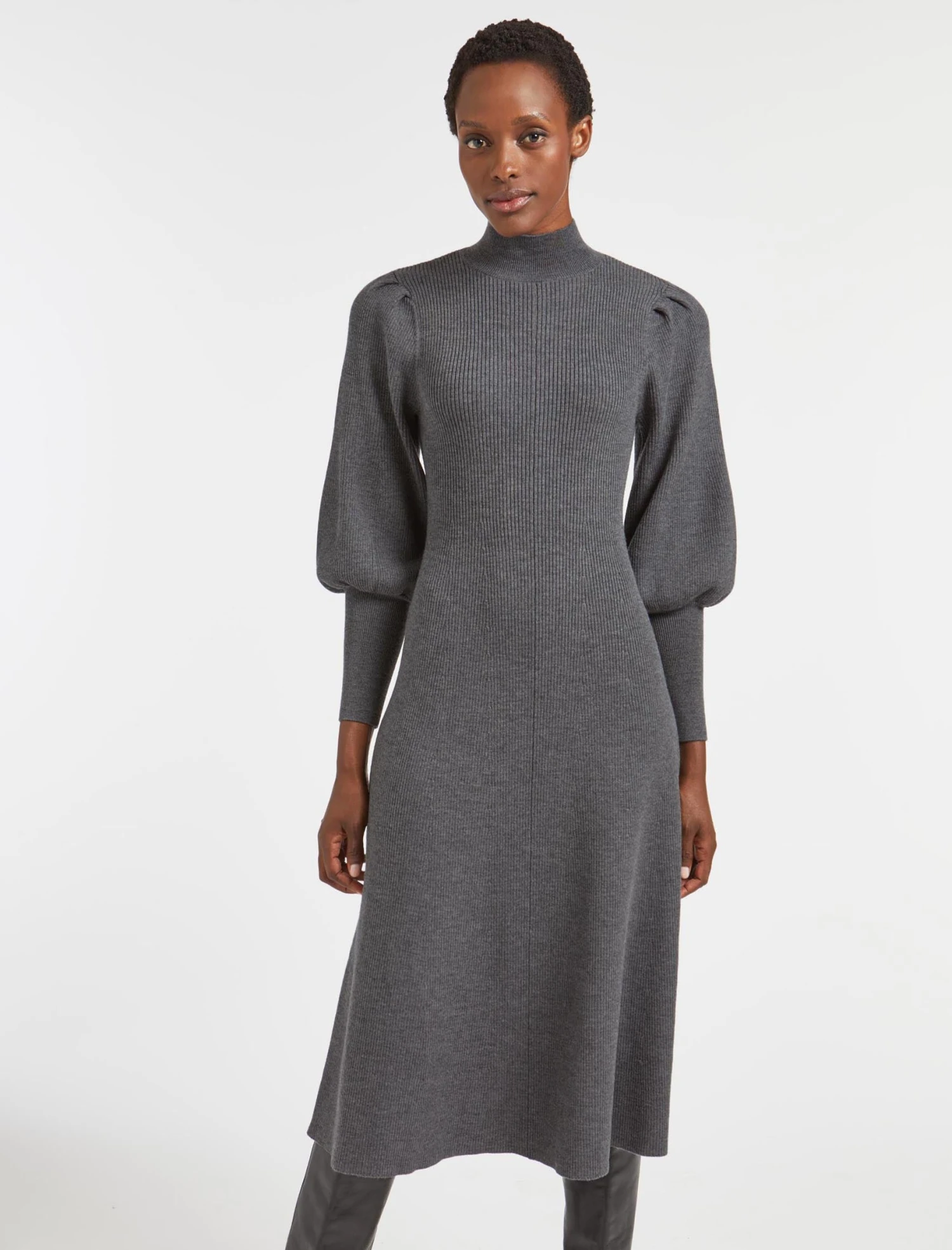 Neatly blending comfort and style, rib-knit dresses are having something of a moment this season. Enter Eva, our hero shape, which is designed in a heavy (non-mulesing) merino-wool blend. This form-fitting style has gentle shaping through the bust and waist before falling into a flared skirt. The funnel neck, blouson sleeves and pleated shoulder detailing add interest to this one-stop daywear staple.