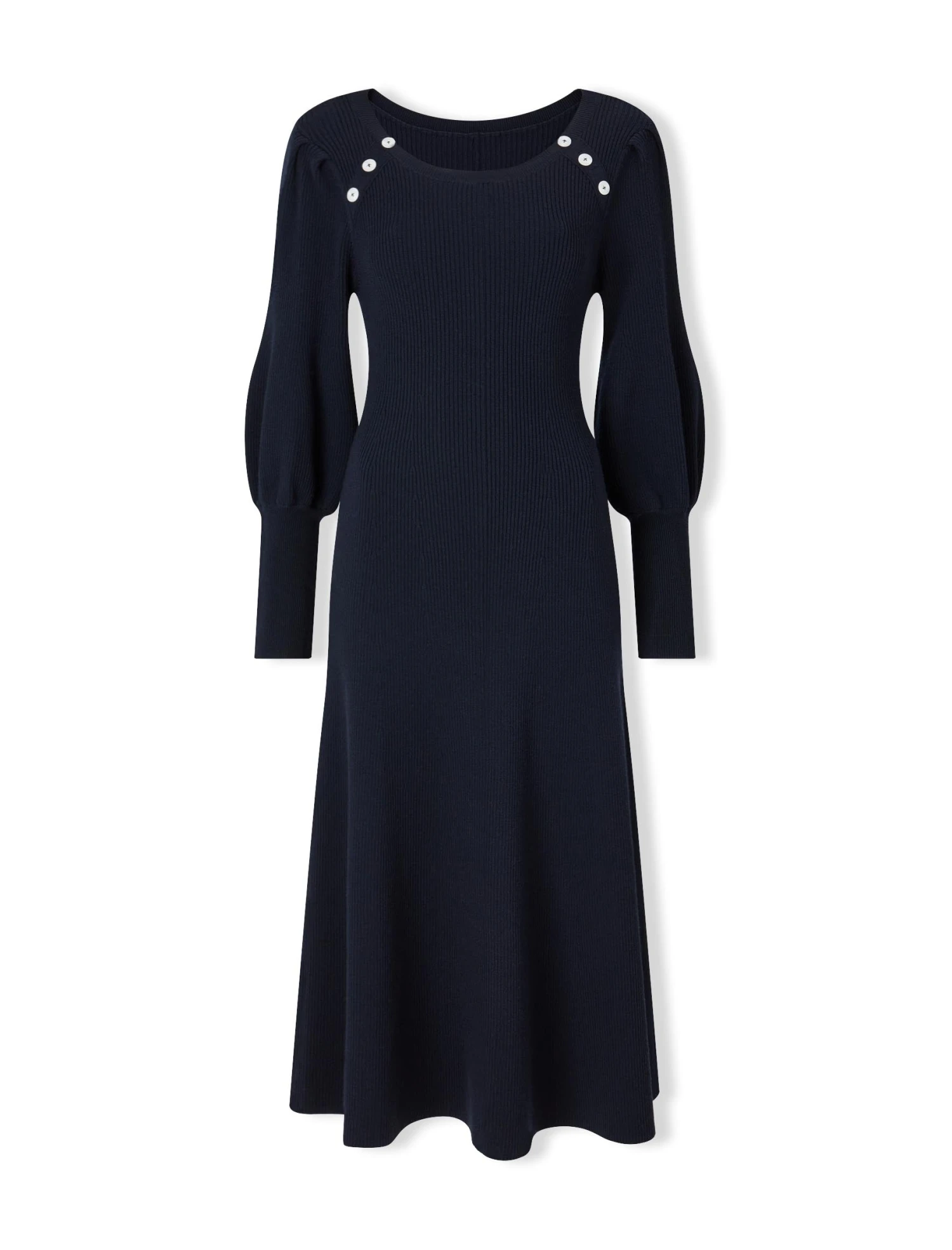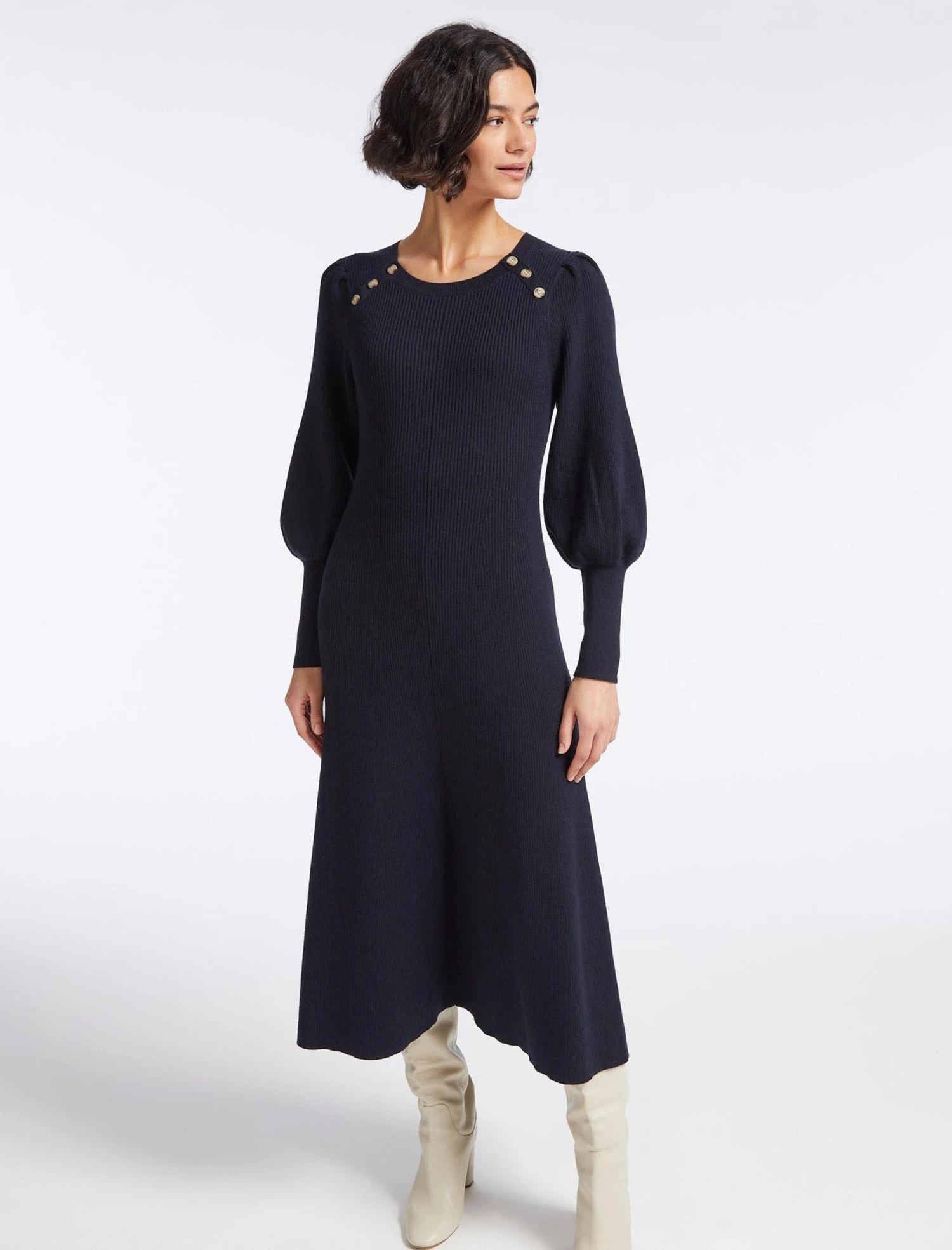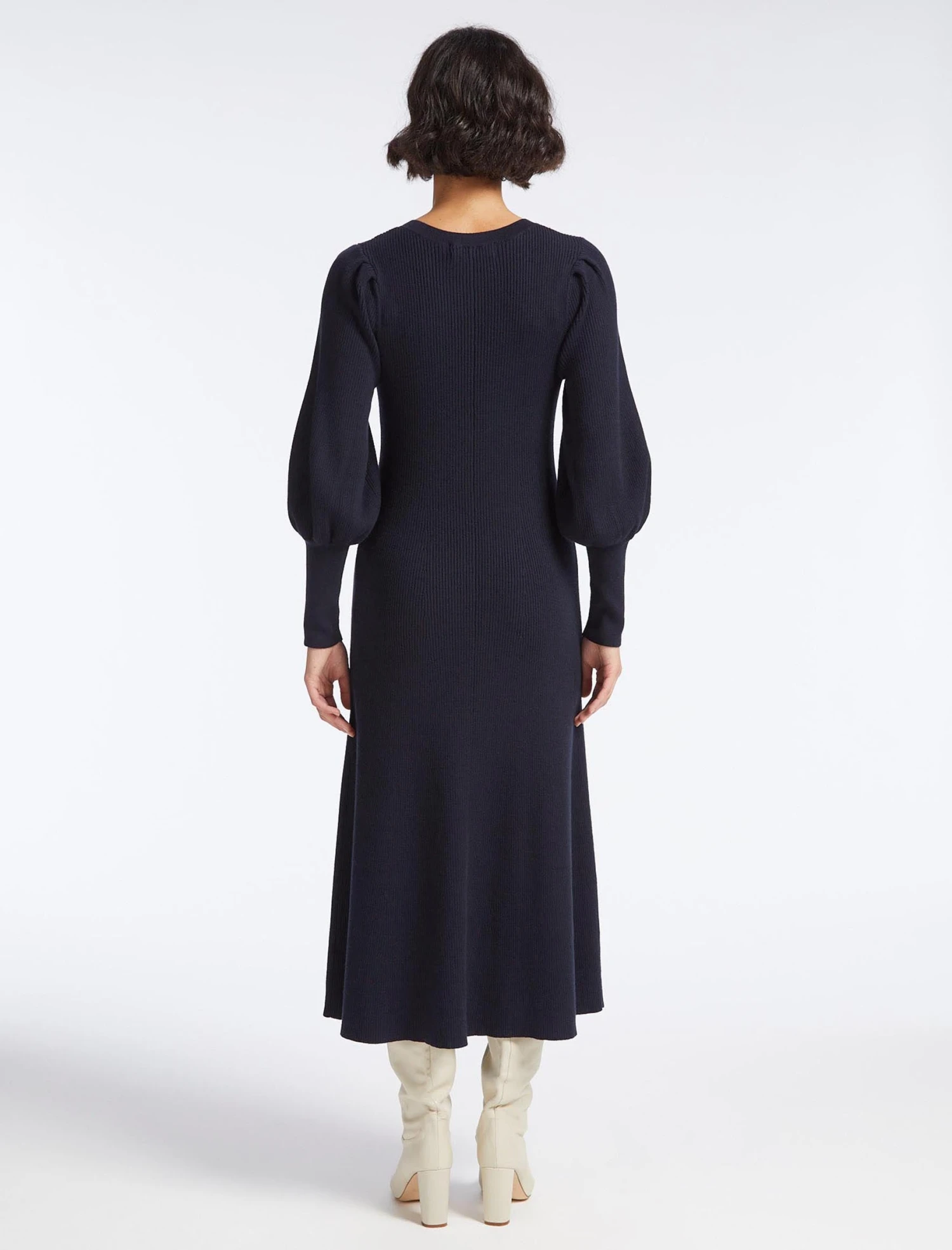 Ribbed knit dresses are continuing to enjoy their moment in the fashion spotlight. Figure-flattering, warm and endlessly wearable, the blouson sleeve, contrast ribbed cuff and shoulder summary detailing give it a contemporary edge. Cut from a lighter weight cotton-and-merino-wool blend, it will see you through spring and beyond.