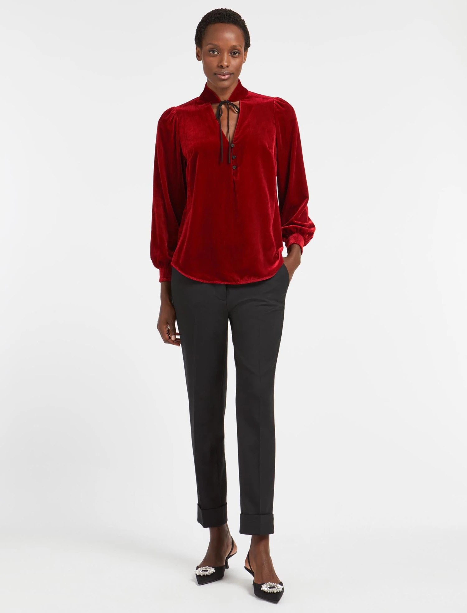 Designed in rich jewel tones that will look chic year after year, our Jacquetta blouse features feminine touches including the pretty long shirred sleeve and rouleaux summarys. The necktie can be worn loose and turned down or tied as a choker, depending on your mood. Get the party started with a leather skirt or tailored trouser and a killer heel.