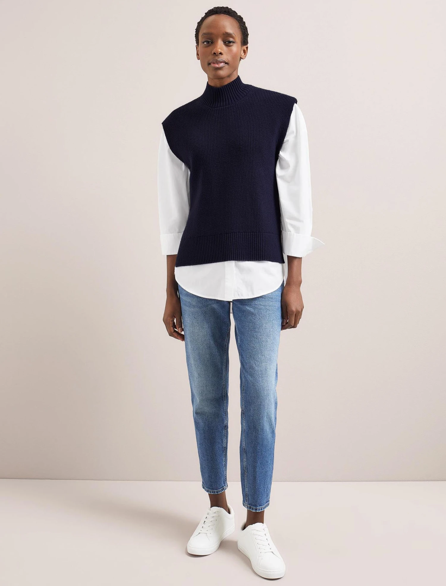 Our hero Janice sleeveless jumper is the ultimate on-trend layering piece for your spring wardrobe. Throw on over a dress, blouse or shirt to stay warm without hiding a pretty sleeve or wear over a tee on summer days. It’s also brilliant under a jacket as it’s not bulky and you don’t need to worry about sleeve bunching. The longer length and dipped hem create an elegant shape plus it’s machine washable too – what’s not to love?