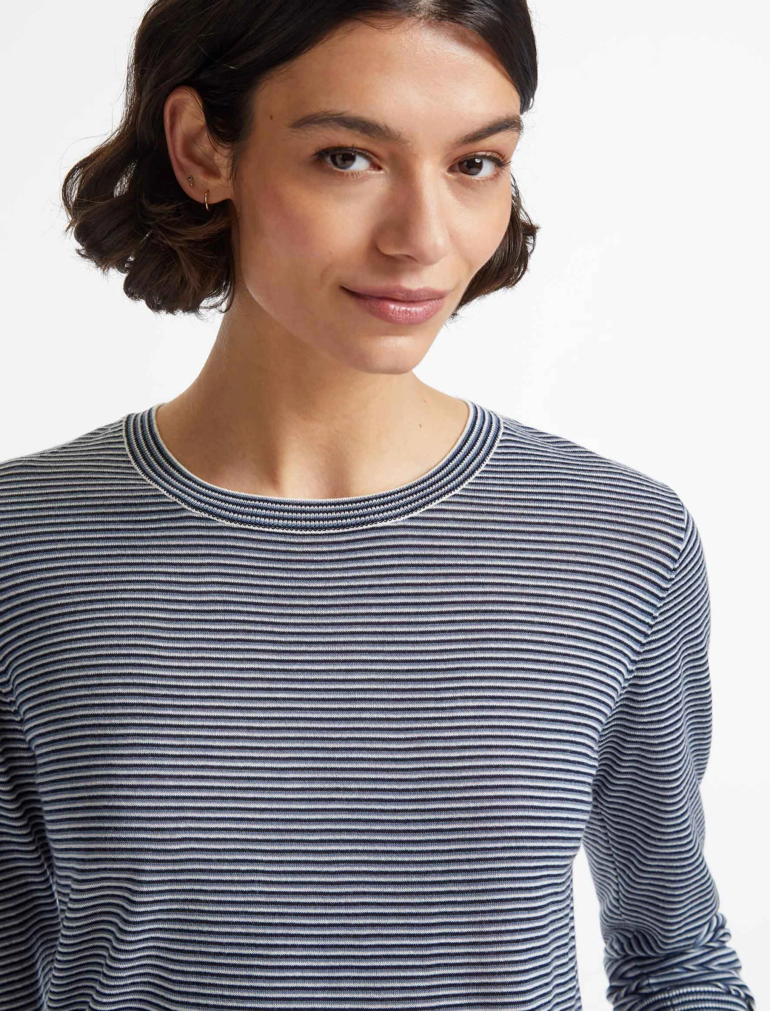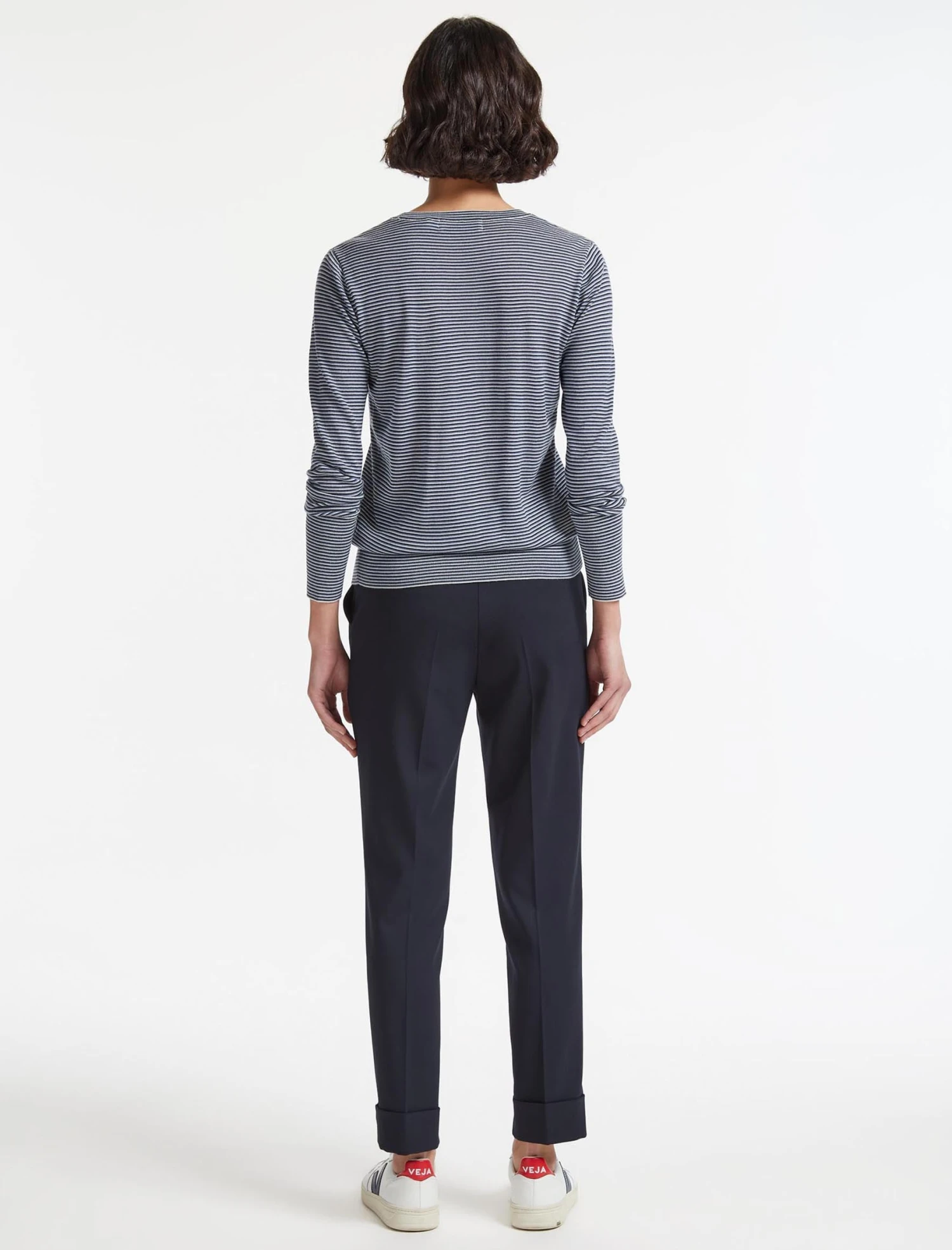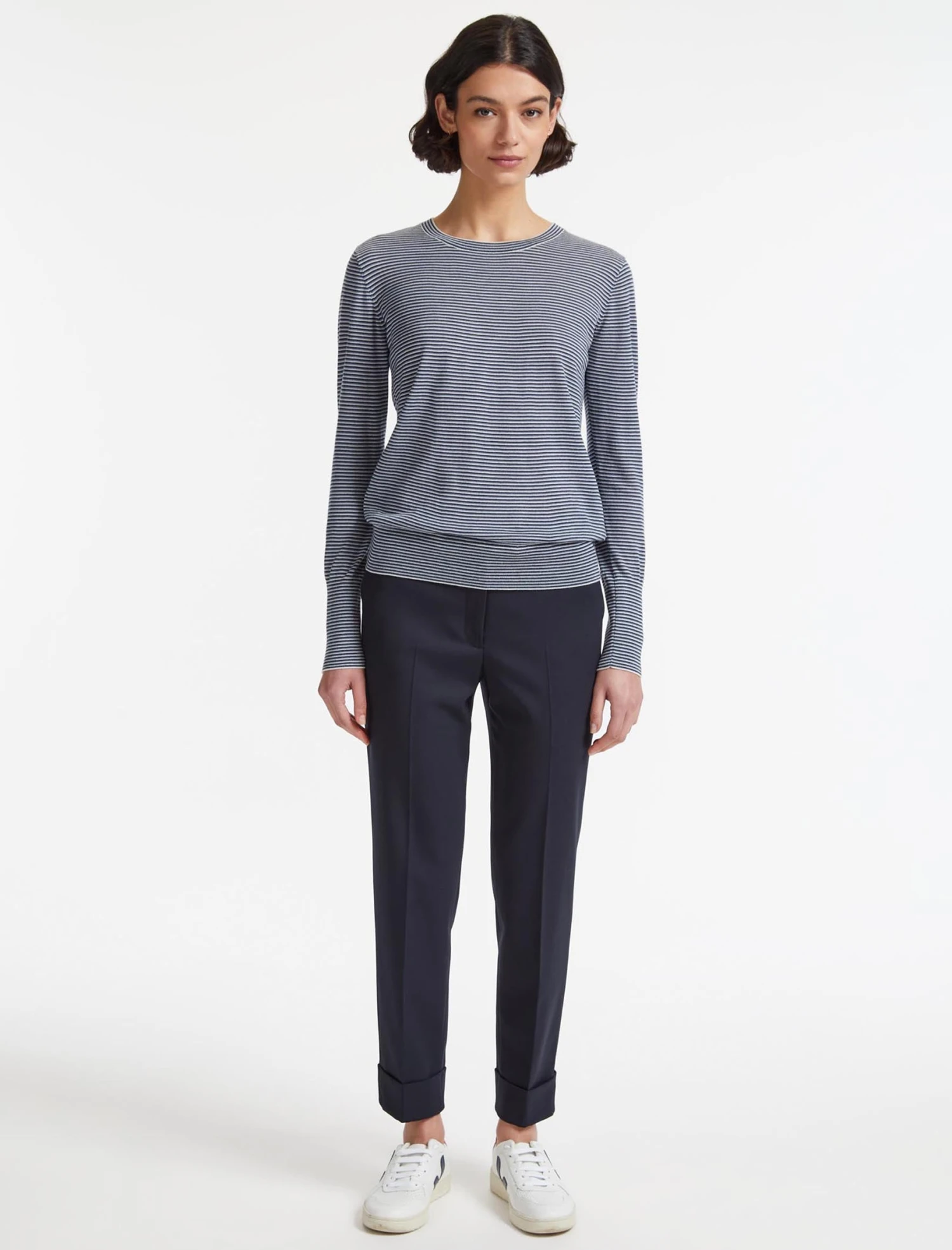Let’s face it, you can never have enough lightweight summer knits – especially with the unpredictable British summer! Jodi is designed in a navy blue fine-gauge, cool merino wool woven with an on-trend stripe. Timelessly chic, it pairs well with our neutral Techni-Linen collection (Hayden or Tate wide-legged trouser or Lyla skirt) but is endlessly versatile. Wear it on relaxed summer days whether in the city or country or throw it on over a swimming costume and denim cut-offs on the beach.