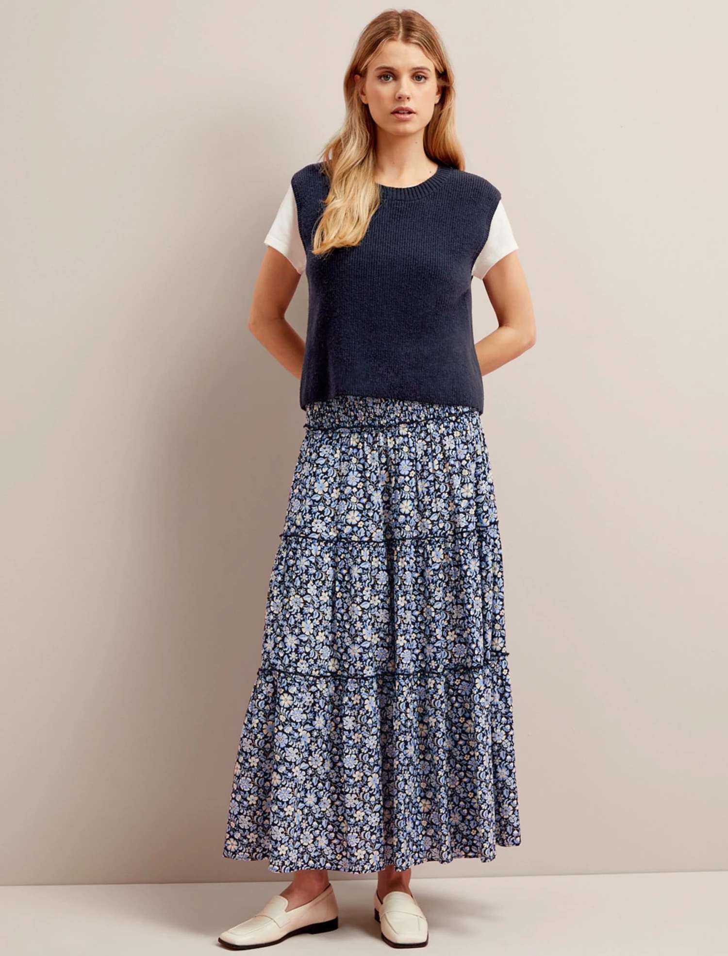 A versatile and lightweight alternative to our winter vest knits, Julie is designed in a cotton-and-merino blend that’s soft to the touch and cool on the skin. The wider shoulders and boxier fit mean it can be worn alone or layered over a T-shirt, crisp shirt or silky blouse.