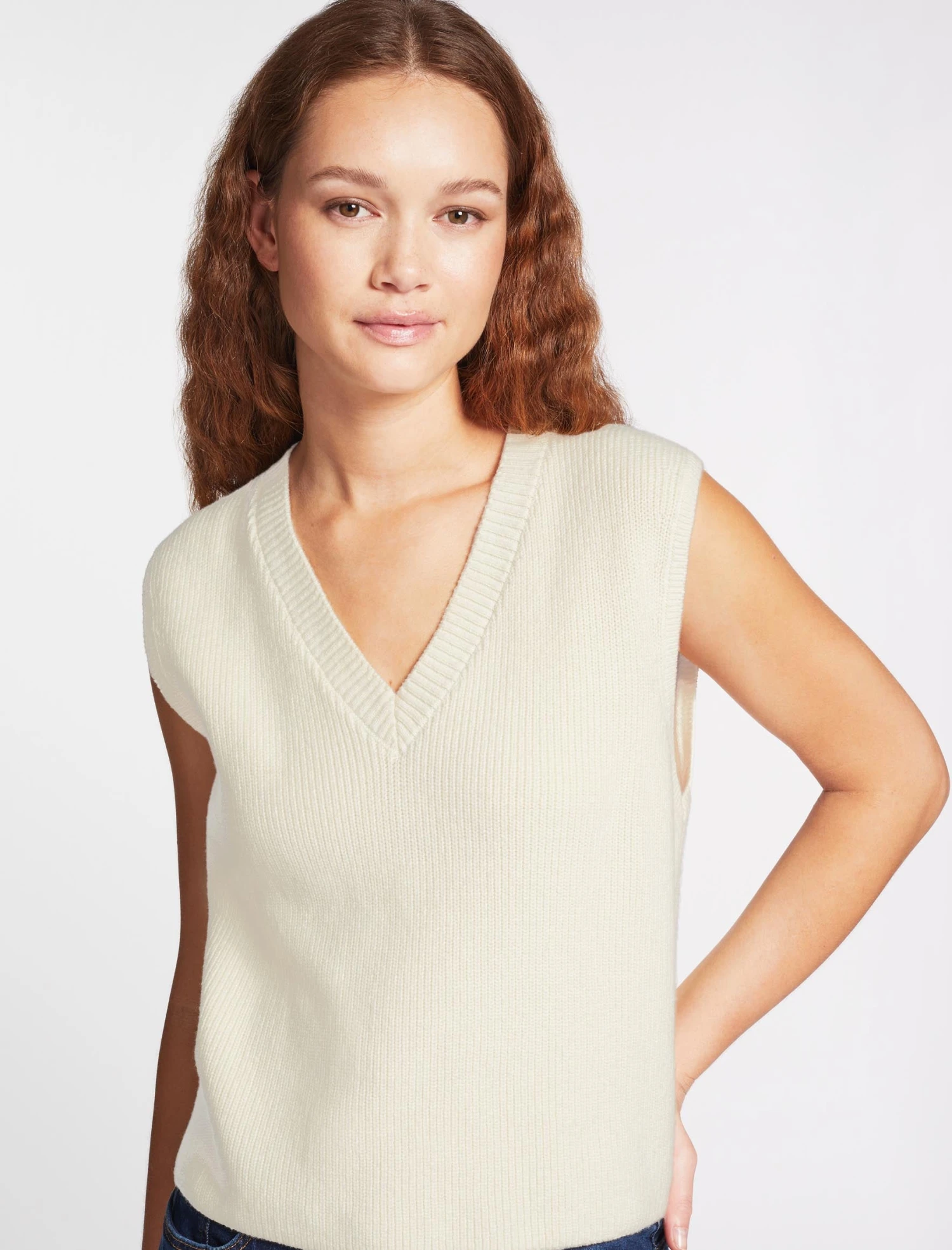A multitasking and lightweight alternative to our winter vest knits, Julie is designed in a cotton-and-merino blend that’s soft and cool on the skin. The wider shoulders, V-neck and boxier fit mean it can be worn alone or layered over a T-shirt such as Madison with our skirts – cue Sierra and Sidney or our Hayden trouser.