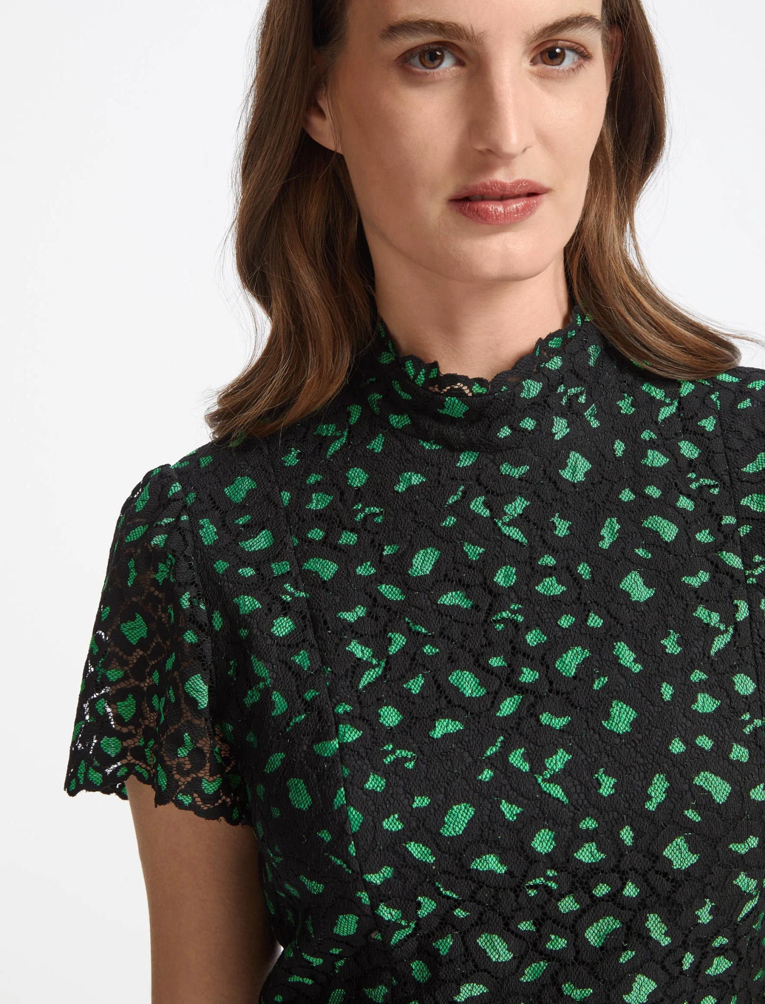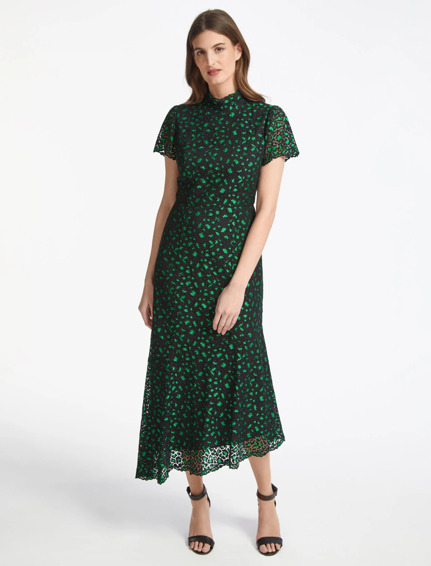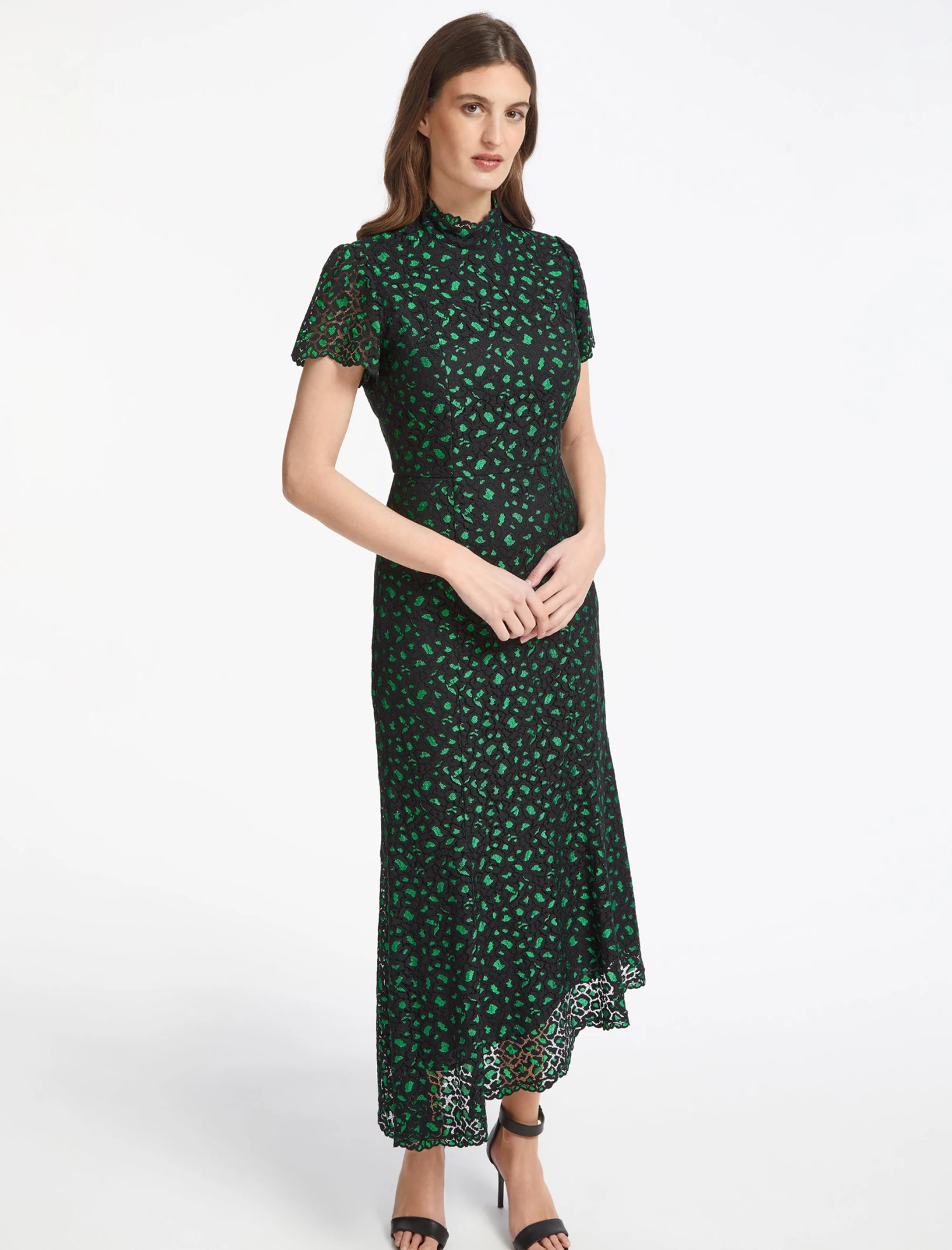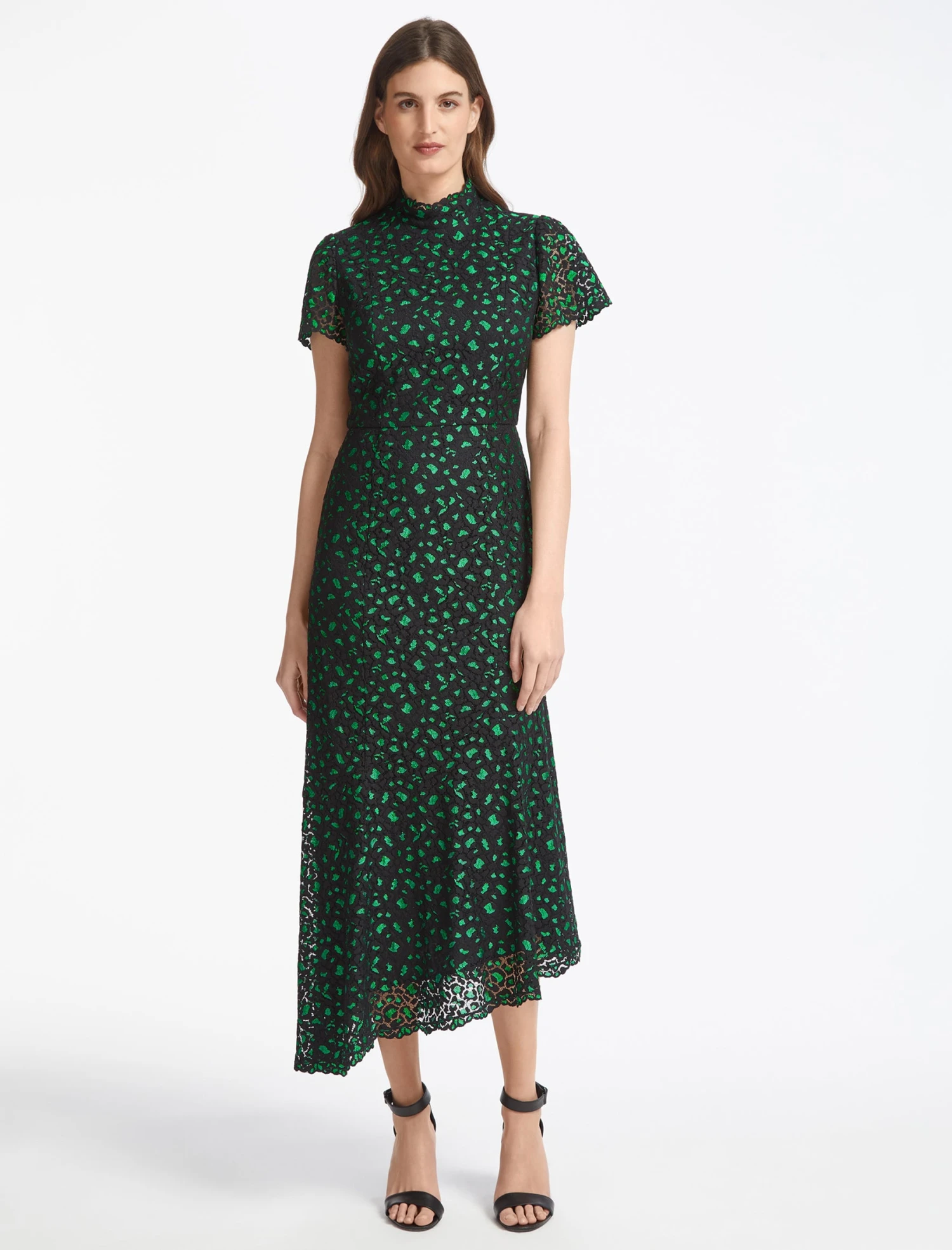 Cut from lace with added stretch, Kayla is figure-hugging but easy to wear, and falls to a fluttery, on-trend asymmetric hem. Best worn with an up-do to emphasise the slimming funnel neck, a strappy heel and a bold lip.
