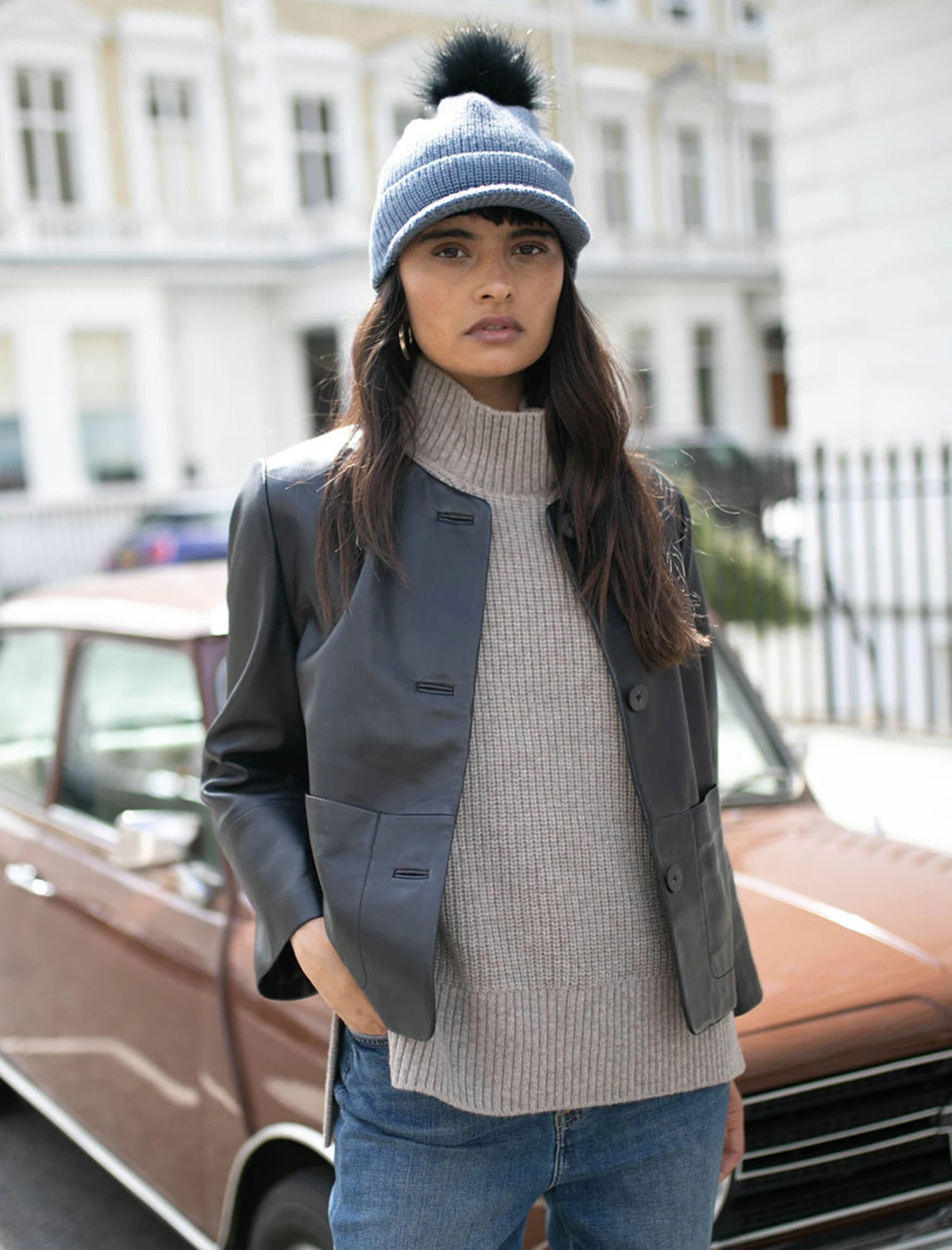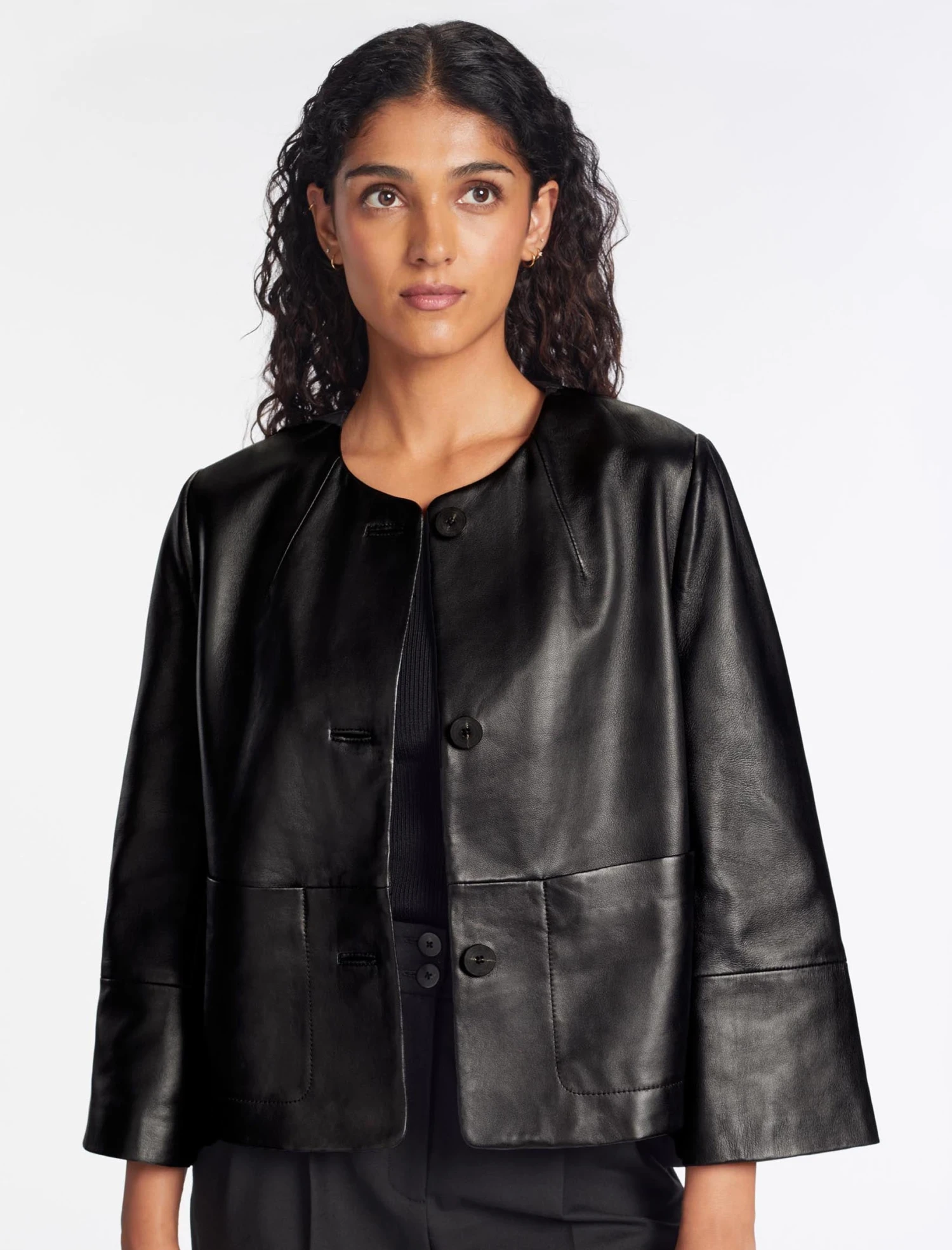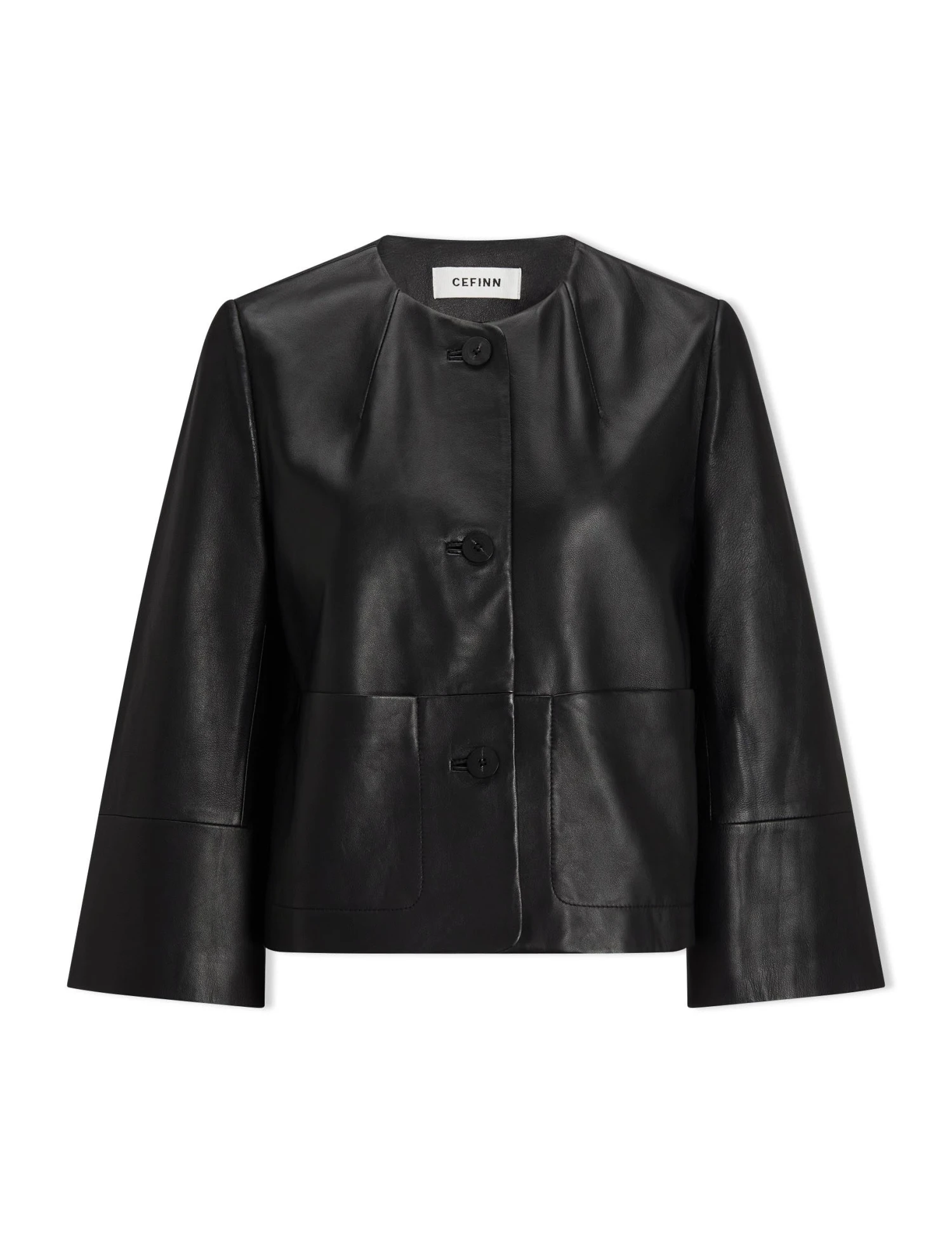 The leather jacket: a fashion icon – and a first for Cefinn. Our cropped style is designed in a butter-soft leather and is cut to a flattering boxy fit with wide cuffs. It sits neatly over a T-shirt or fine-knit or layered under an overcoat in deepest, darkest winter. Adding a sleek touch to anything from denim to a wide-legged trouser like Margot or Terence, you’ll instantly feel polished.