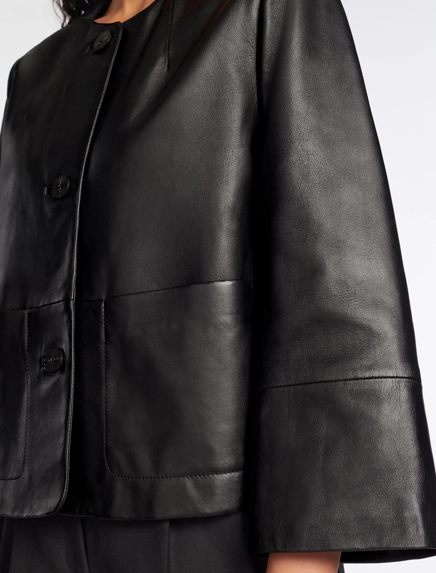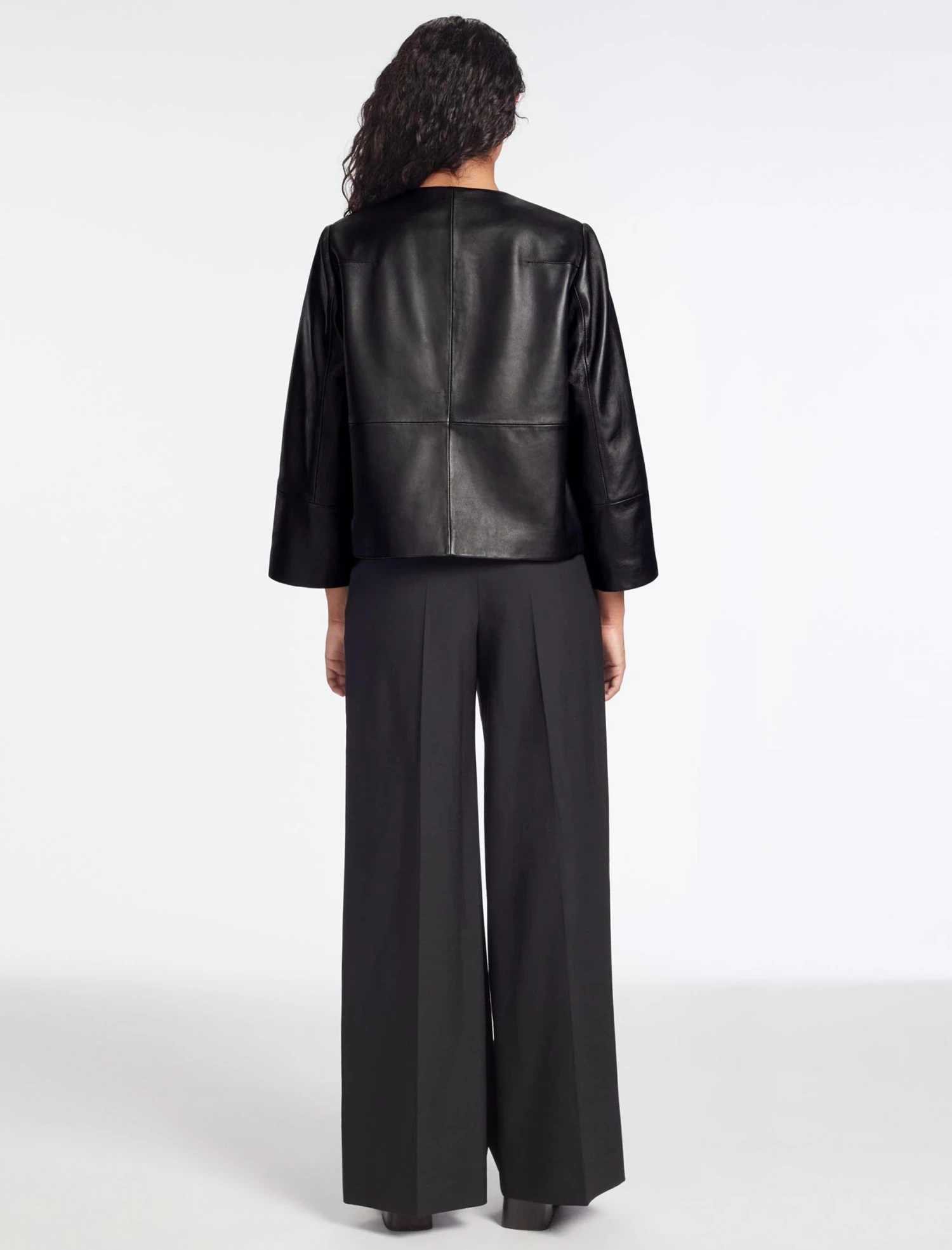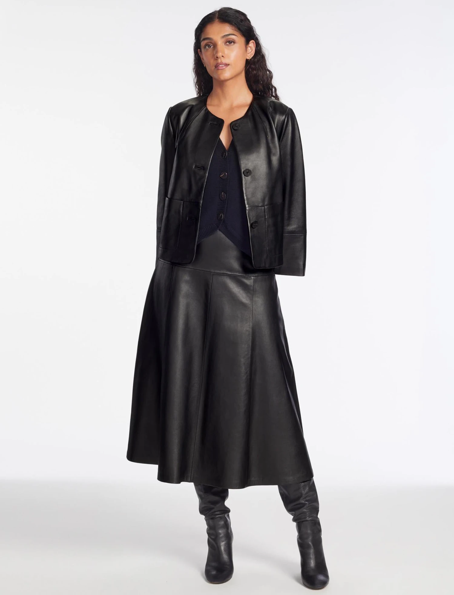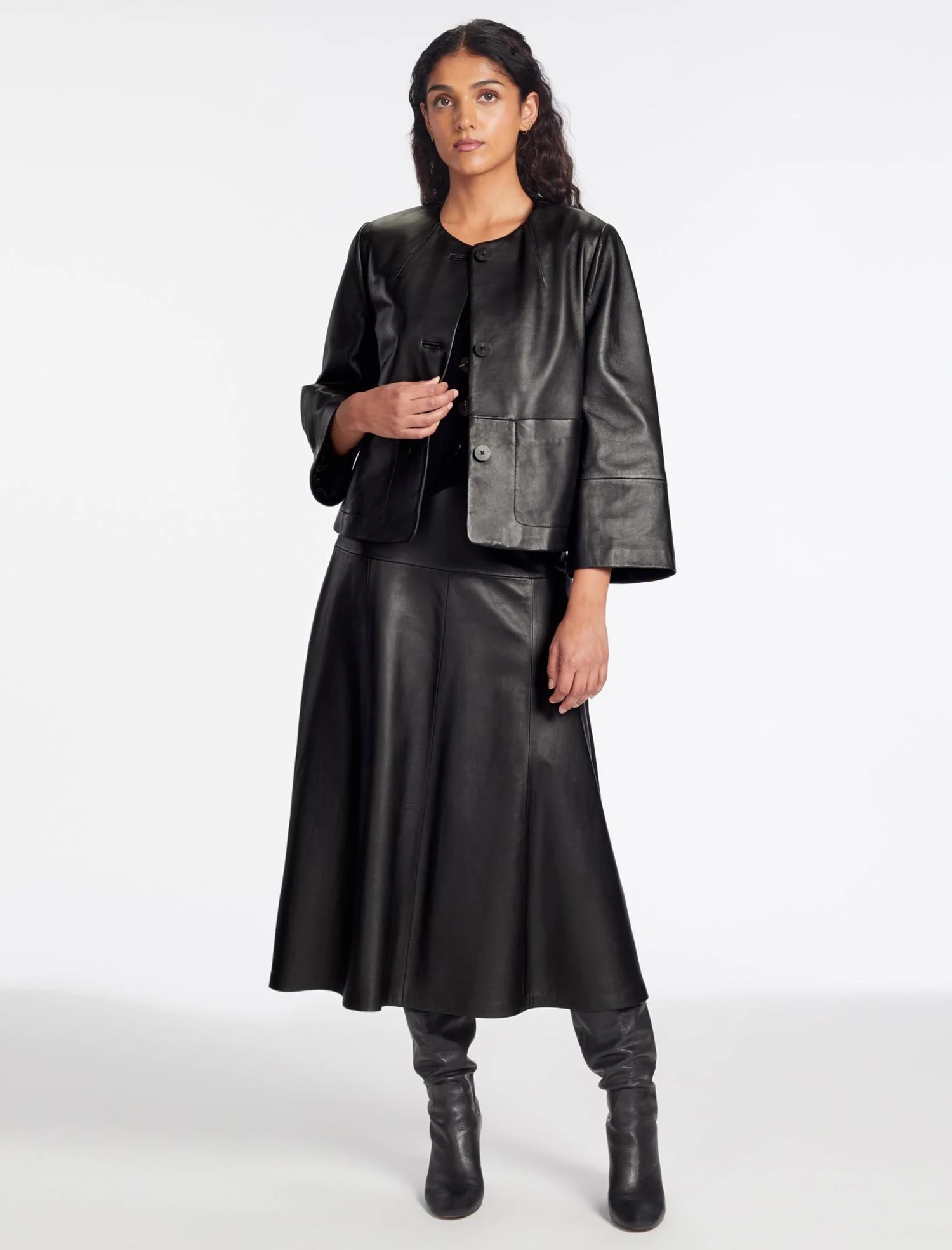 The leather jacket: a fashion icon – and a first for Cefinn. Our cropped style is designed in a butter-soft leather and is cut to a flattering boxy fit with wide cuffs. It sits neatly over a T-shirt or fine-knit or layered under an overcoat in deepest, darkest winter. Adding a sleek touch to anything from denim to a wide-legged trouser like Margot or Terence, you’ll instantly feel polished.