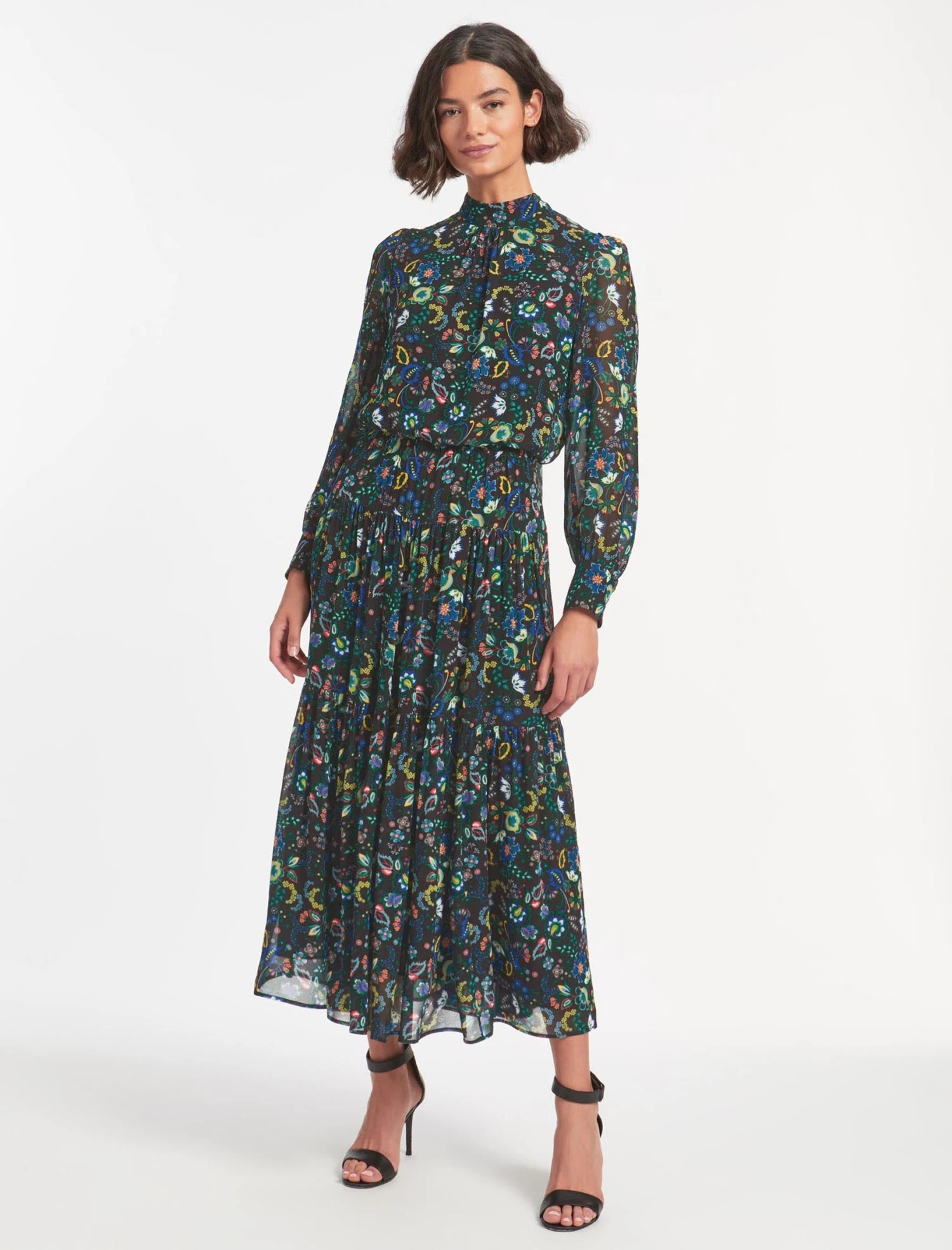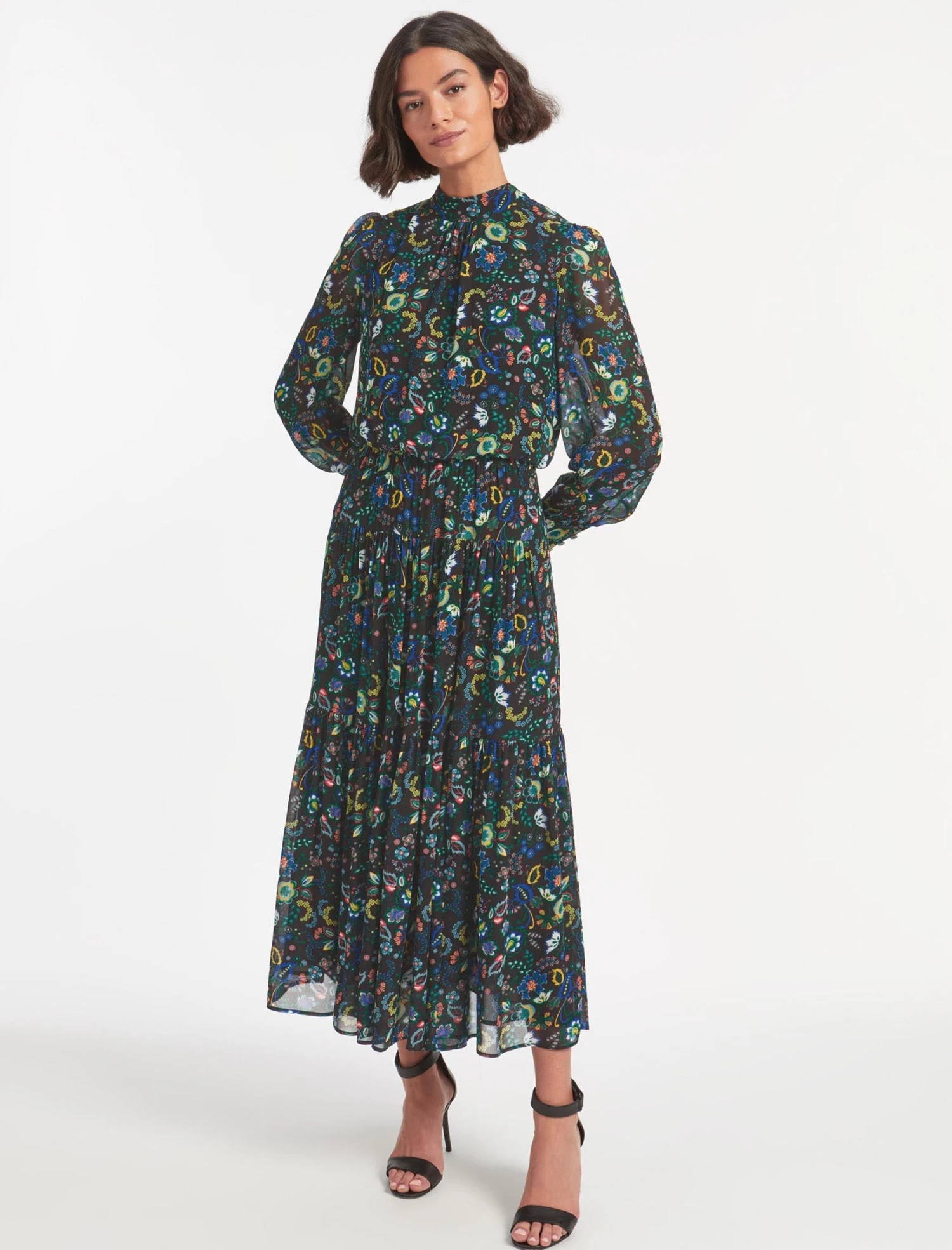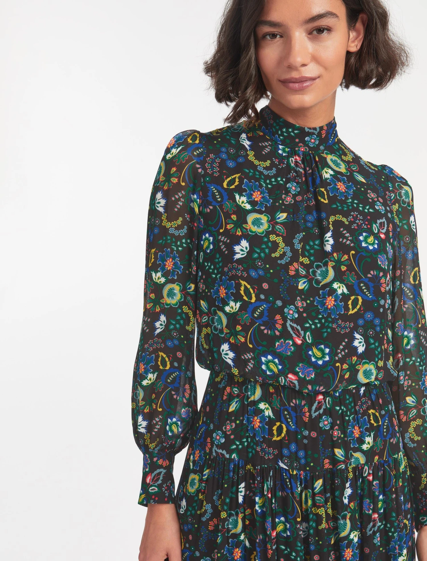 Designed exclusively in house, our large floral prints will instantly transport you to summery meadows. Fresh, feminine and flirty, our new Lorni dress is cut from a viscose-georgette for an elegant finish. It has a high funnel neck with a back summary and zip fastening, long, cuffed blouson sleeves, an elasticated back waist and a pretty tiered skirt. Consider it your event season plus one.