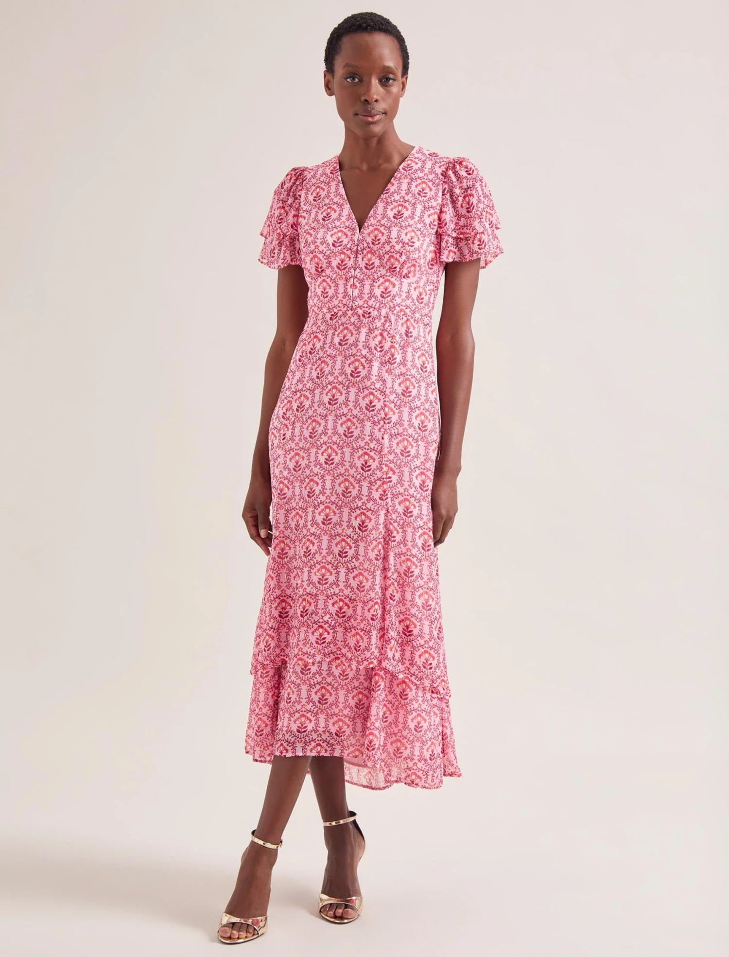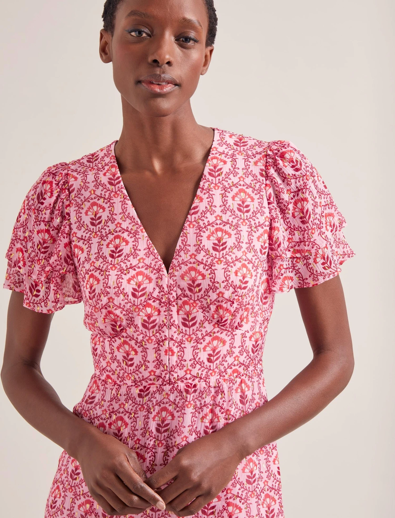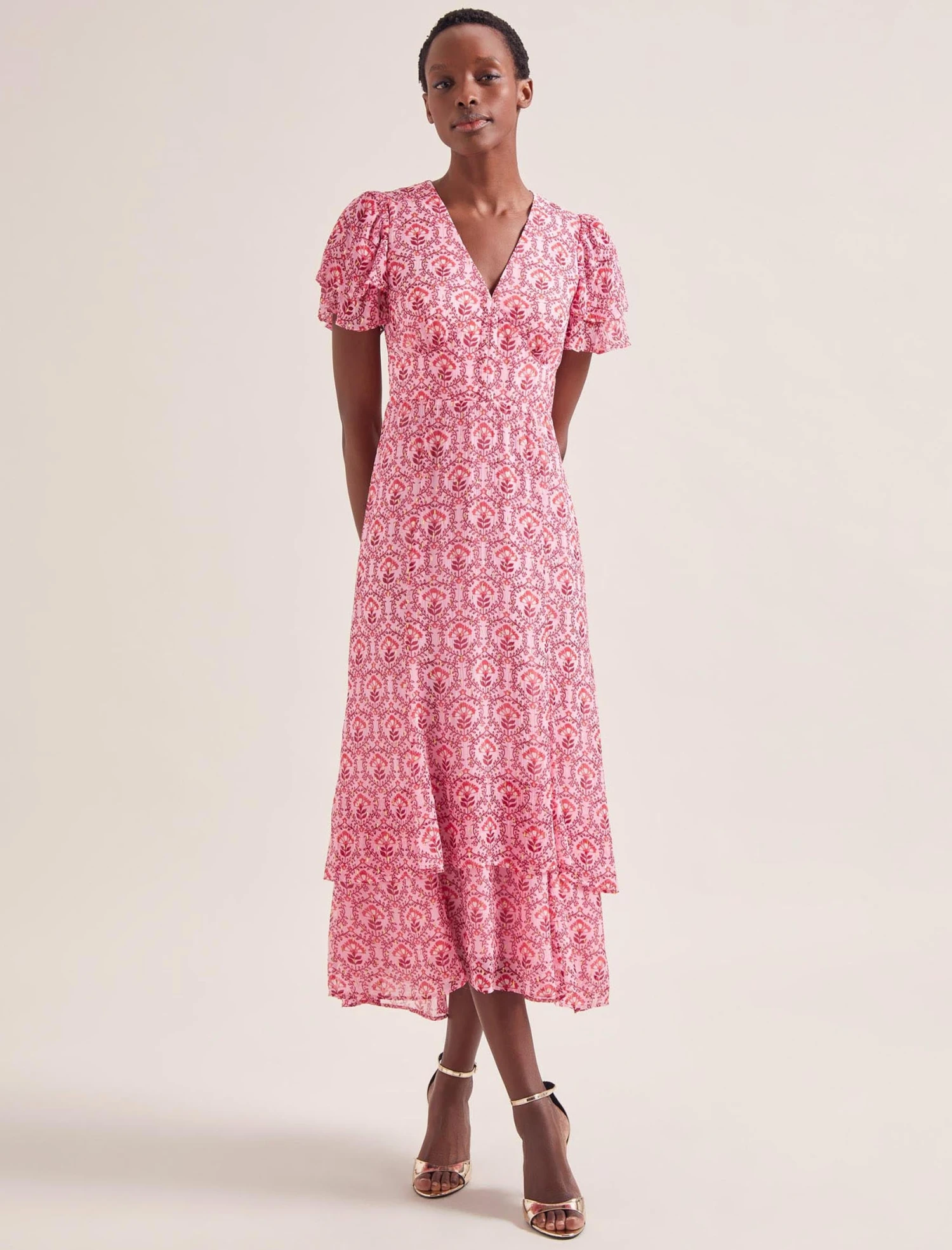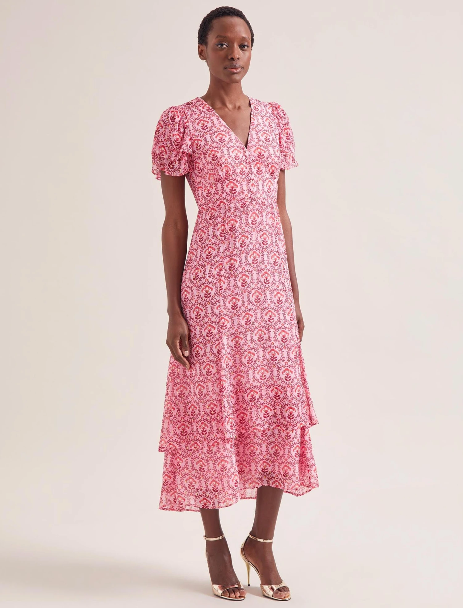 Your perfect plus-one for parties, weddings, and summer events, Lotta is cut from floaty georgette with glittering gold metallic fil coupé detailing to give light-reflecting sparkle. The shirred elasticated back makes it as effortless to wear as it is to style – just add on-trend gold accessories and you’re good to go.