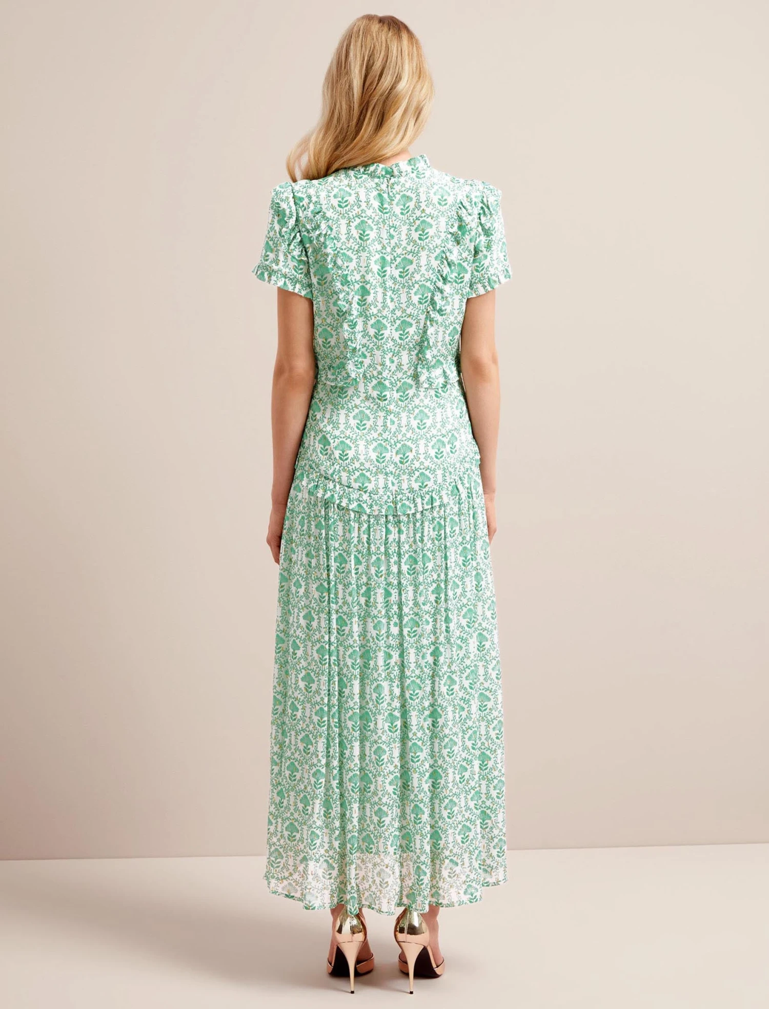 Designed in delicate georgette with shimmering gold metallic fil coupé detailing, Mirabel is the ultimate summer event dress. Fully lined yet light and airy, the contouring cut and frill placement is incredibly flattering making this the dress for a stand-out statement.
