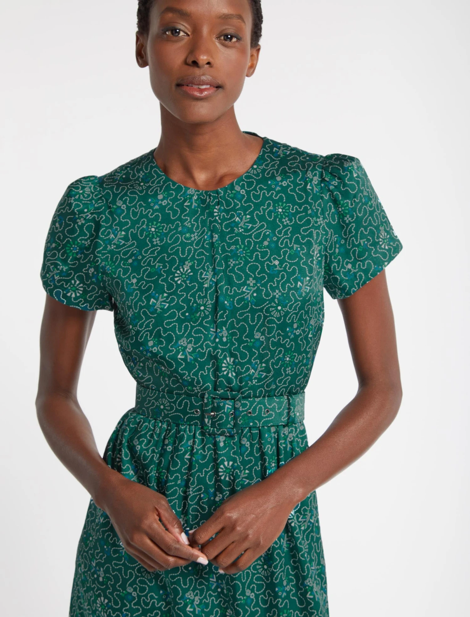 New for Winter 22, Nina has day-to-night, all-year-round appeal. Designed in our recycled poly twill that is silky to the touch and patterned with our striking wiggle print, you’ll feel pulled-together, poised and polished – even on time-pressed days. The matching detachable belt elevates it for evening, while the easy silhouette means it works just as well for day with our Kelis cardigan and a long boot.