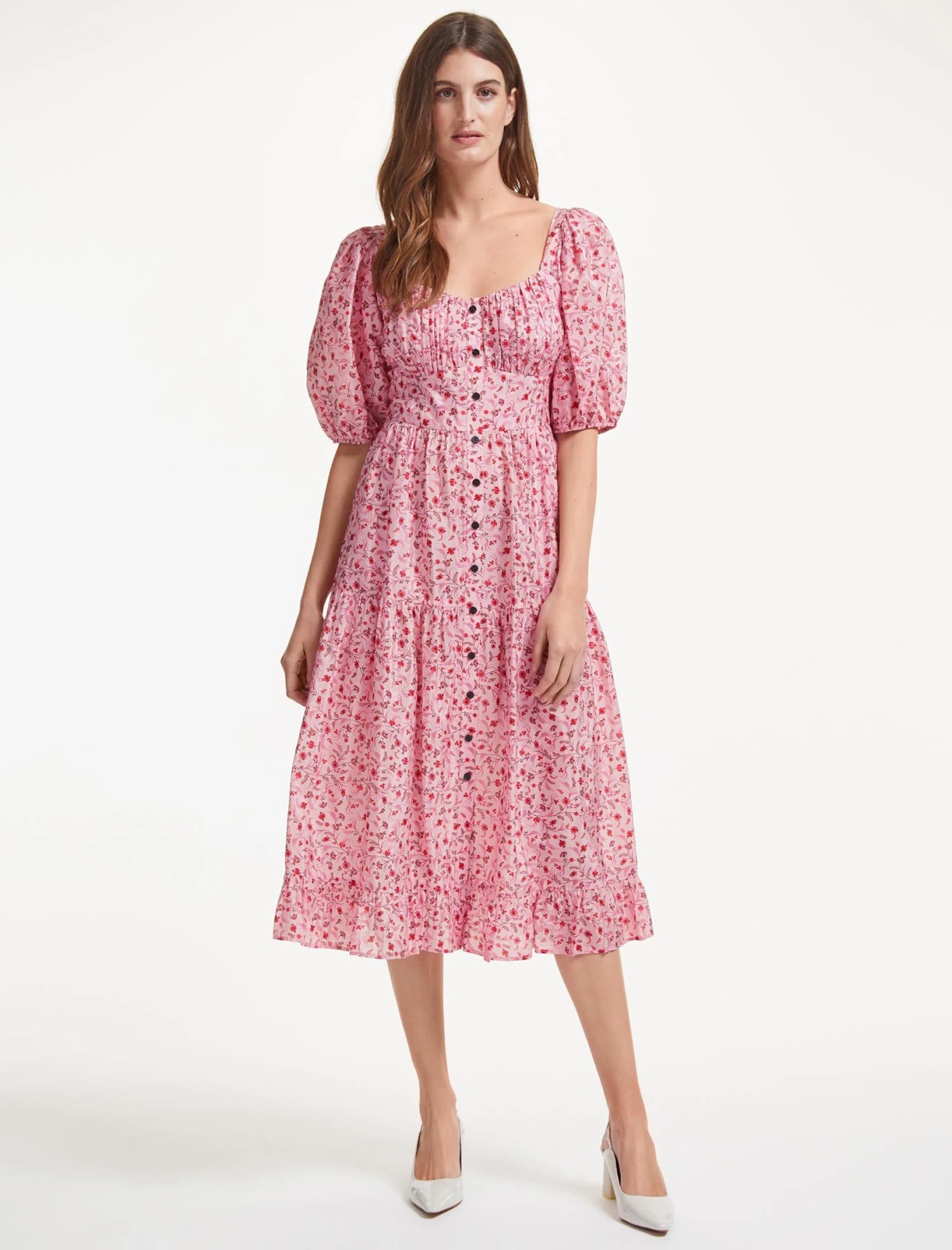 Designed in a breezy cotton blend in our pretty pink trailing floral print, our flirty Paloma dress will be your go-to summer favourite. Made with a lightly fitted bodice that’s shaped with a gathered bust and puffed sleeves, it falls to a softly tiered skirt. Shirring on the back and a fixed sleeve with loops to keep your bra straps concealed give it everyday wearability. Play into its femininity with a pretty sandal and undone hair.