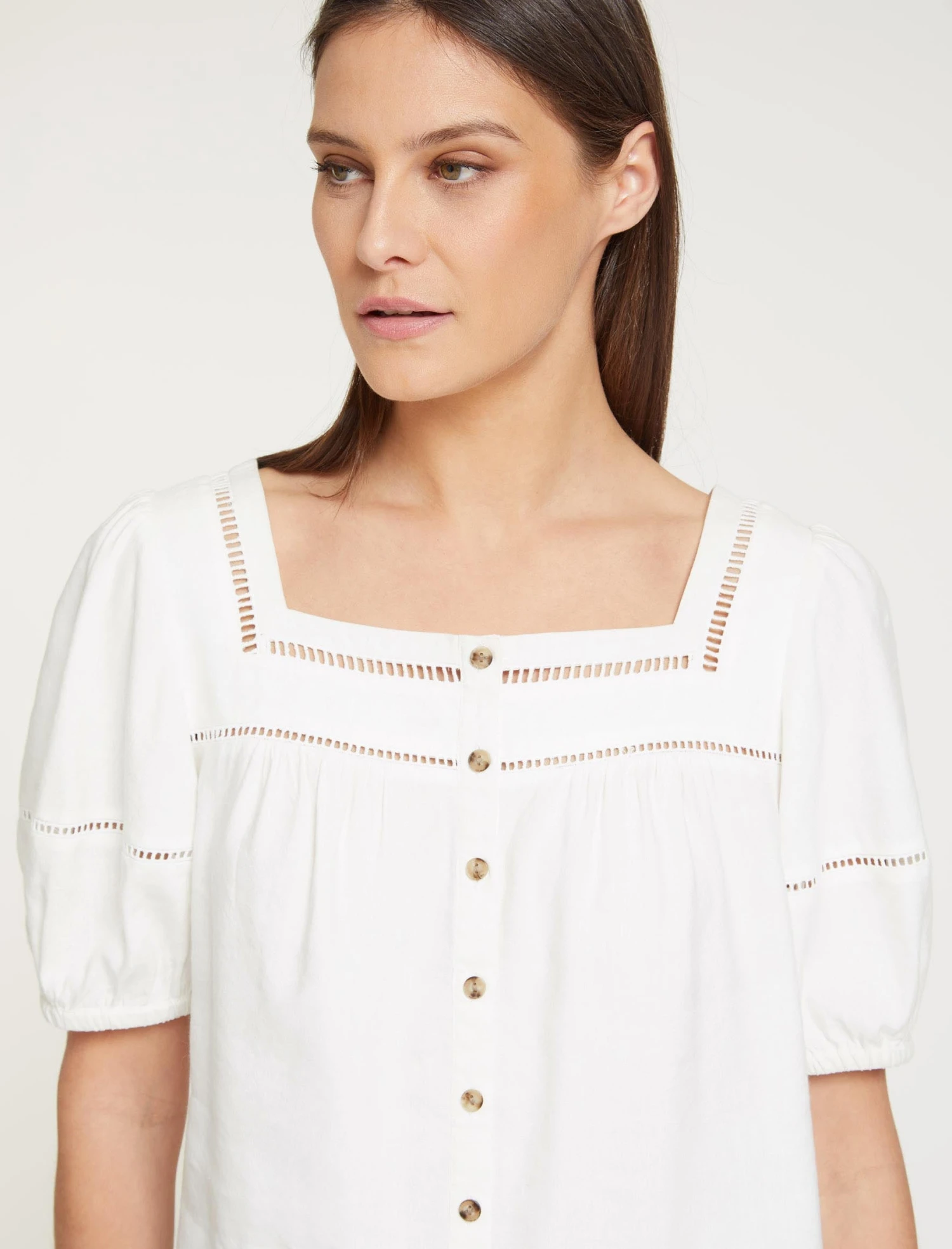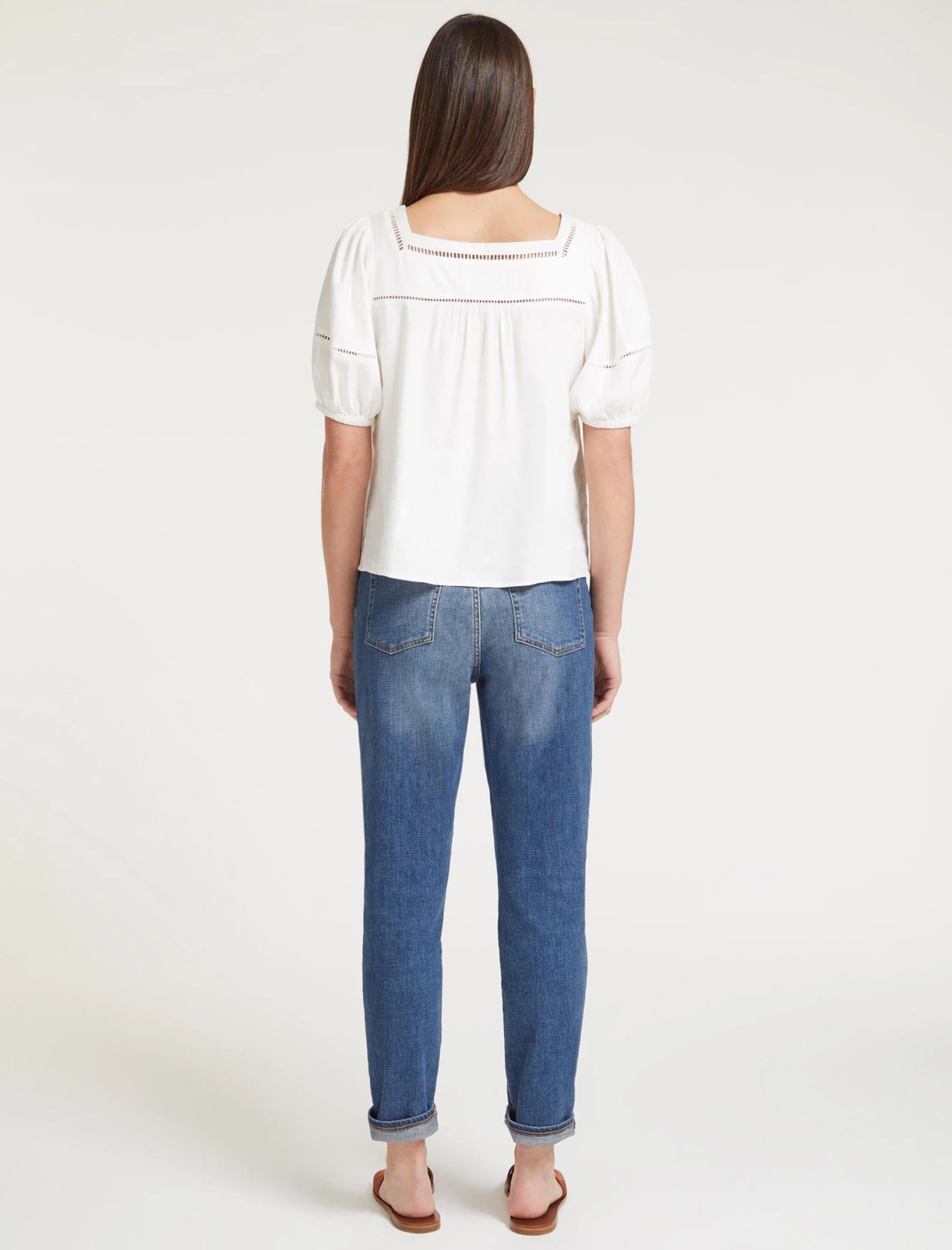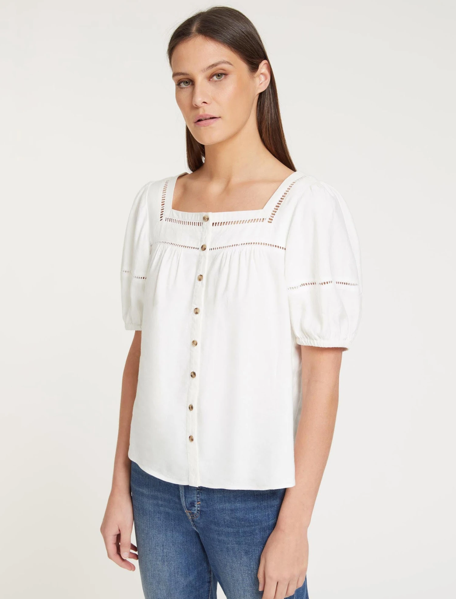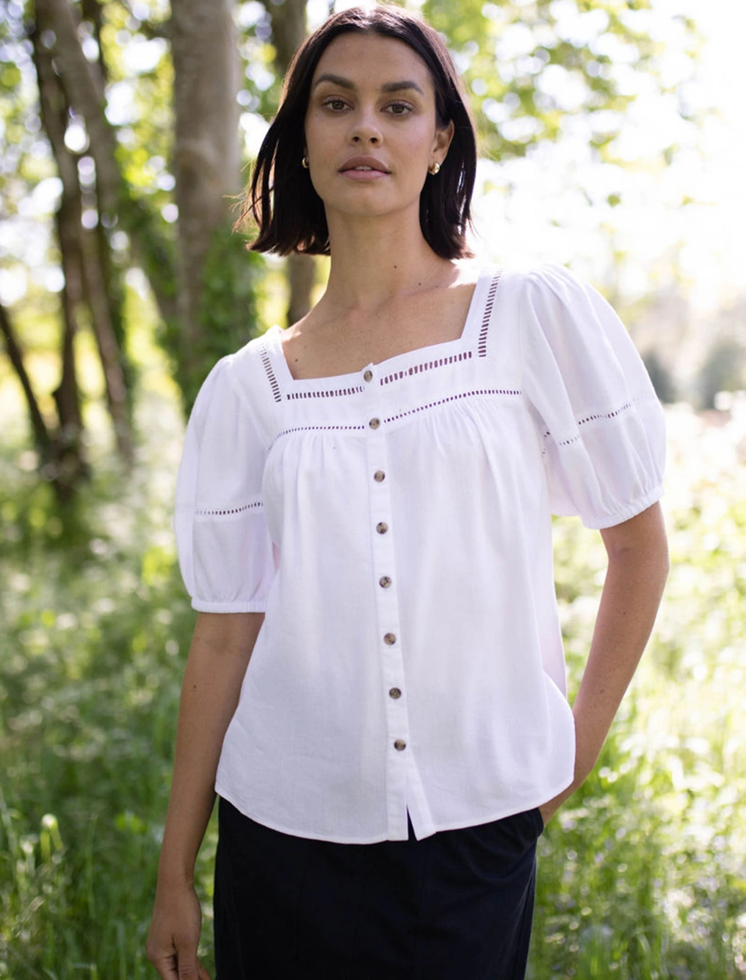 Our white Poppy blouse is a pretty summer staple no wardrobe should be without. Designed in our all-new machine-washable linen blend, the elasticated puff sleeves, ladder trims and square neckline give denim cut-offs or a cotton chino a feminine twist.