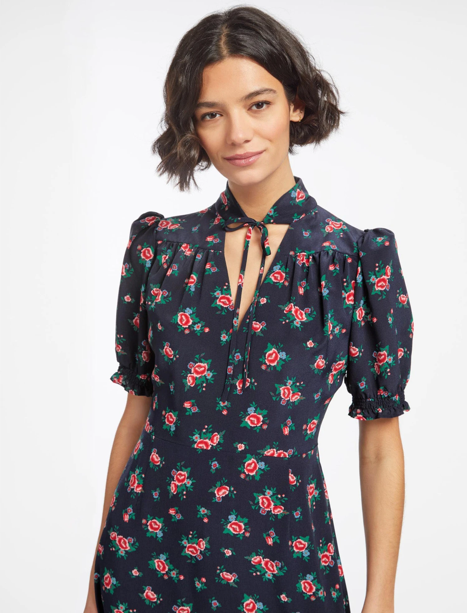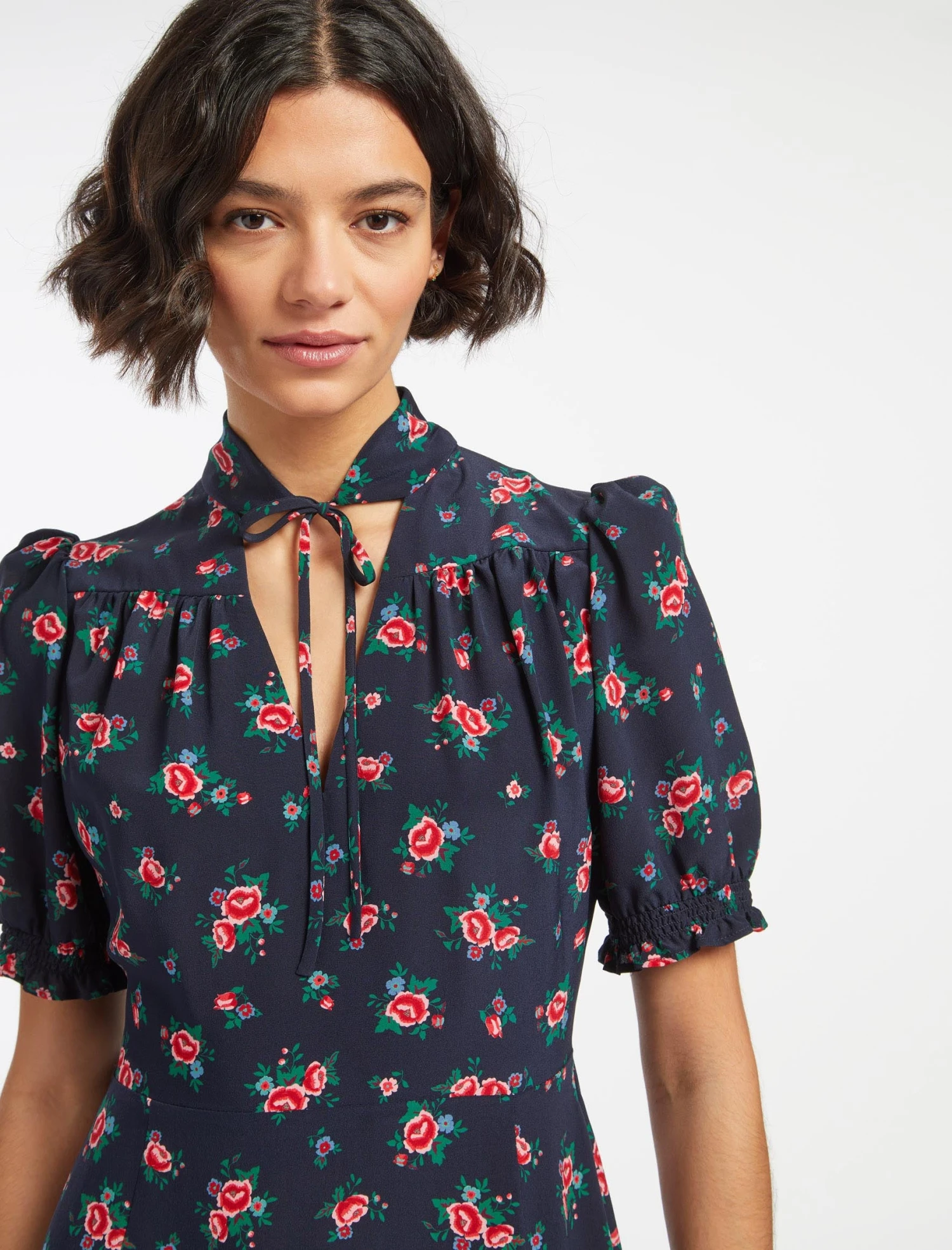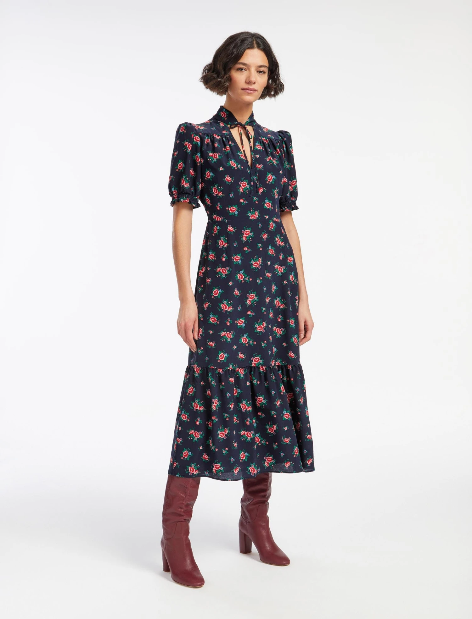 Rebecca offers a more grown-up and dressier spin on summer’s favourite dress: the floaty floral. Strewn with rose sprigs, it has a tie collar (in the style of our best-selling Jacquetta dress) and short puff sleeves that lend it polish and elegance. Designed for day-to-evening, summer-to-autumn wear, simply add knee-length boots and a slim-knit cardigan as the leaves begin to turn and the days shorten.