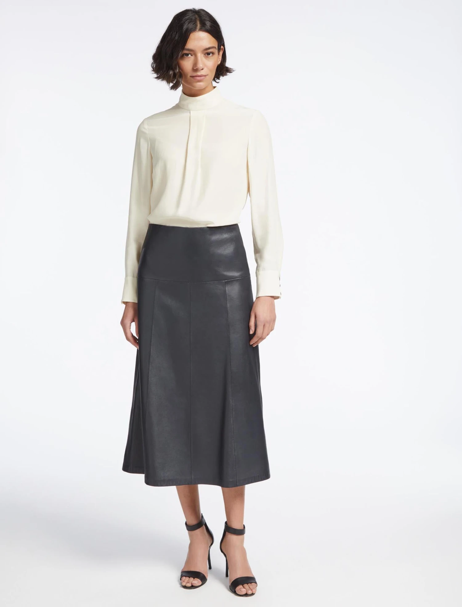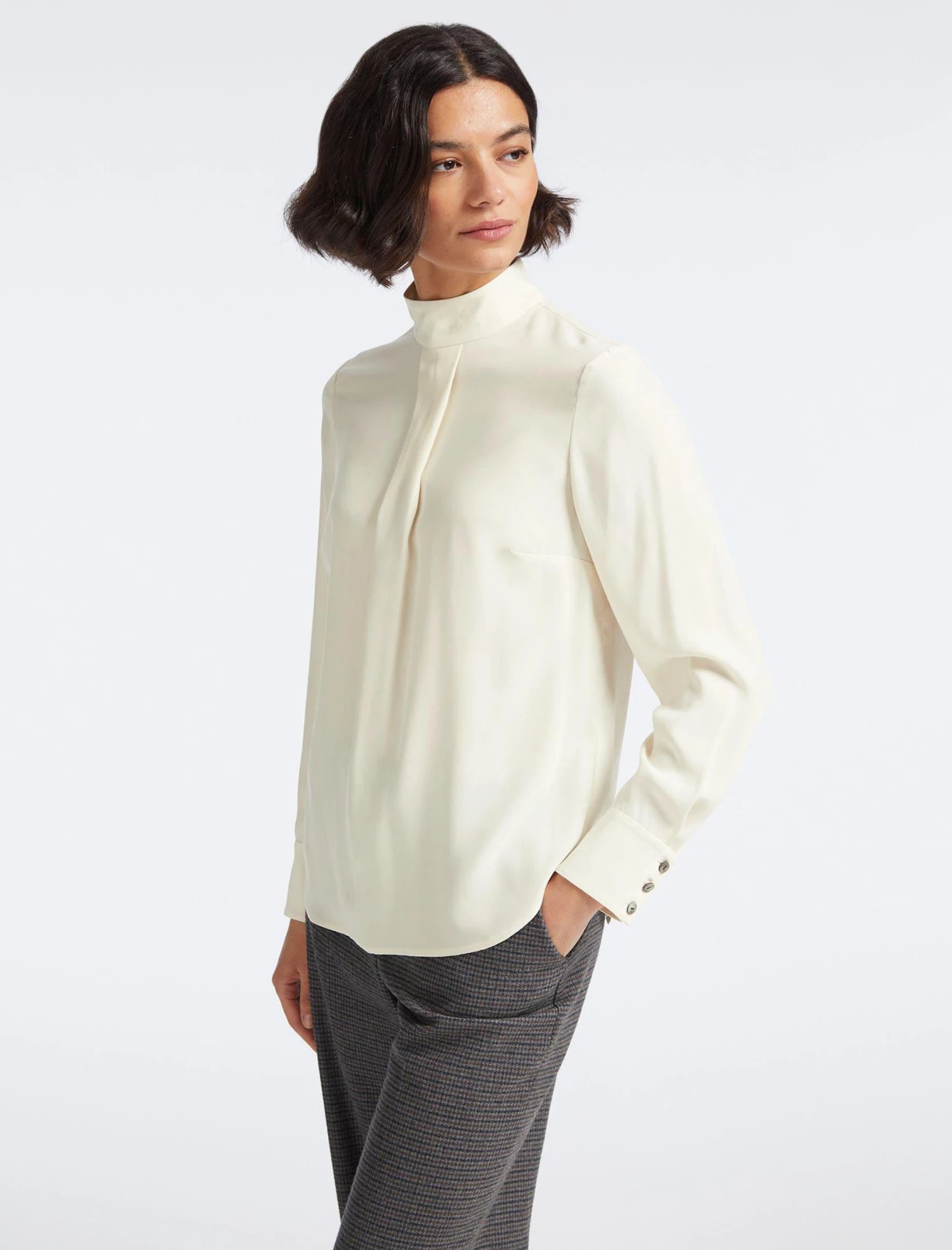 New for Spring 23, our hero Riley blouse now in timeless cream 100% silk. Nothing says clean, crisp and understated quite like a silk blouse and our funnel-neck design has a luxurious handle and weight thanks to the satin-backed crepe, which gives it its opacity. A versatile workwear or eveningwear option, wear with our leather Tiana skirt or a wide-legged Terence trouser and a heel for a sophisticated soiree.