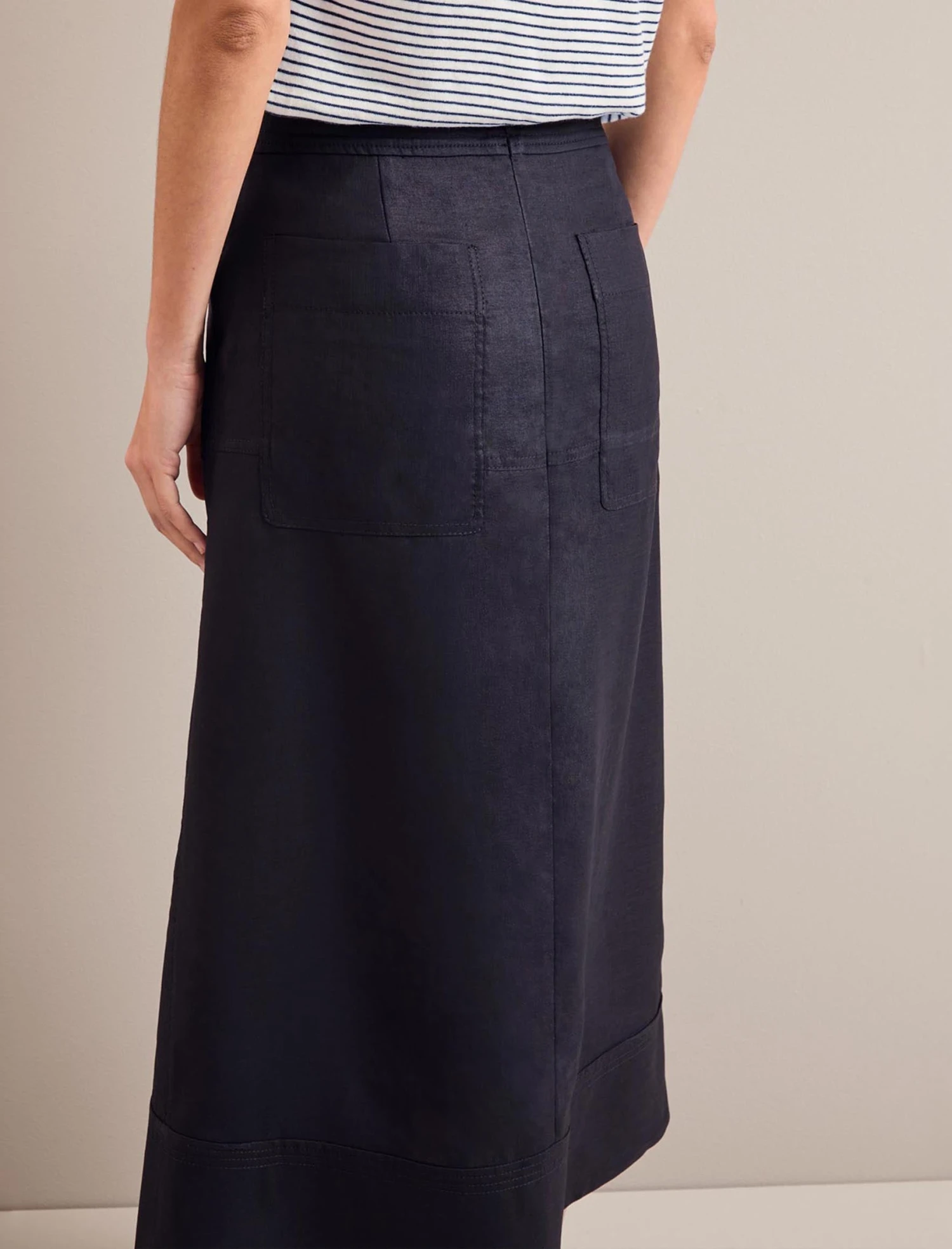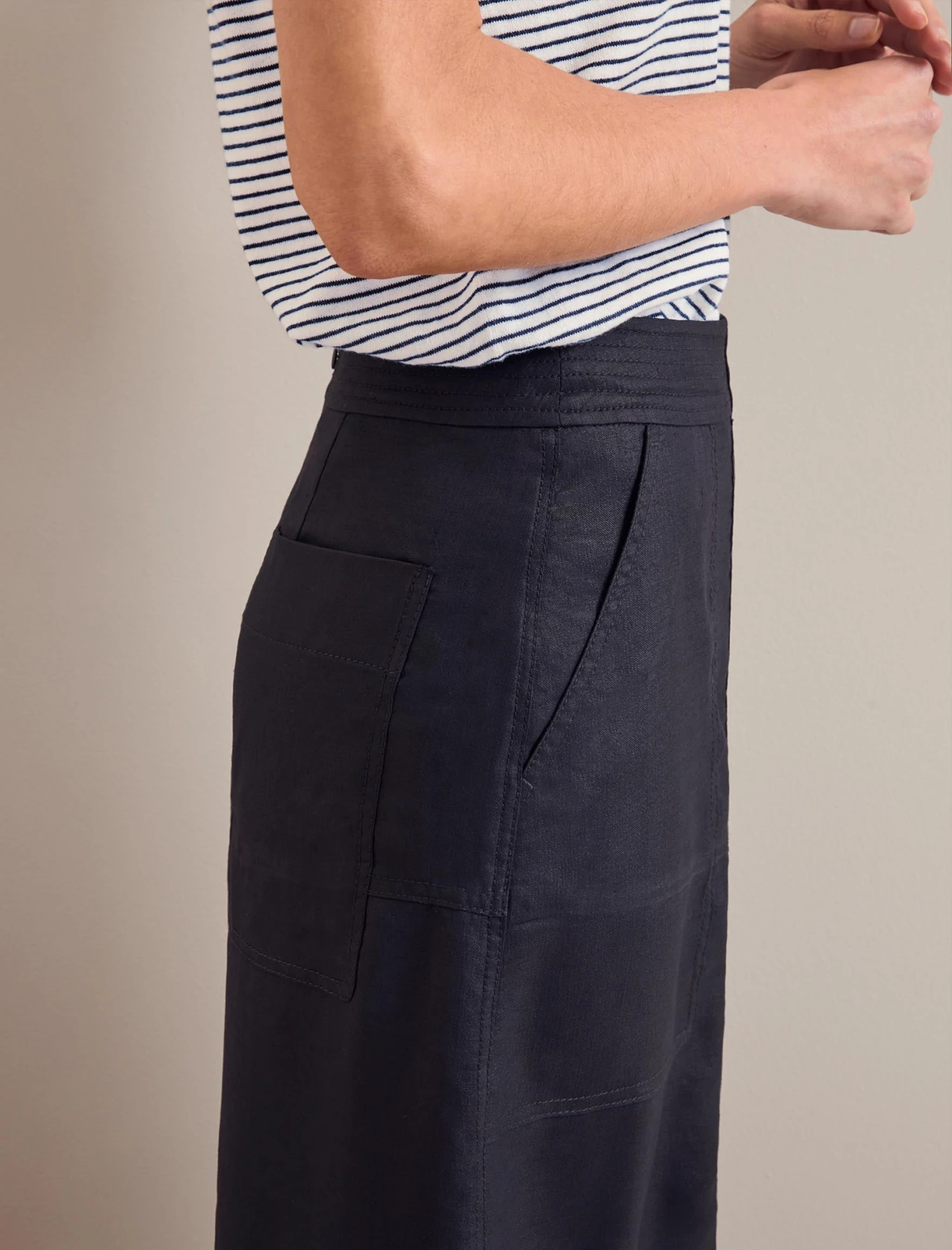Perfectly paired back, the Safia skirt is a lesson in the art of less is more. Cut in our hero fabric, Techni Linen, which is designed to look like its namesake but is less prone to creasing, it has hallmark utility styling by way statement pockets and overstitch detailing. A slit at the front adds sexiness while bar tacks prevent gaping. Style with a simple tee or sleeveless knit for cool nonchalance.