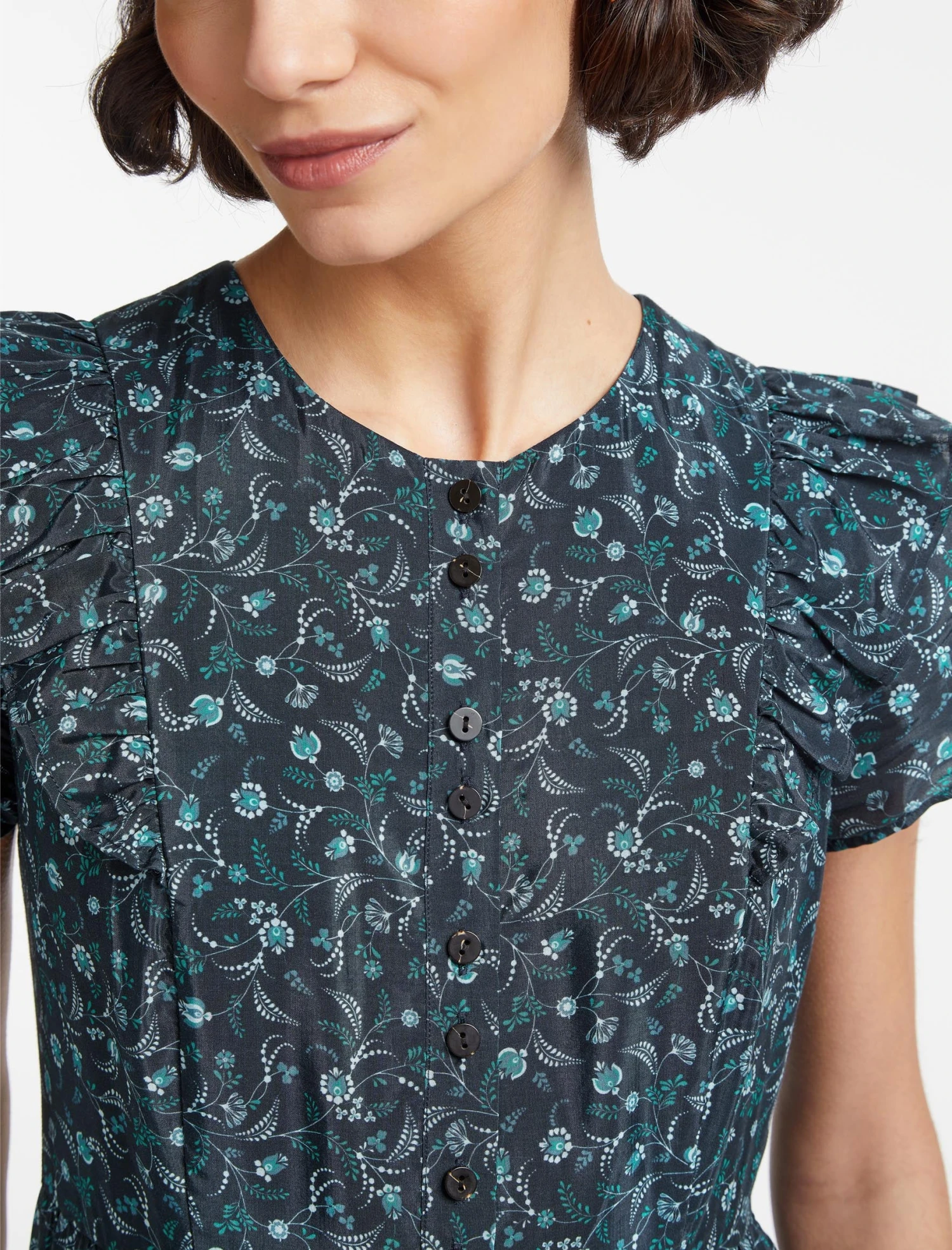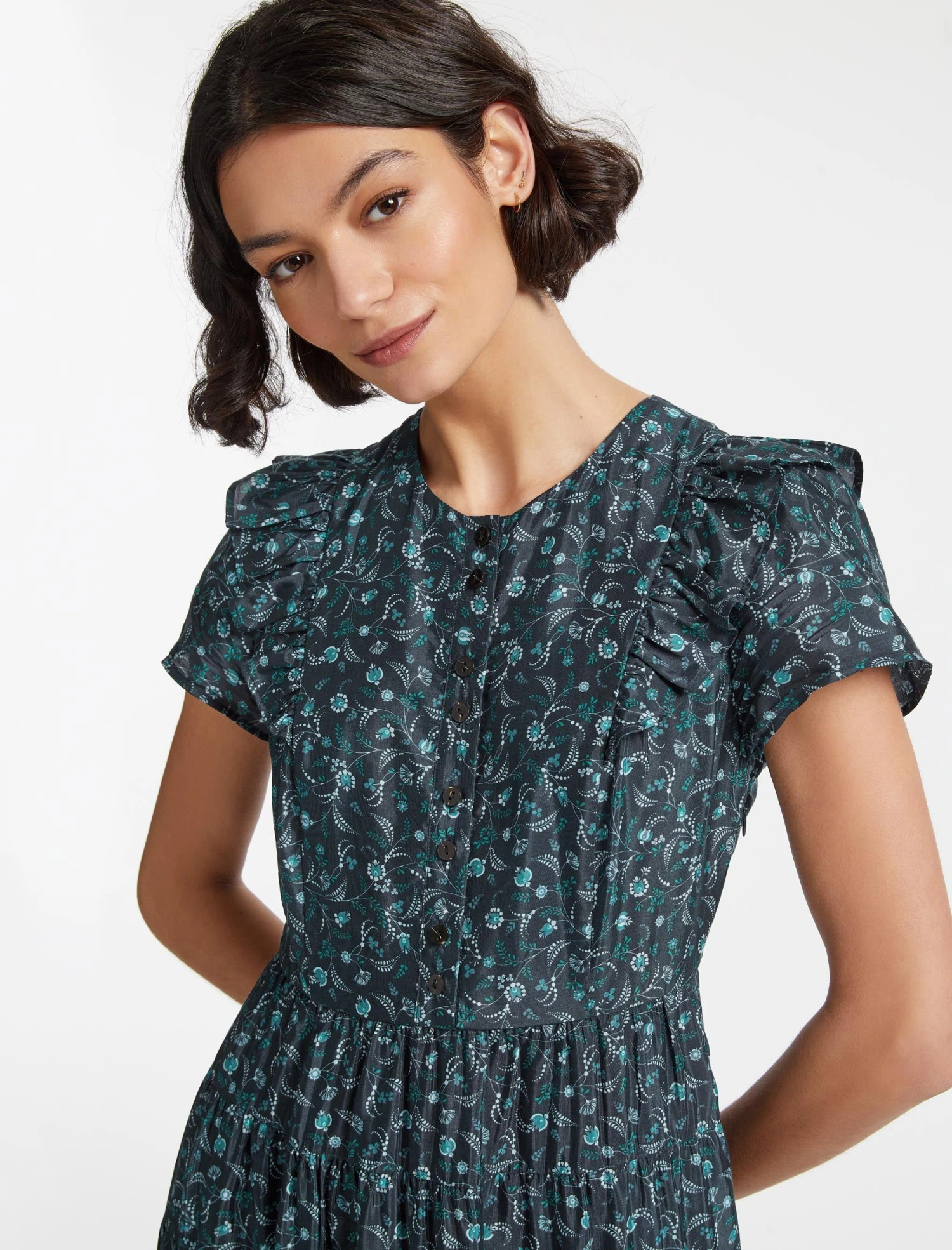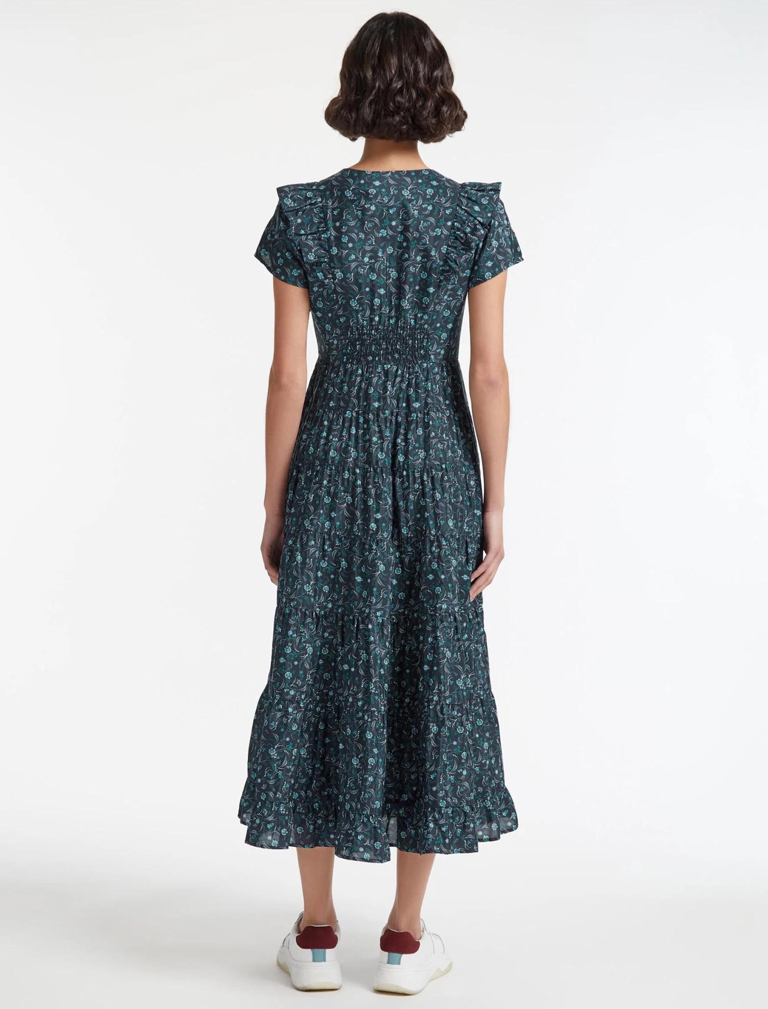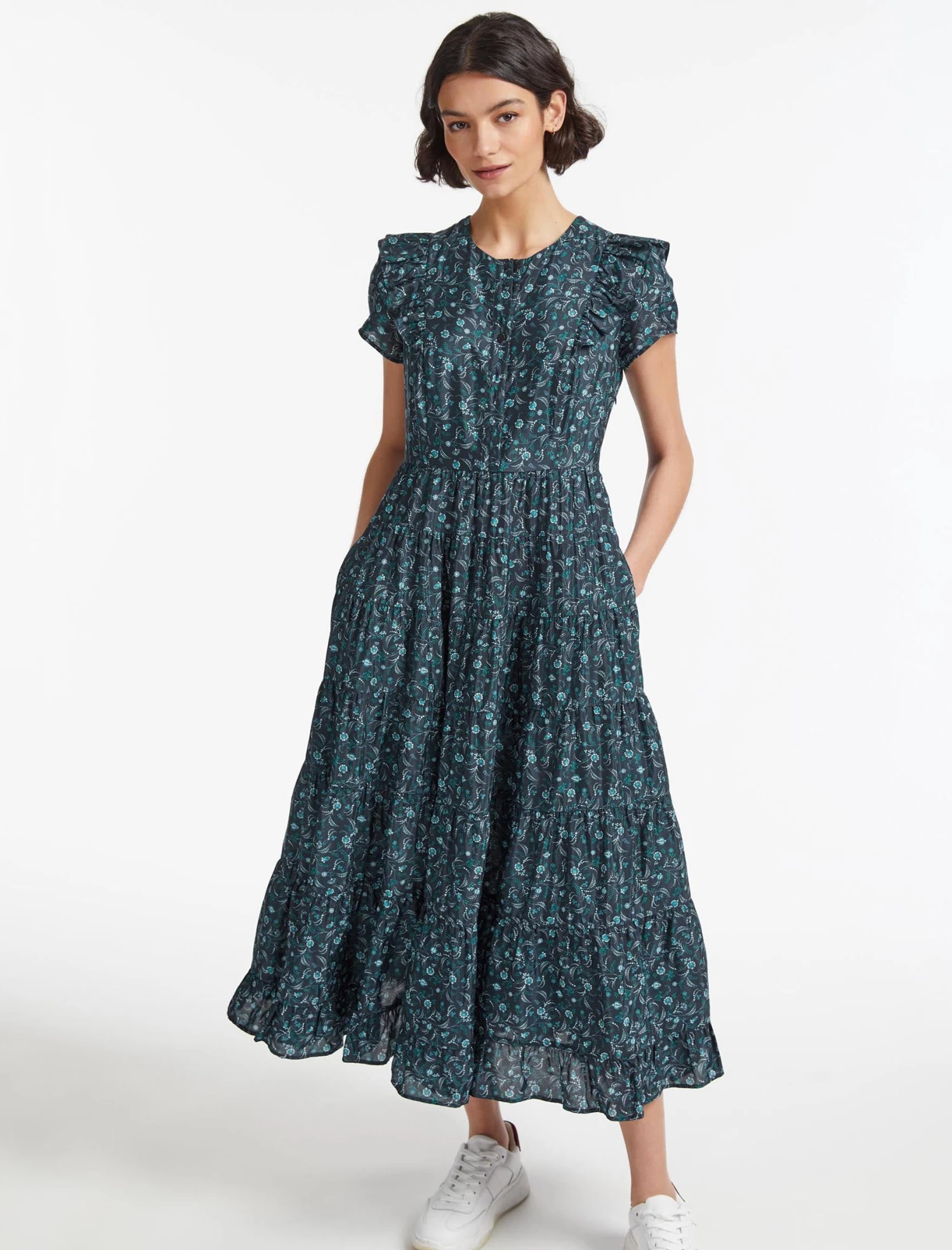 With its exaggerated shoulder and swishy tiered skirt, Sawyer has Prairie-dress-style charm in abundance. Made from a lightweight cotton blend in our summer-ready blue trailing floral print, with pretty ruffle detailing at the shoulder and shirring at the back to nip in the waist, it’s super cool, feminine and flattering. Pair with a white trainer or summer sandal.