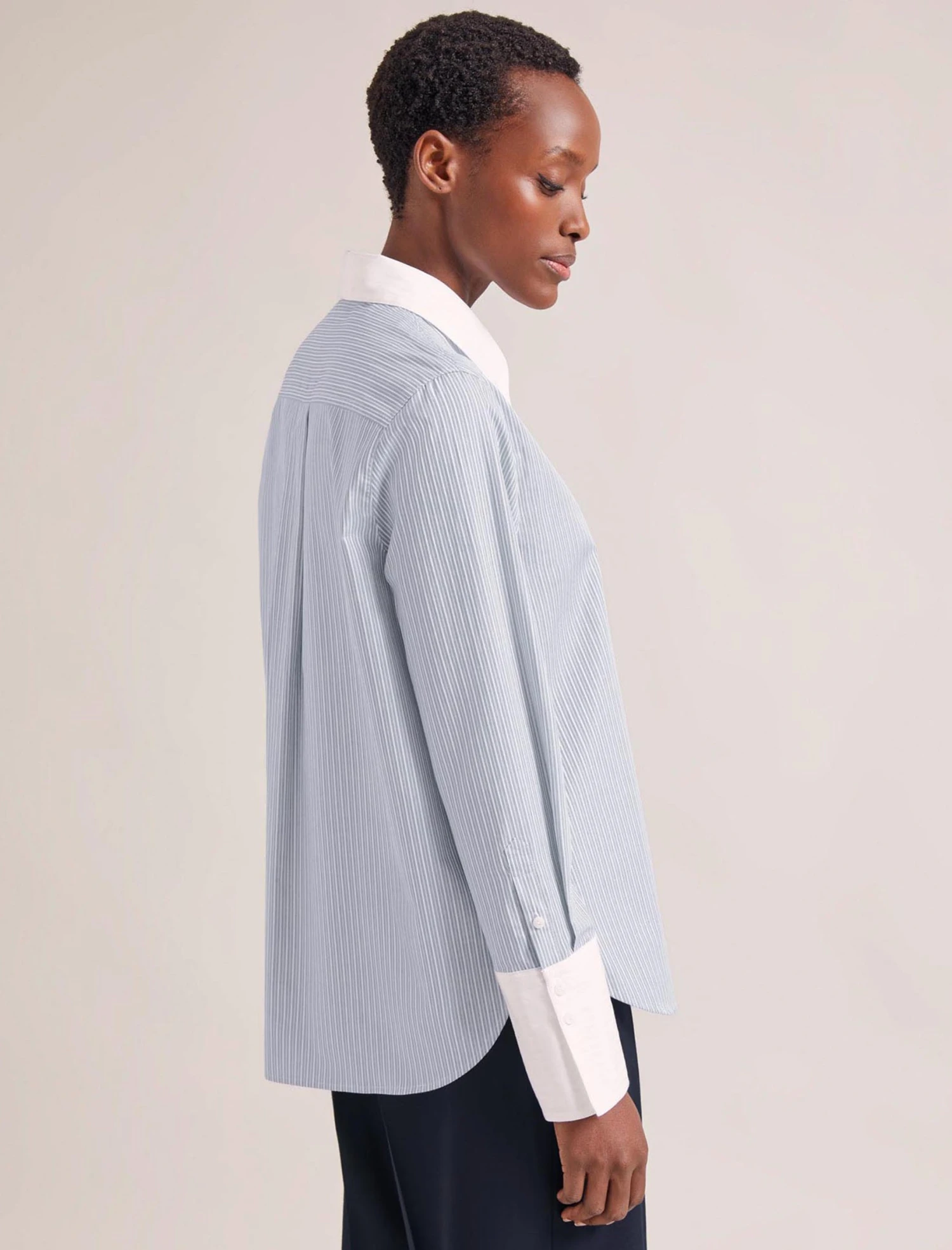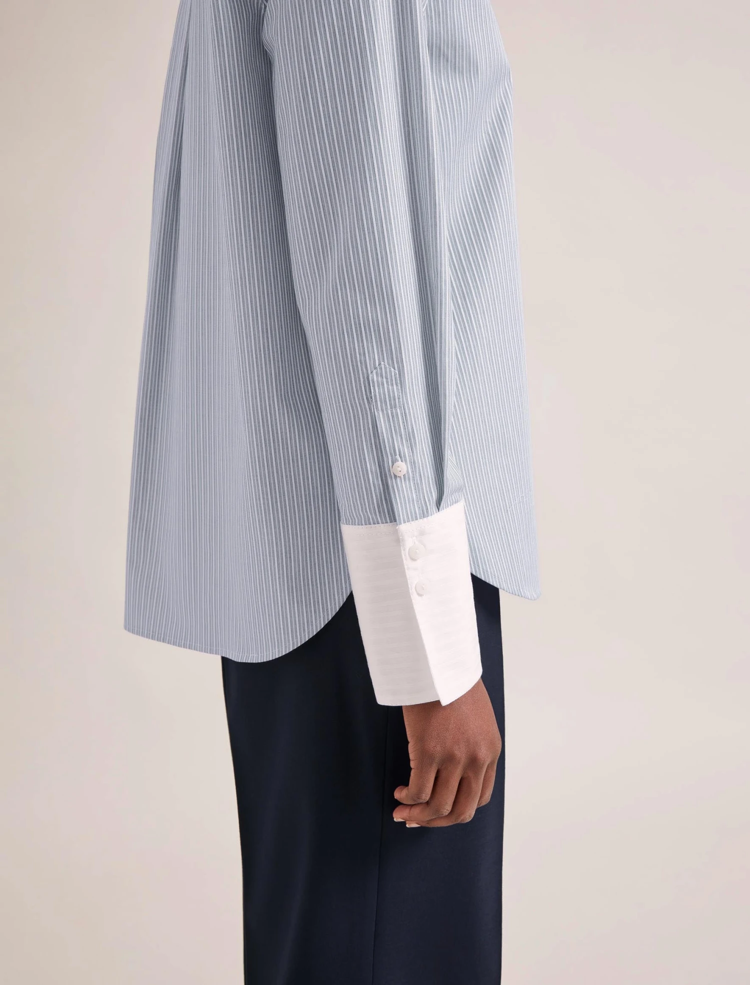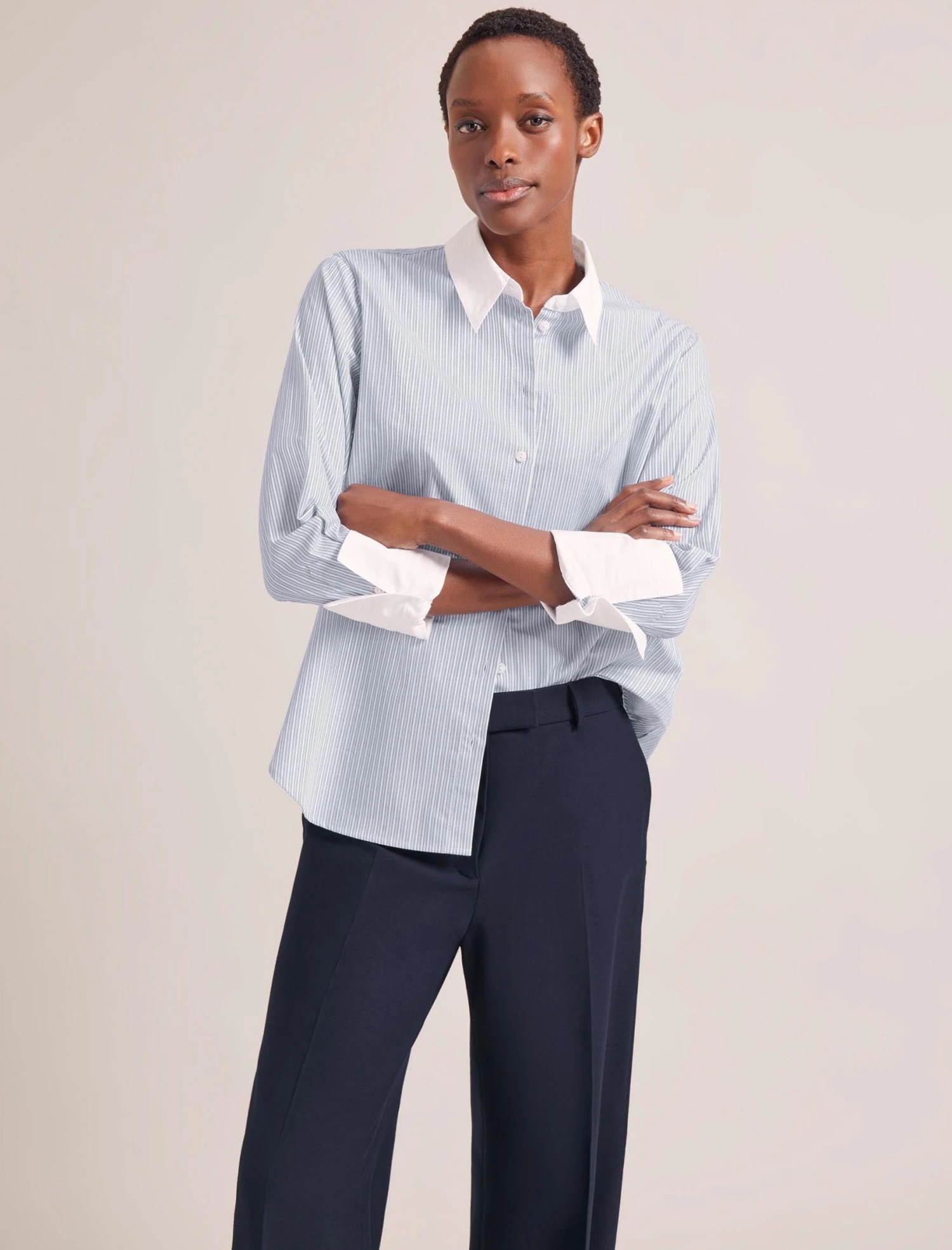Who doesn’t love a striped mannish shirt? Shaking off any corporate connotations, our new organic cotton shirting has a luxe feel and crisp handle. Seymour’s jacquard stripe, contrasting collar and oversize turn-up cuffs add a contemporary twist to the classic shirt. Wear done-up with denim or wide-leg trouser, or partially undone with a vest and tailoring.