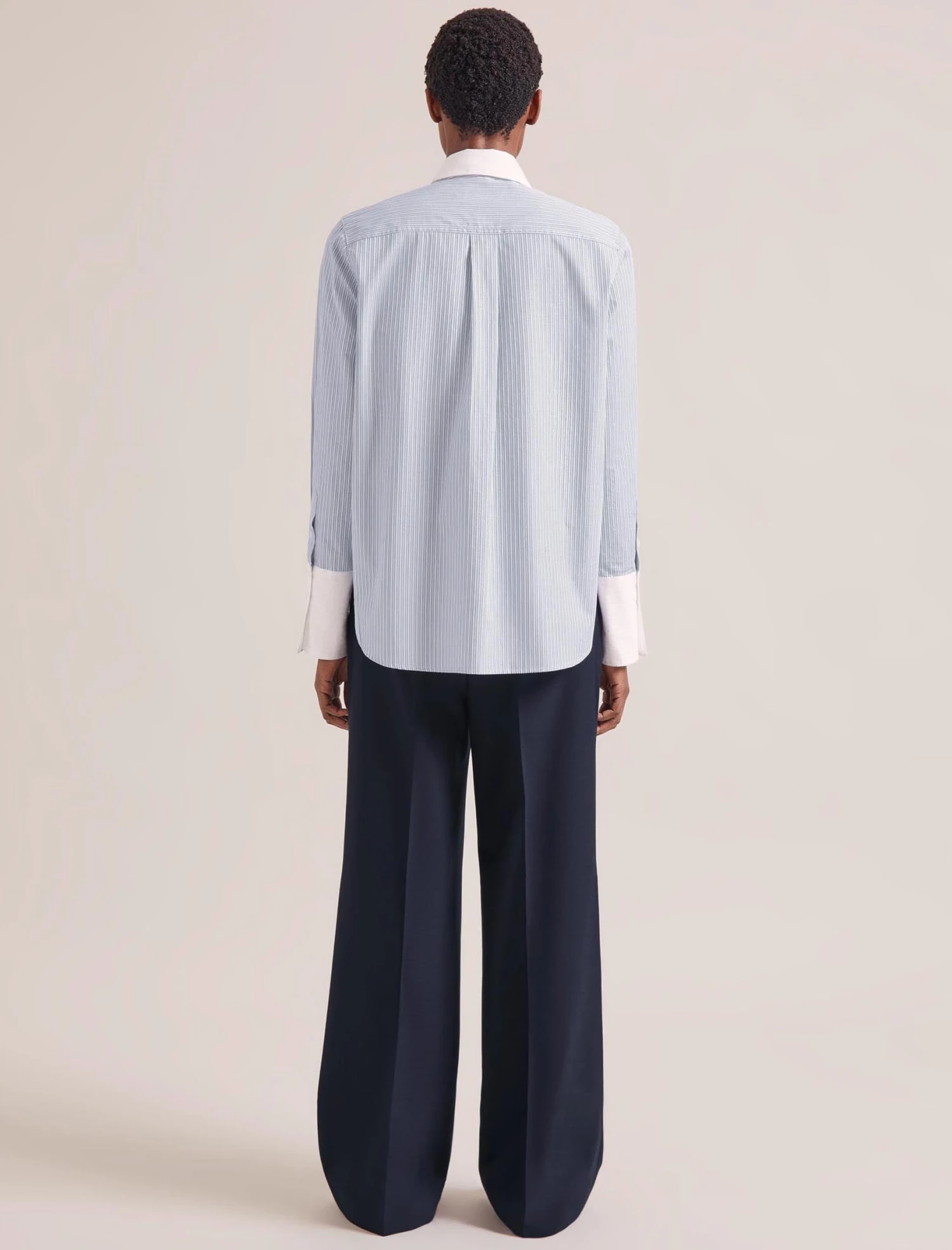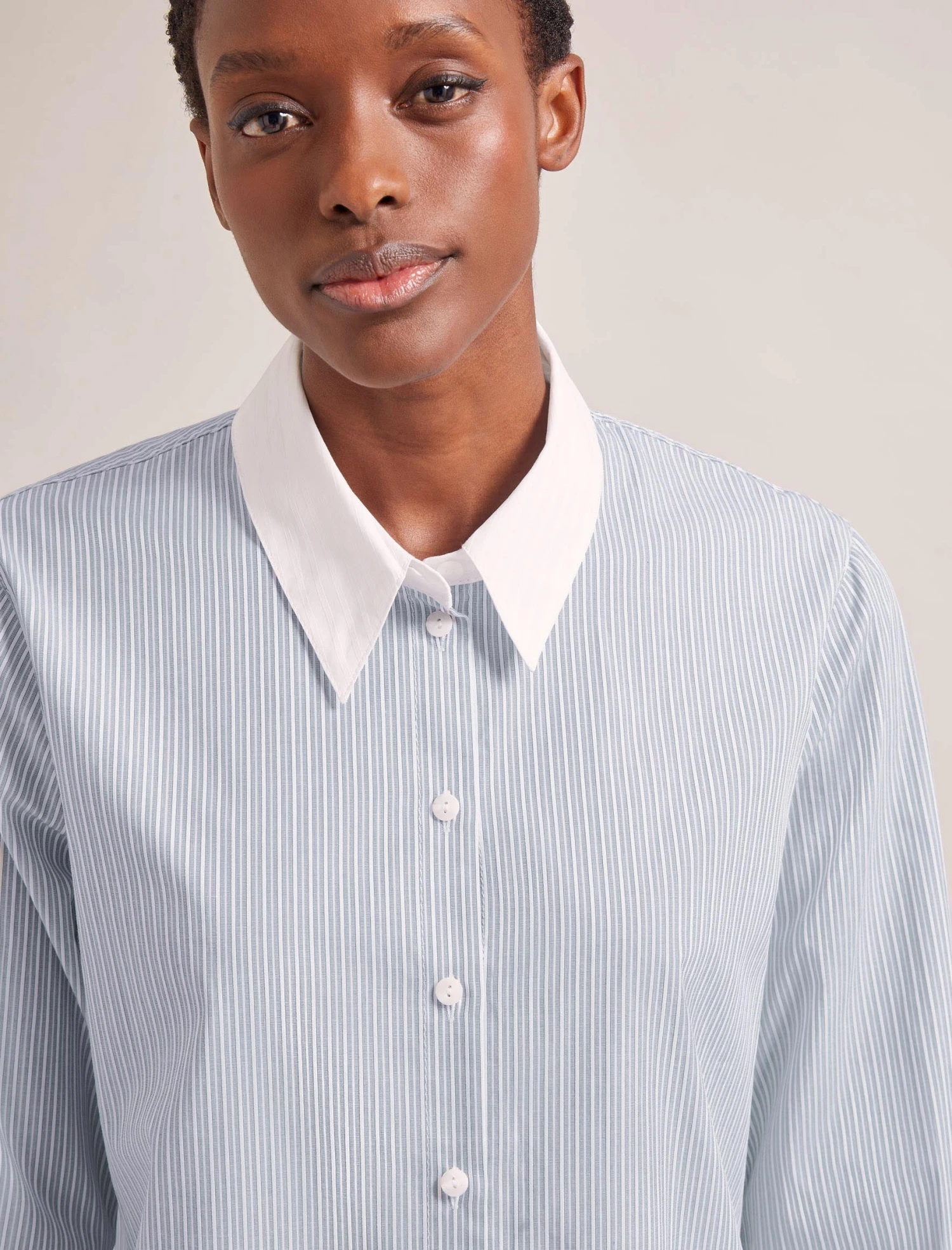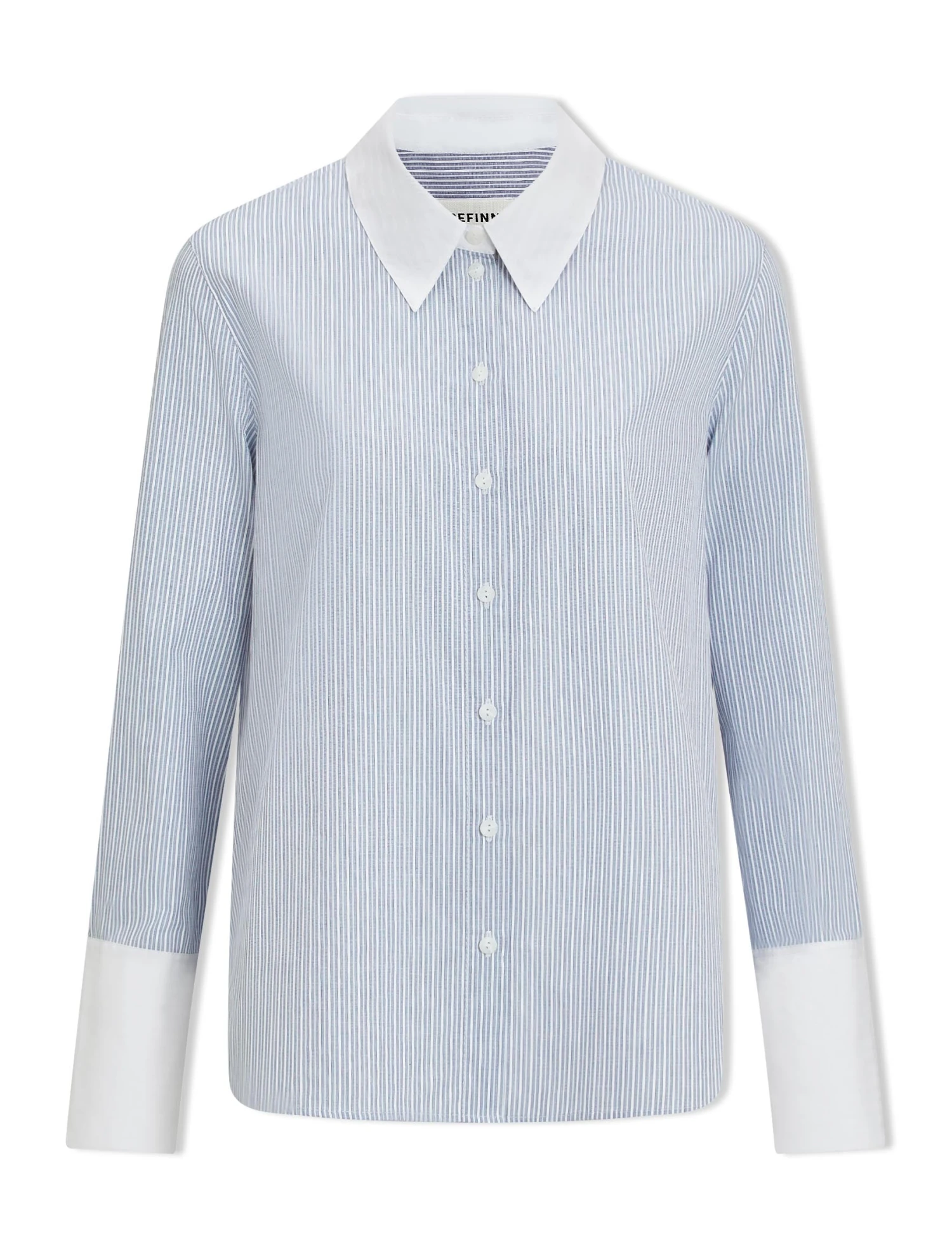 Who doesn’t love a striped mannish shirt? Shaking off any corporate connotations, our new organic cotton shirting has a luxe feel and crisp handle. Seymour’s jacquard stripe, contrasting collar and oversize turn-up cuffs add a contemporary twist to the classic shirt. Wear done-up with denim or wide-leg trouser, or partially undone with a vest and tailoring.