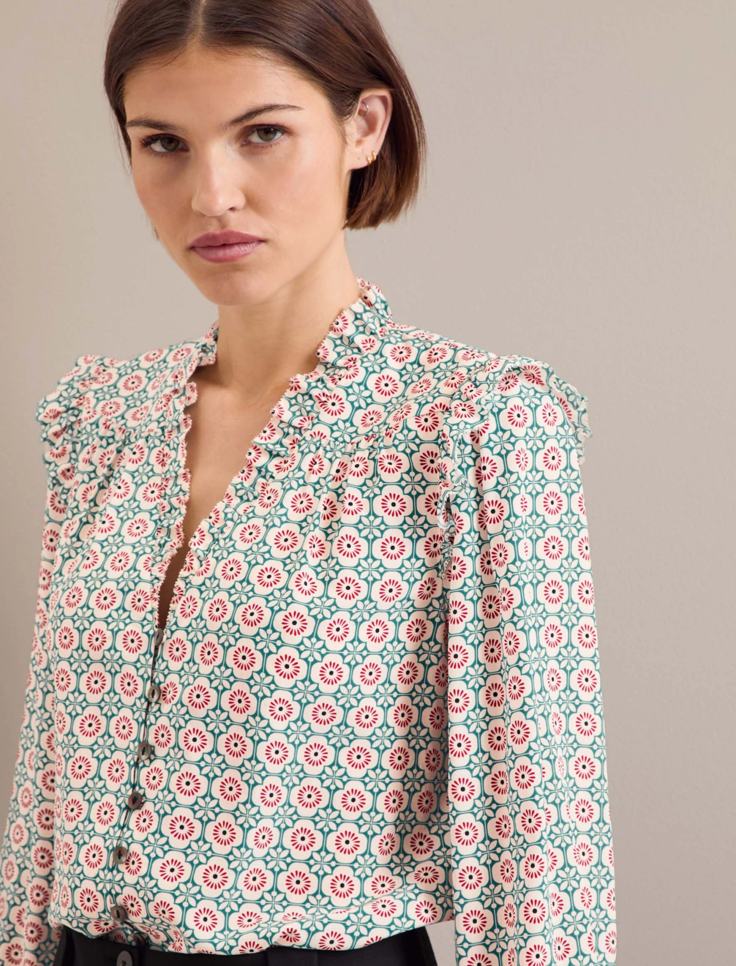 Effortlessly sexy, our hero Stella silk shirt features feminine ruffles, rouleaux summarys, shirred cuffs and luxurious eyelash detailing giving it desk-to-dinner versatility. This season there are two new exclusive prints to choose from: a chic polka dot that pairs perfectly with black tailored trousers and gold jewellery, or a vintage-inspired graphic floral that looks particularly pretty with jeans.
