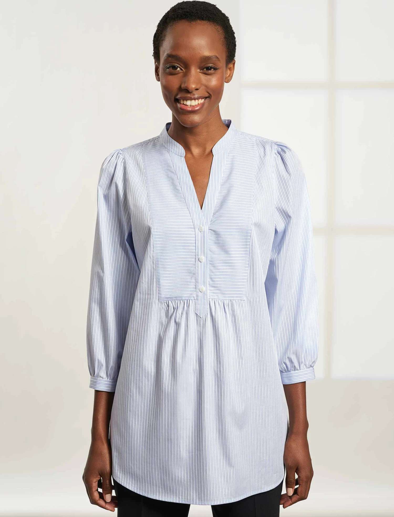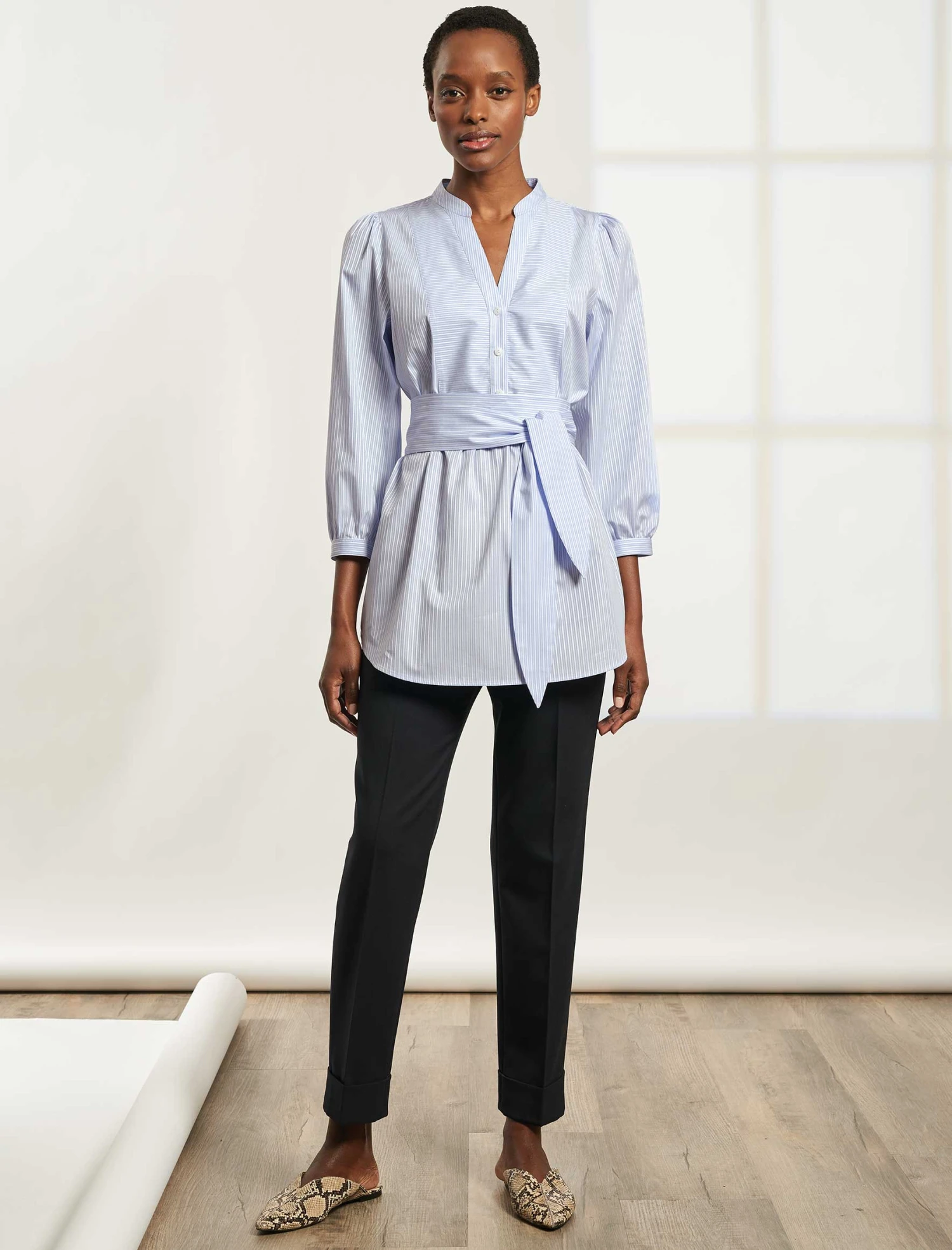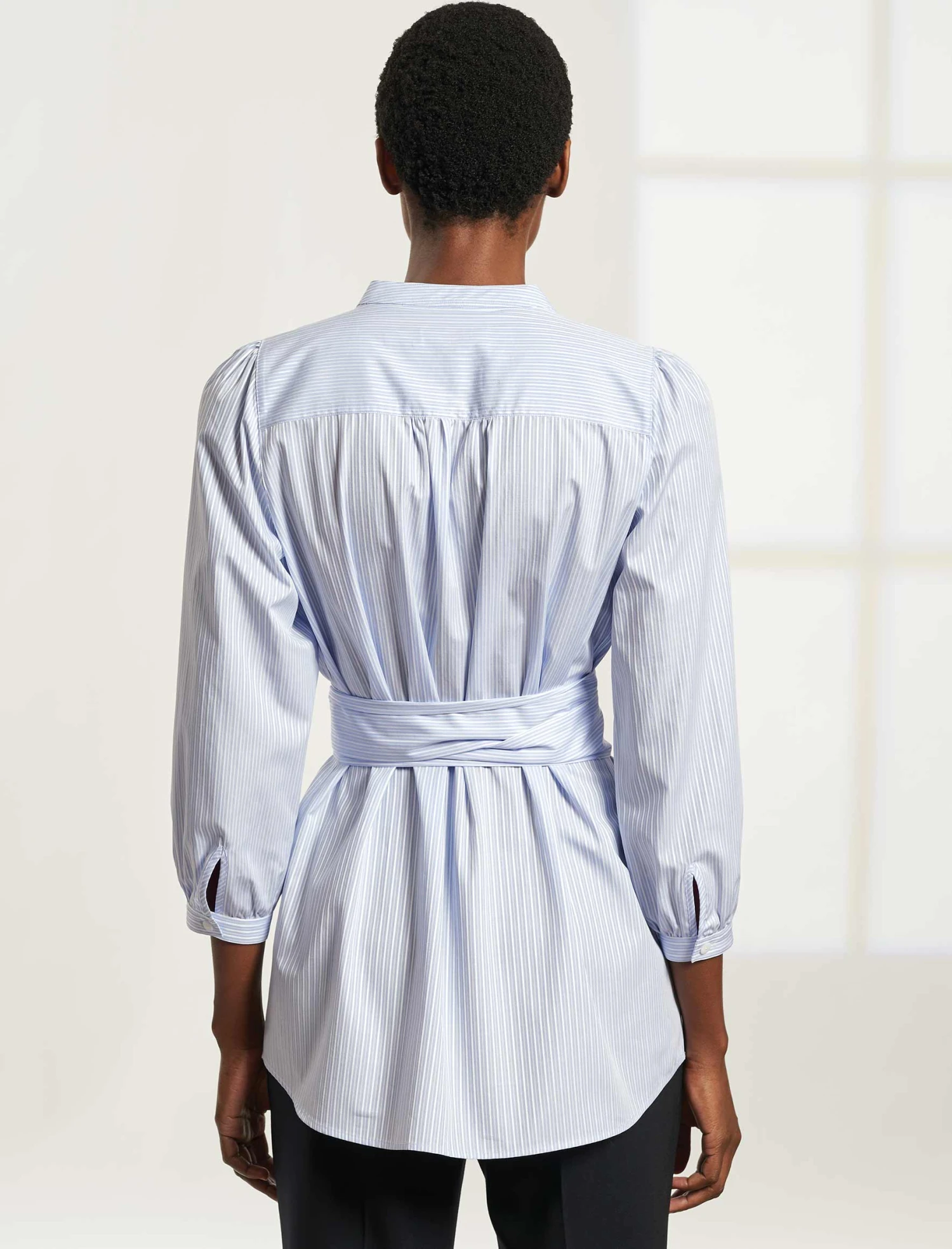 The Stevie is our latest shirt launch – a relaxed, longer tunic style designed with our uber flattering signature V-neckline, a boyish tailored front and feminine gathering at the shoulder and bracelet cuff. Woven in a lightweight, jacquard stripe cotton that looks and feels super-luxe, the Stevie is destined to be your chicest summer staple. Wear un-belted for easy days over jeans, or tie at the waist with the removable sash over our signature tailored trousers for a strong and pulled together silhouette.