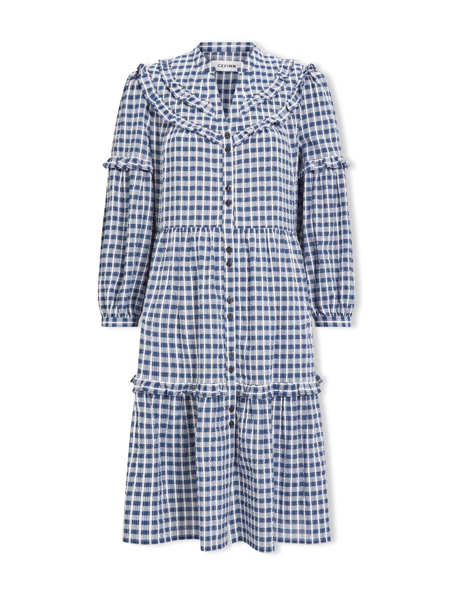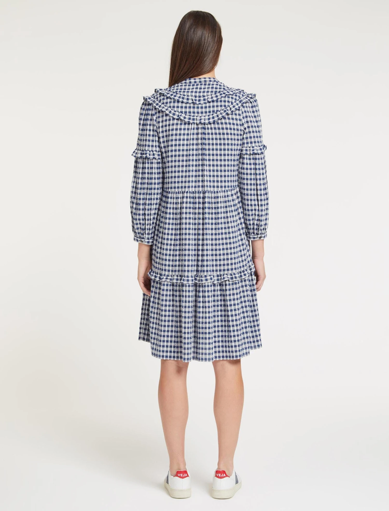 Made from a cool organic-cotton-blend seersucker fabric in a fresh check print, our Suki dress will make a light and airy addition to your wardrobe. The pretty ruffle detailing, side pockets, drawstring waist and blouson sleeves elevate this versatile style from simple to stylish. A carefree option for holidays or downtime days, just add a trainer or sandal and an oversize bag and you’re good to go.