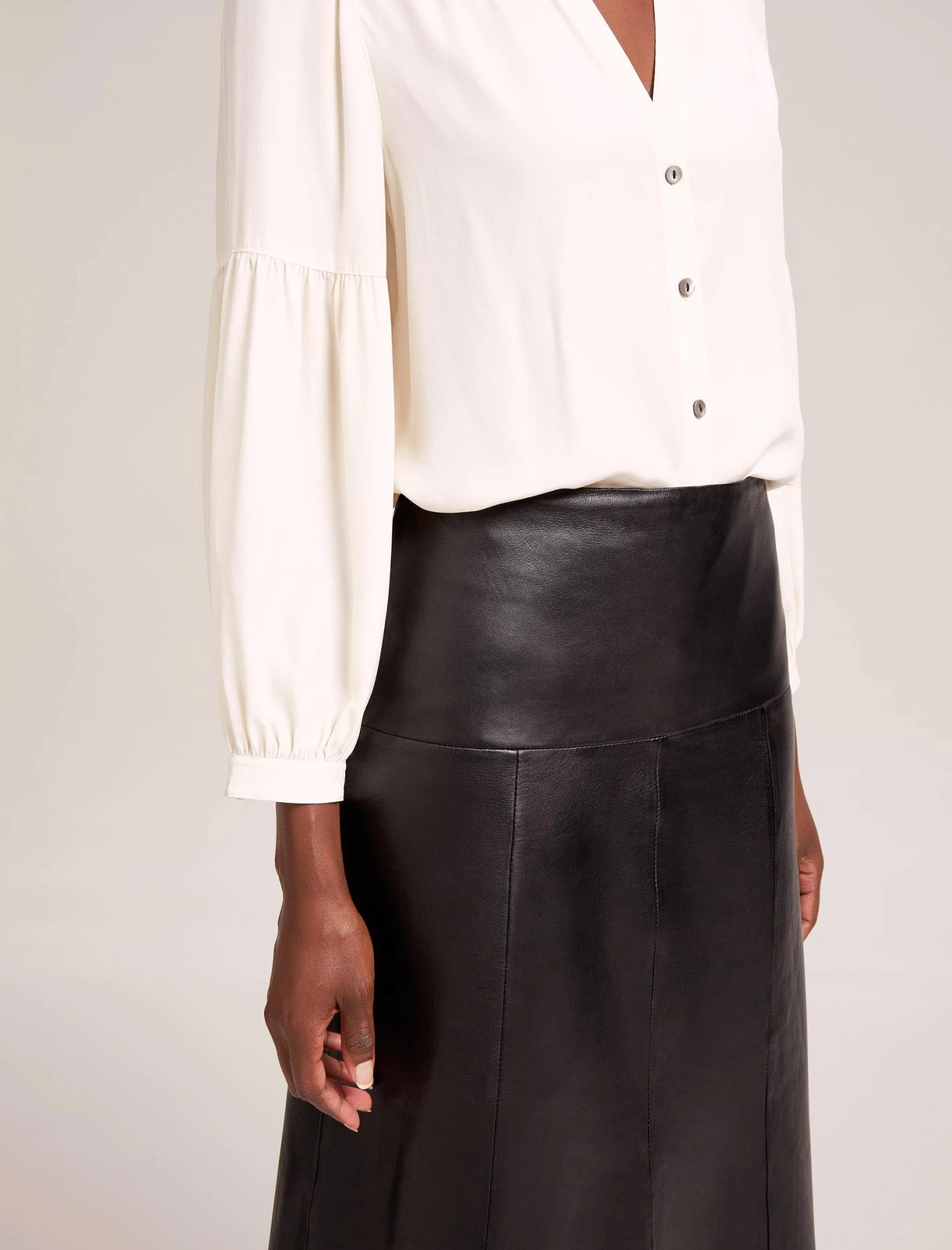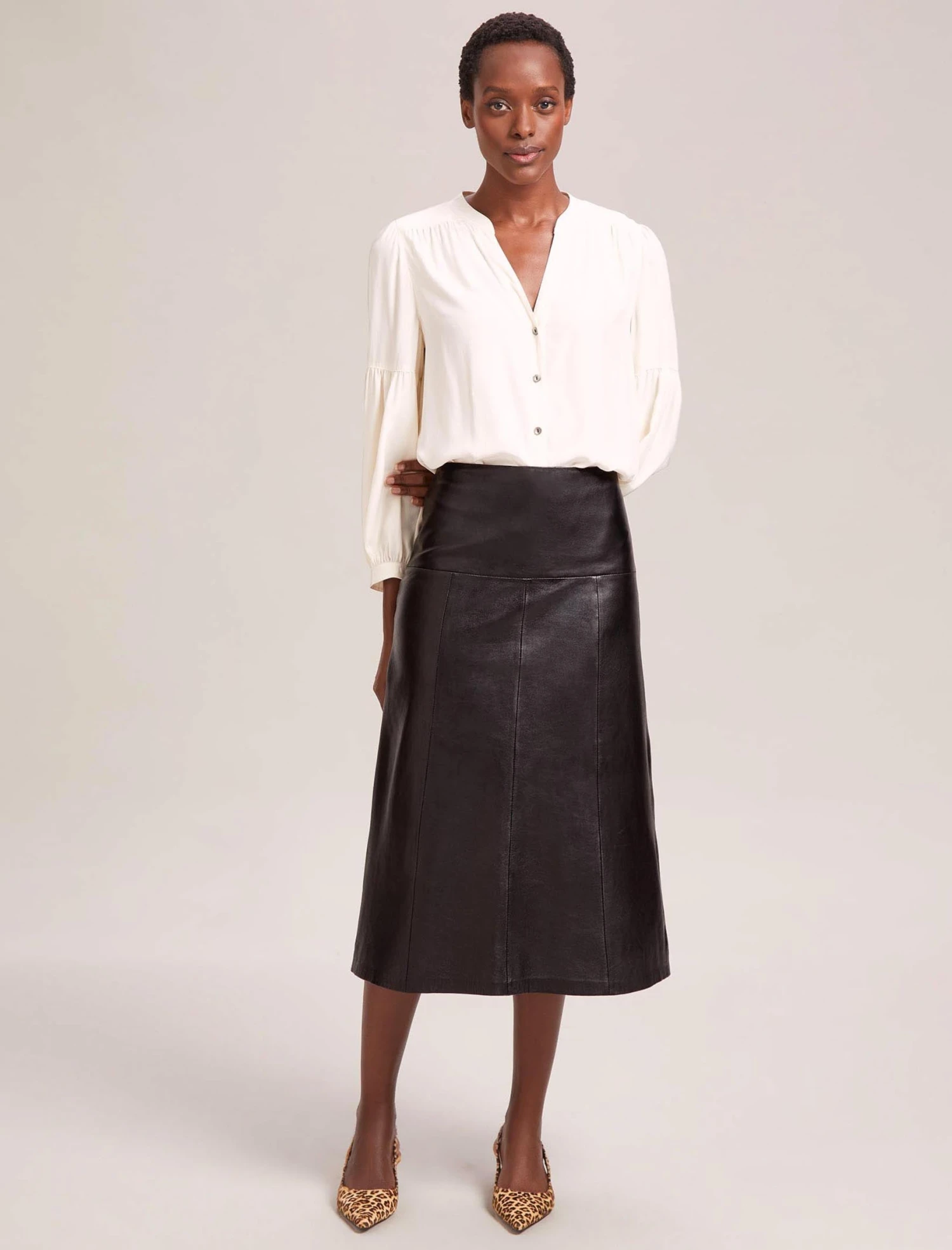 Classic, sleek and perennially stylish, our panelled butter-soft Tiana leather skirt will be one of the most versatile pieces in your wardrobe this season. Paired with a crisp white blouse or our Stella silk shirt and a sharp boot or point, it makes 9-5 dressing a breeze. Play to its rebellious side on downtime days with a box-fresh trainer, a vintage rock tee and undone hair.