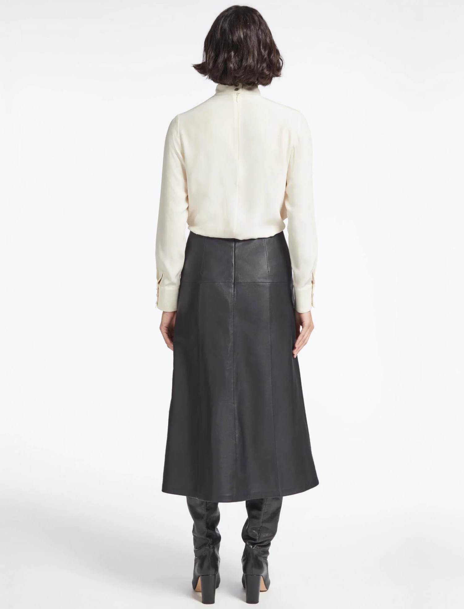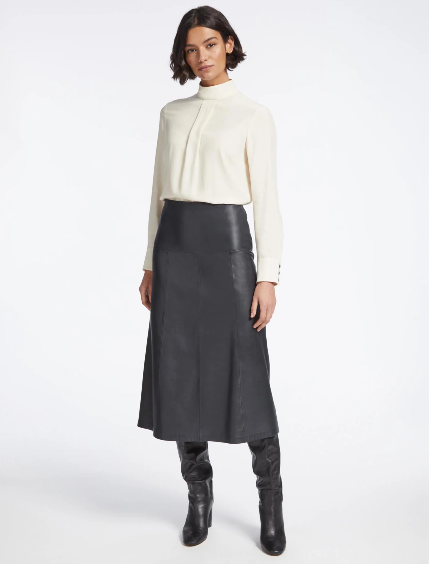 Classic, sleek and perennially stylish, our panelled butter-soft Tiana leather skirt will be one of the most versatile pieces in your wardrobe this season. Paired with a crisp white shirt or our silk Riley blouse and a sharp boot or point, it makes 9-5 dressing a breeze. Play to its rebellious side on downtime days with a box-fresh trainer, a vintage rock tee and undone hair.