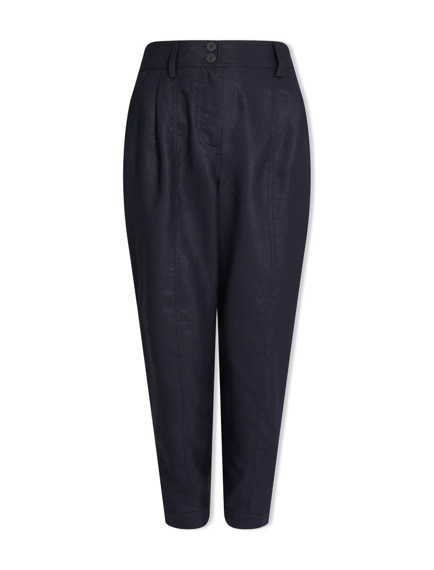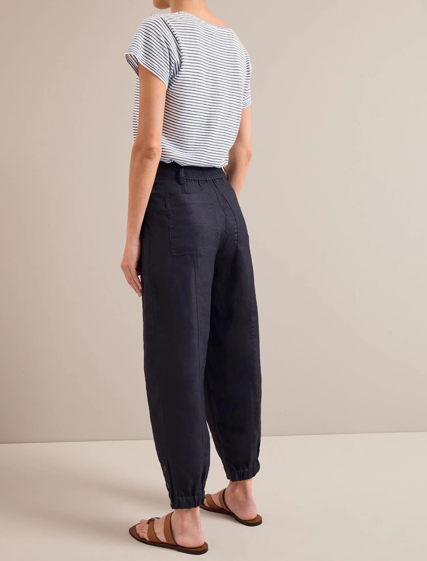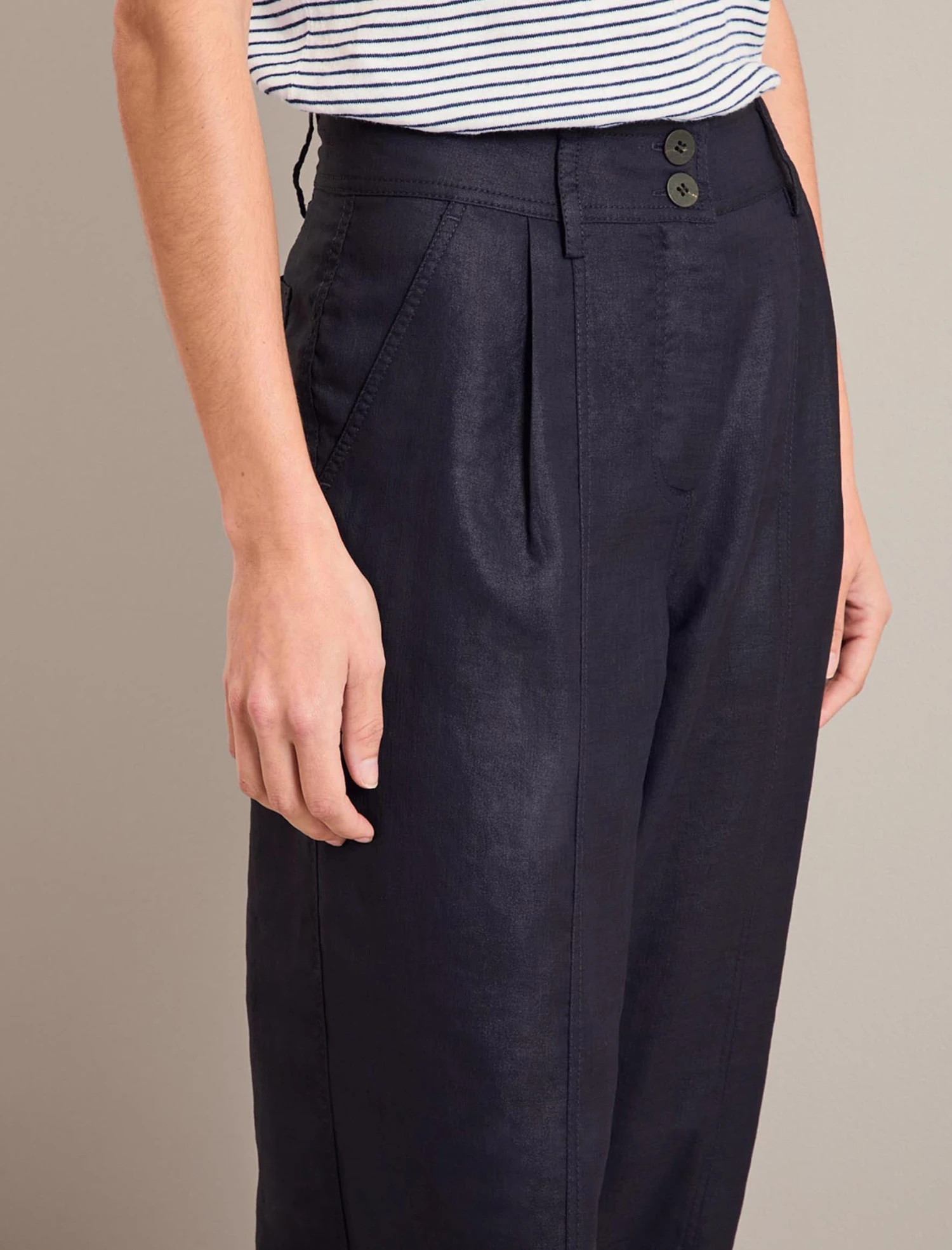 A high-waisted, pleated trouser is a smart addition to your wardrobe and the Tyson brings practicality to boot. Designed in our innovative Techni-Linen fabric, the barrel leg will hold its shape and look as good at the end of the day as the start. A shirred elasticated back waistband makes it comfortable for everyday wear, while the ankle-length summaryed cuff opens footwear options – a heel, loafer, sandal or trainer all work.