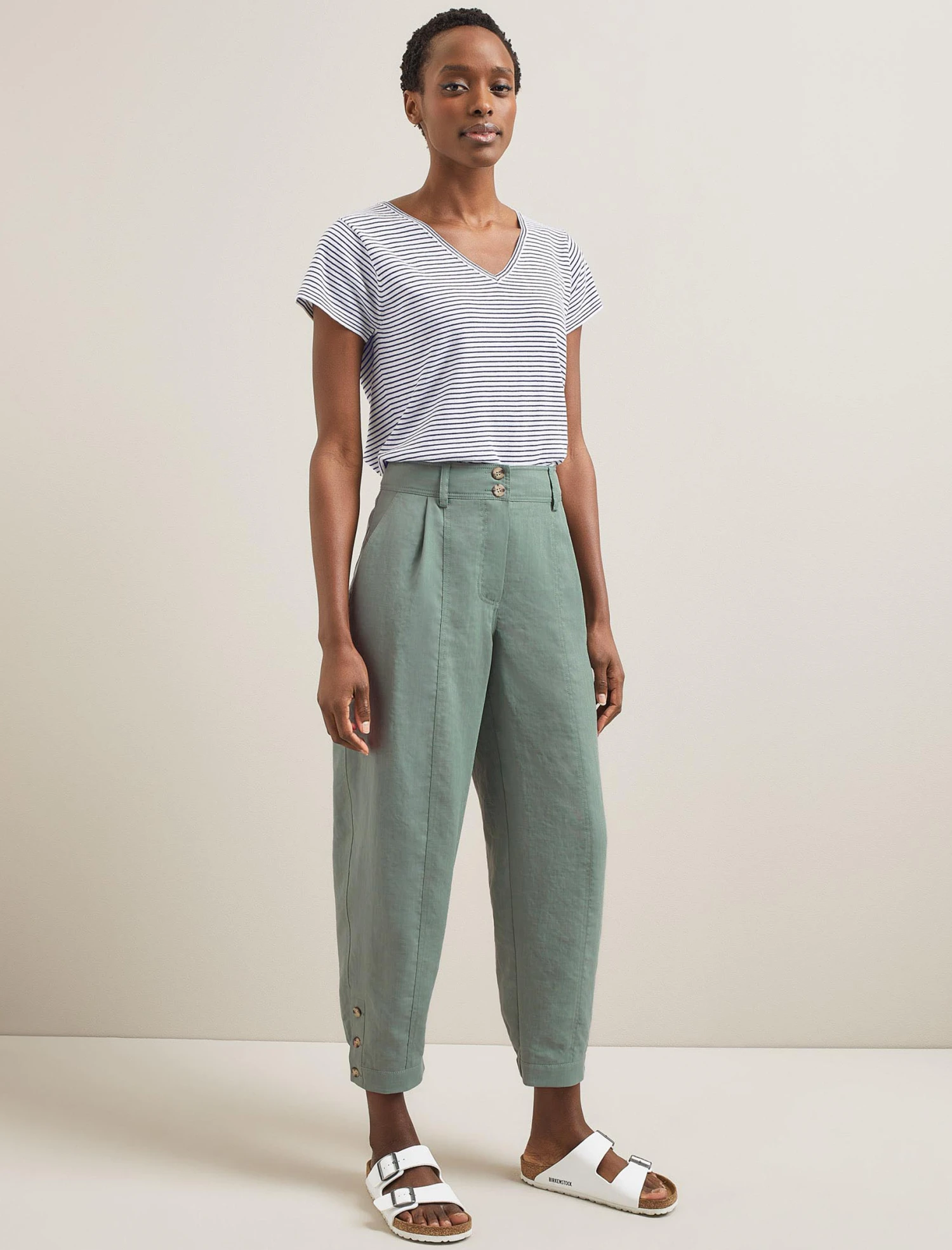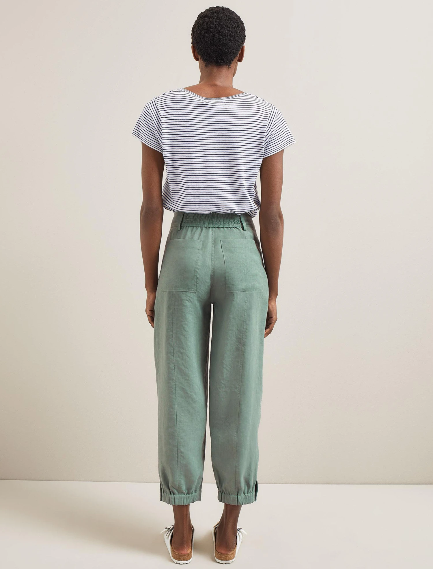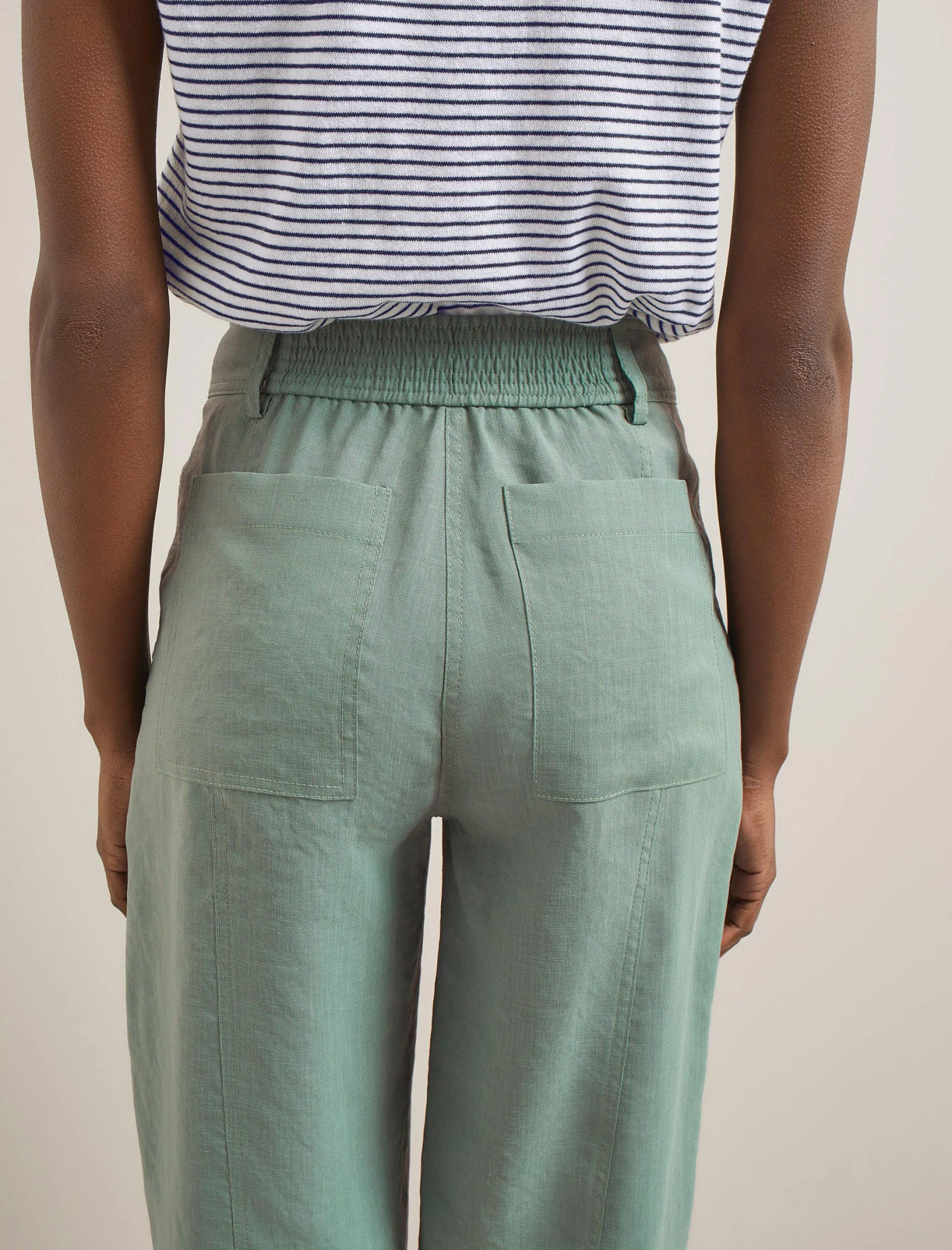 A high-waisted, pleated trouser is a smart addition to your wardrobe and the Tyson brings practicality to boot. Designed in our innovative Techni-Linen fabric, the barrel leg will hold its shape and look as good at the end of the day as the start. A shirred elasticated back waistband makes it comfortable for everyday wear, while the ankle-length summaryed cuff opens footwear options – a heel, loafer, sandal or trainer all work.